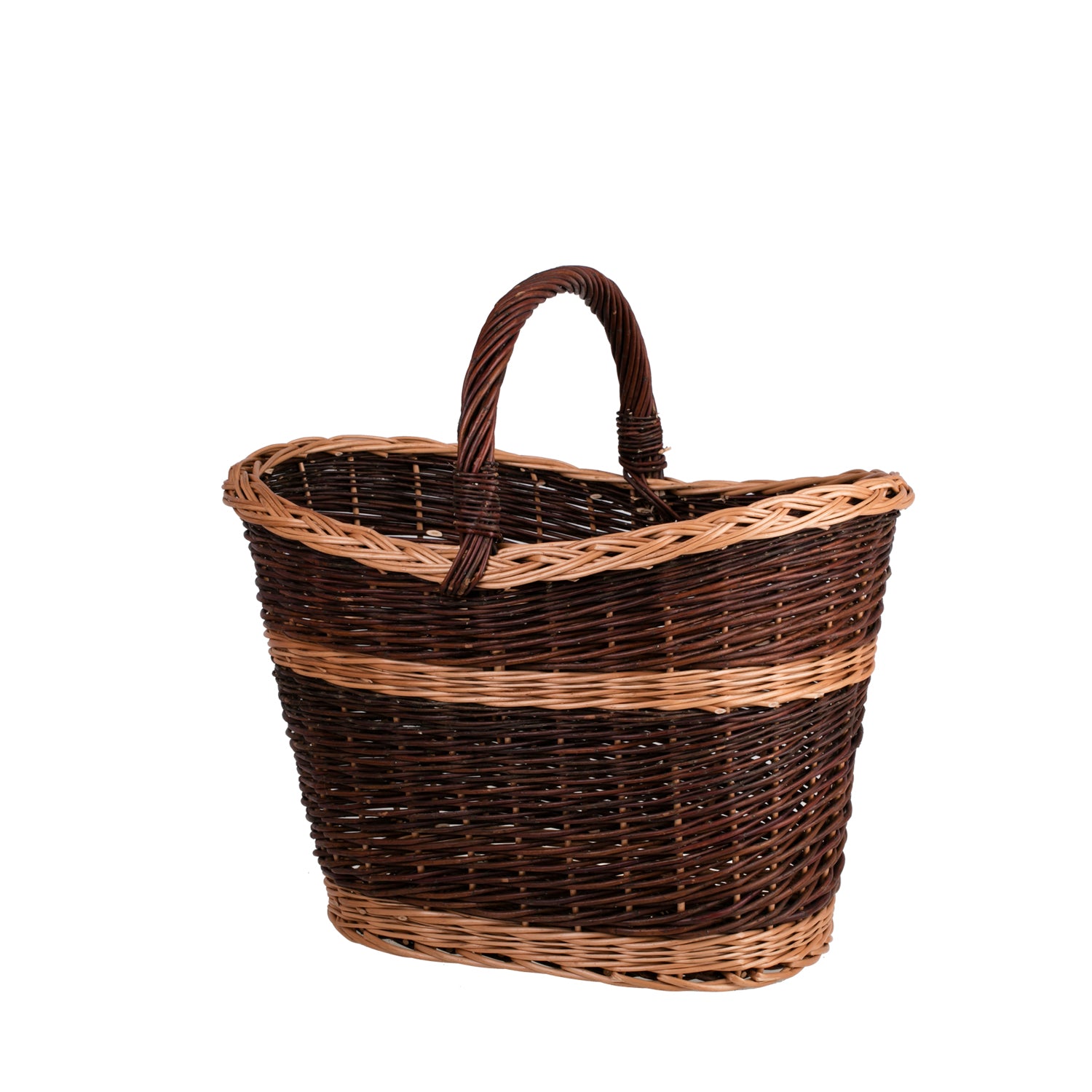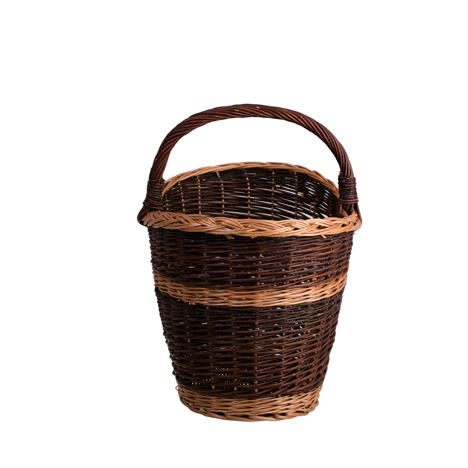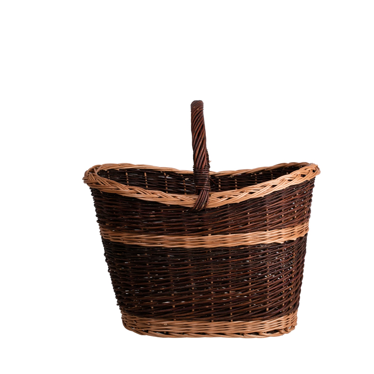 Klasyczny, pojemny kosz na drewno z nieokorowanej wikliny przyciąga naturalną barwą. Ciemne tonacje przeplatają się z jaśniejszymi pasami, podkreślając dekoracyjny charakter plecionki. Stabilny, pojedynczy uchwyt jest grubo opleciony i wygodnie leży w dłoni. Górna krawędź ma estetyczny, skręcany rant, a regularny, mocny splot zapewnia trwałość oraz przewiewność obudowy.