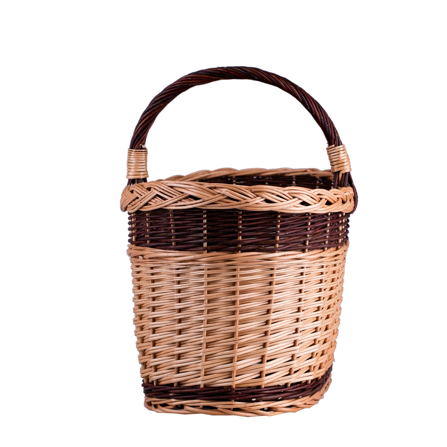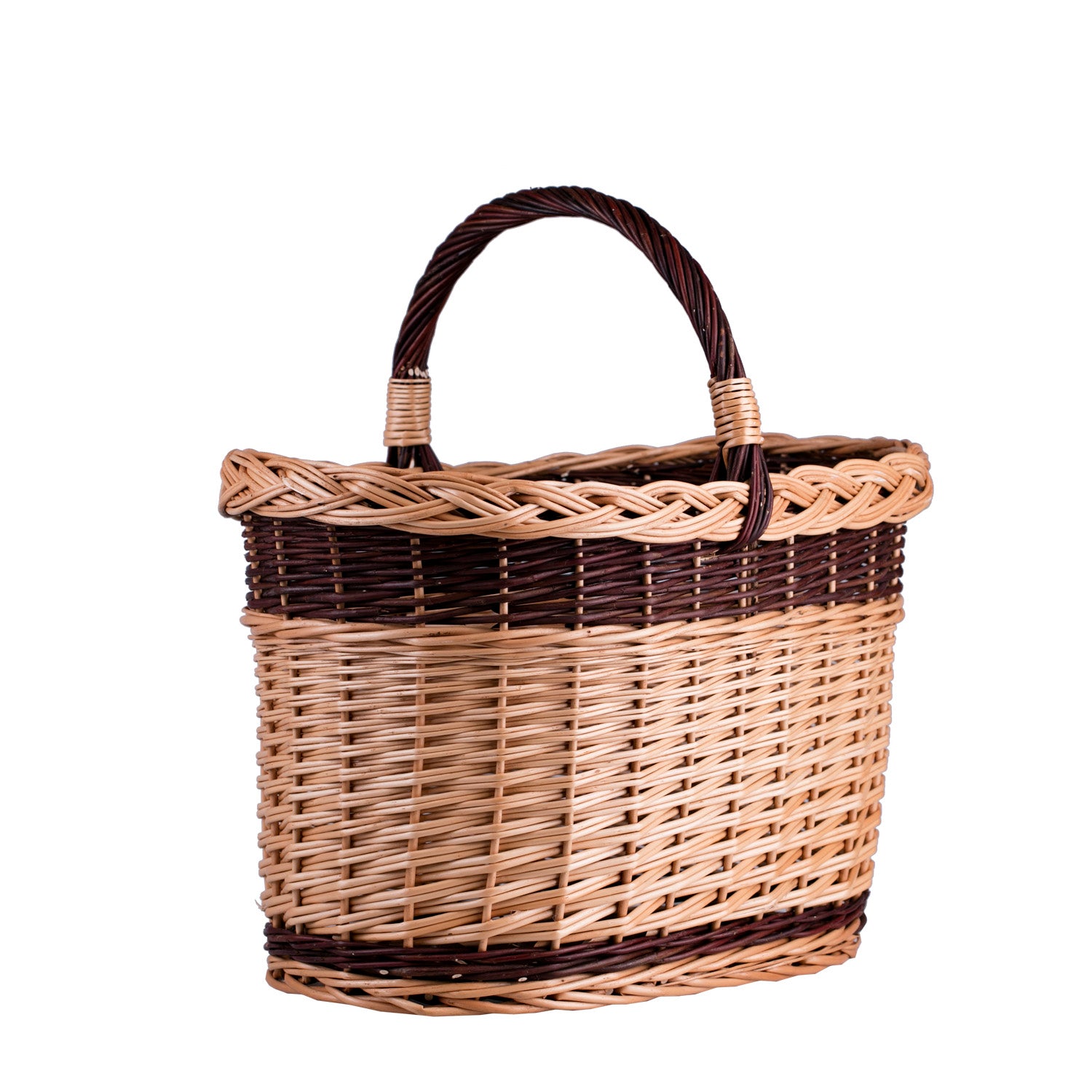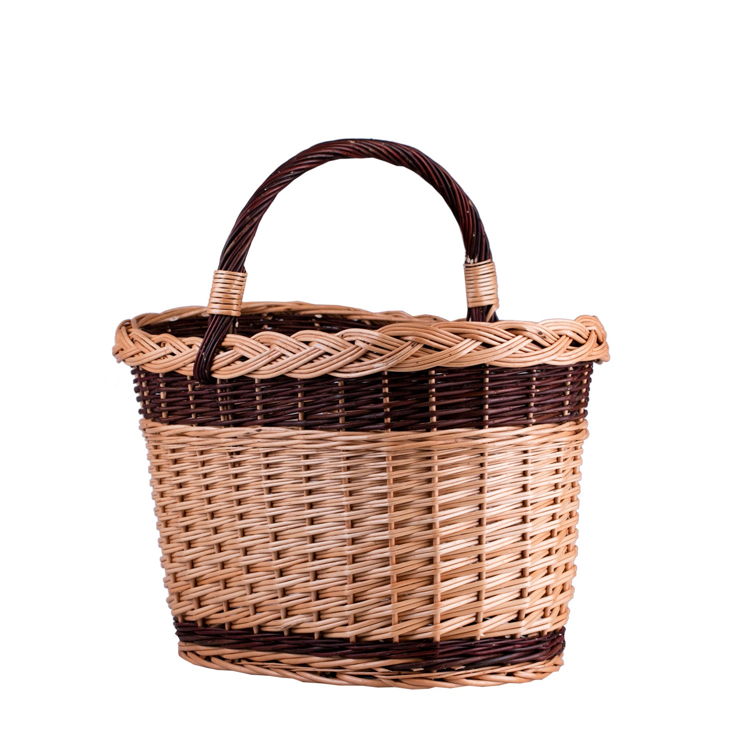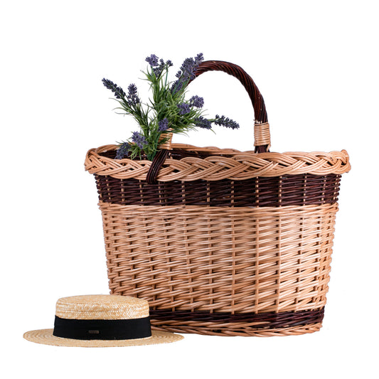 Klasyczny, pojemny kosz wiklinowy o lekko owalnej bryle zachwyca dwukolorowym splotem: jasna wiklina łączy się z ciemniejszymi pasami, tworząc elegancki kontrast. Górny rant zdobi misternie pleciony warkocz, który jednocześnie usztywnia krawędź. Solidna, skręcana rączka z oplotem zapewnia pewny chwyt, a równy splot ścianek i dna gwarantuje stabilność przy większym obciążeniu.