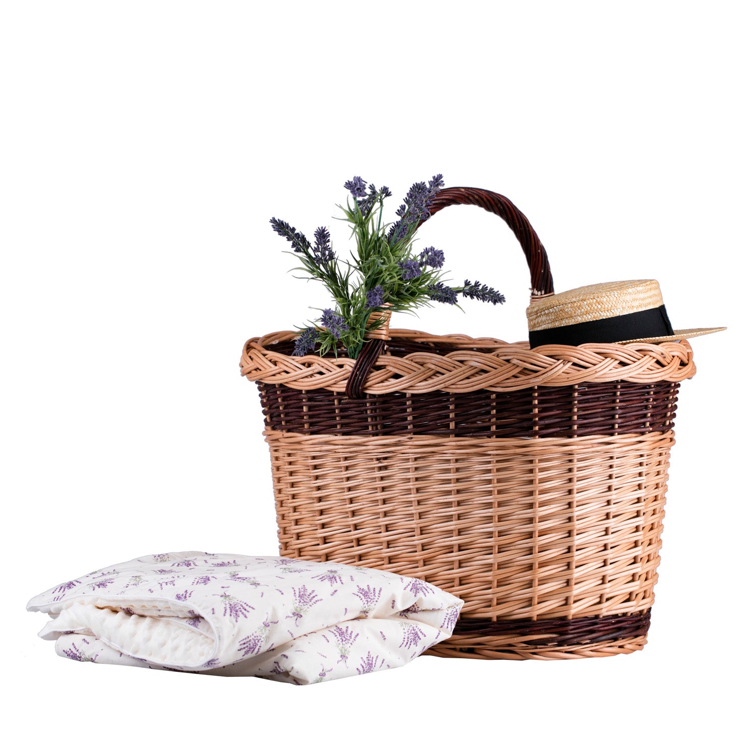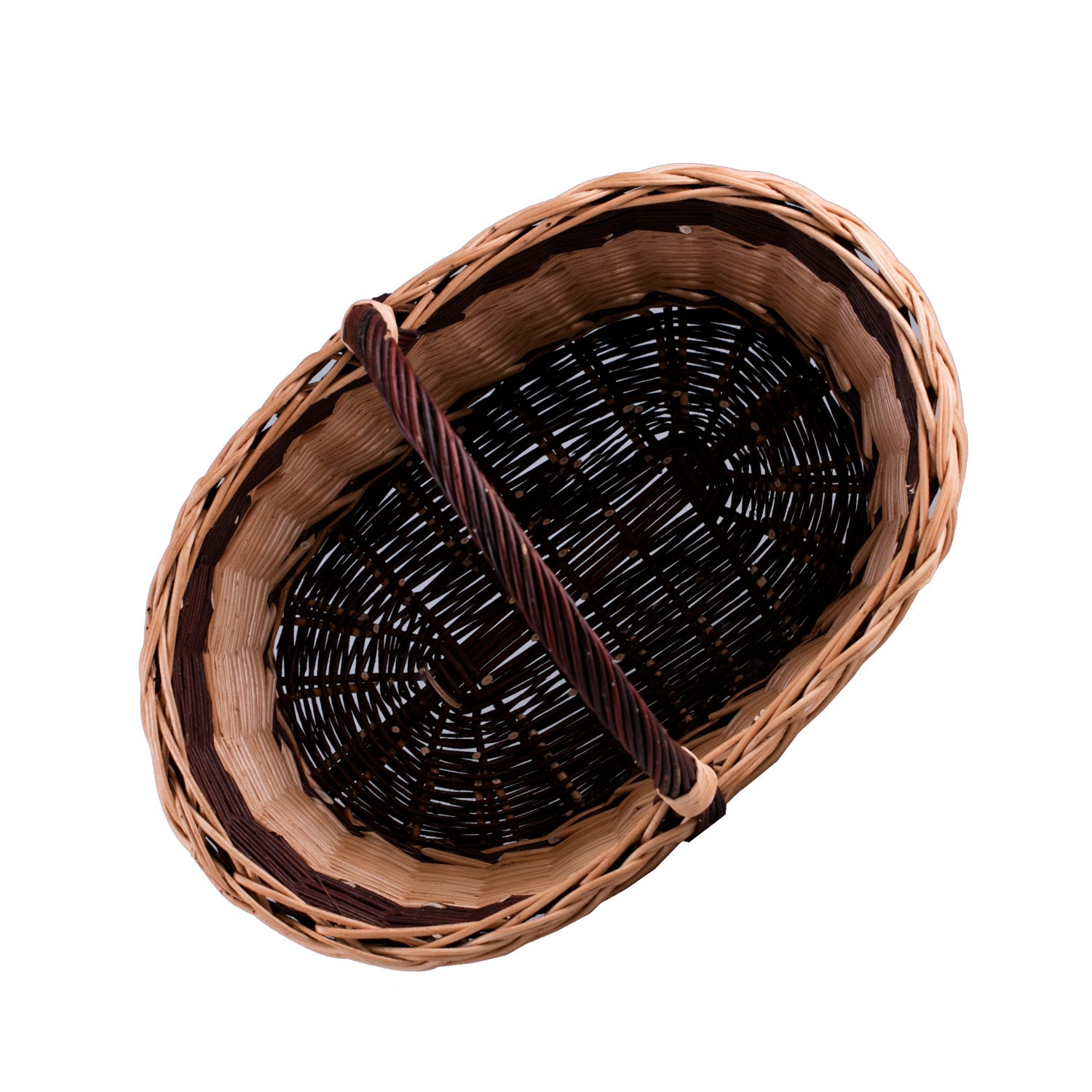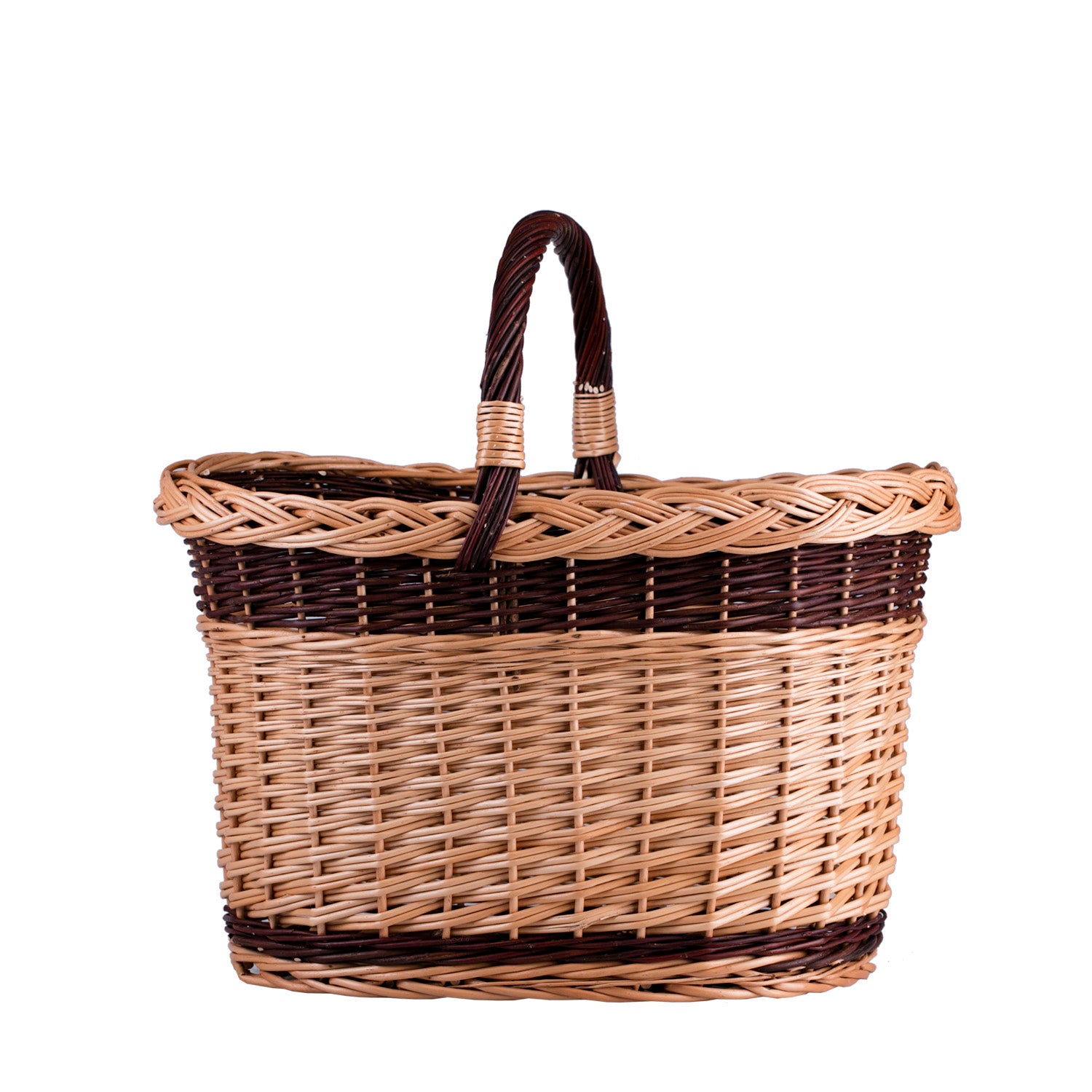 Klasyczny, pojemny kosz wiklinowy o lekko owalnej bryle zachwyca dwukolorowym splotem: jasna wiklina łączy się z ciemniejszymi pasami, tworząc elegancki kontrast. Górny rant zdobi misternie pleciony warkocz, który jednocześnie usztywnia krawędź. Solidna, skręcana rączka z oplotem zapewnia pewny chwyt, a równy splot ścianek i dna gwarantuje stabilność przy większym obciążeniu.