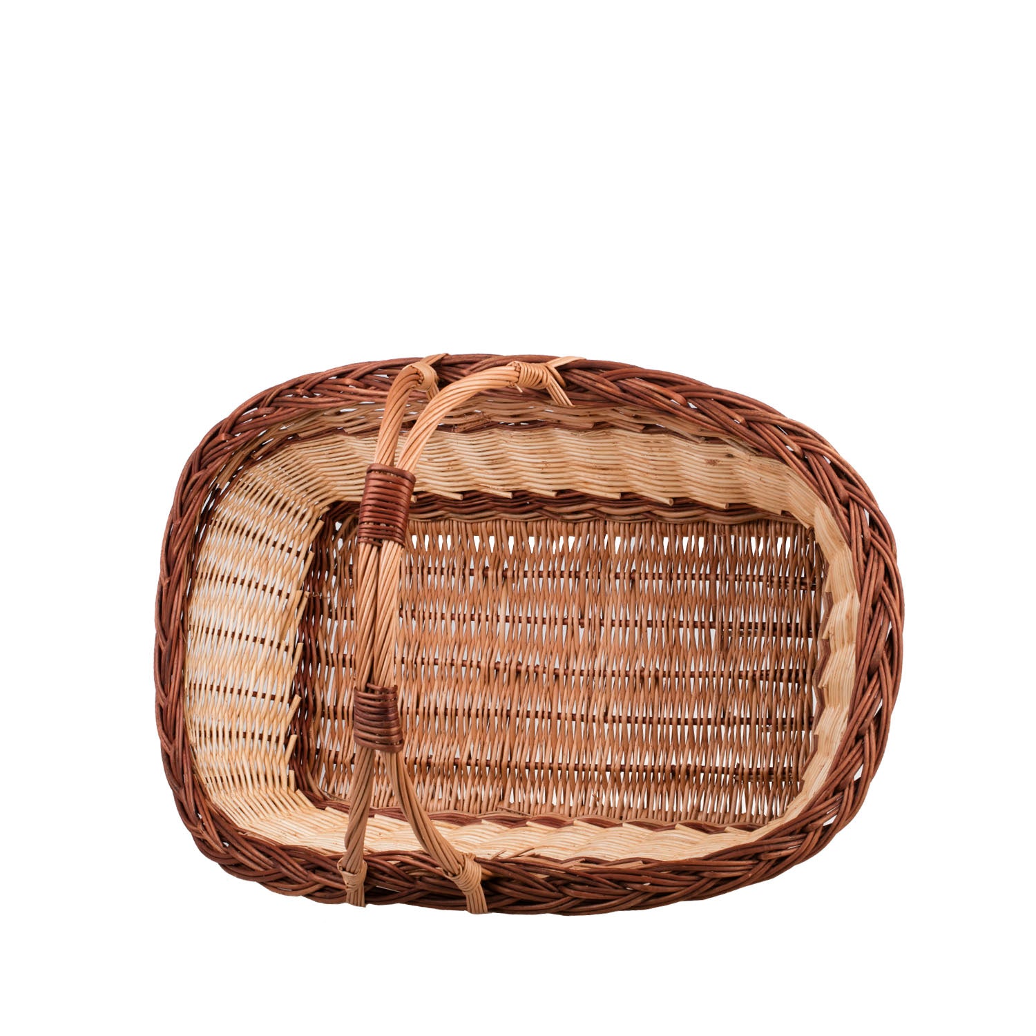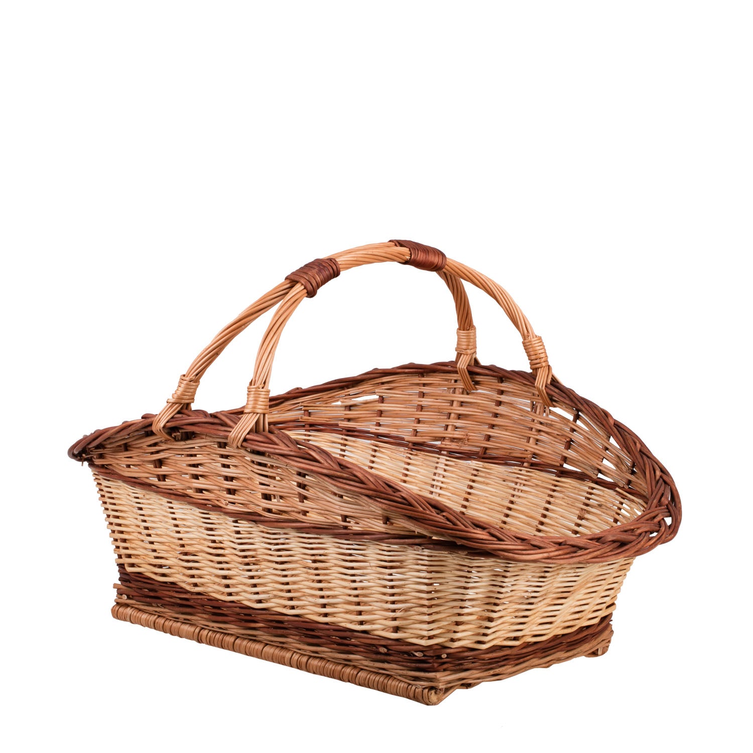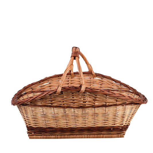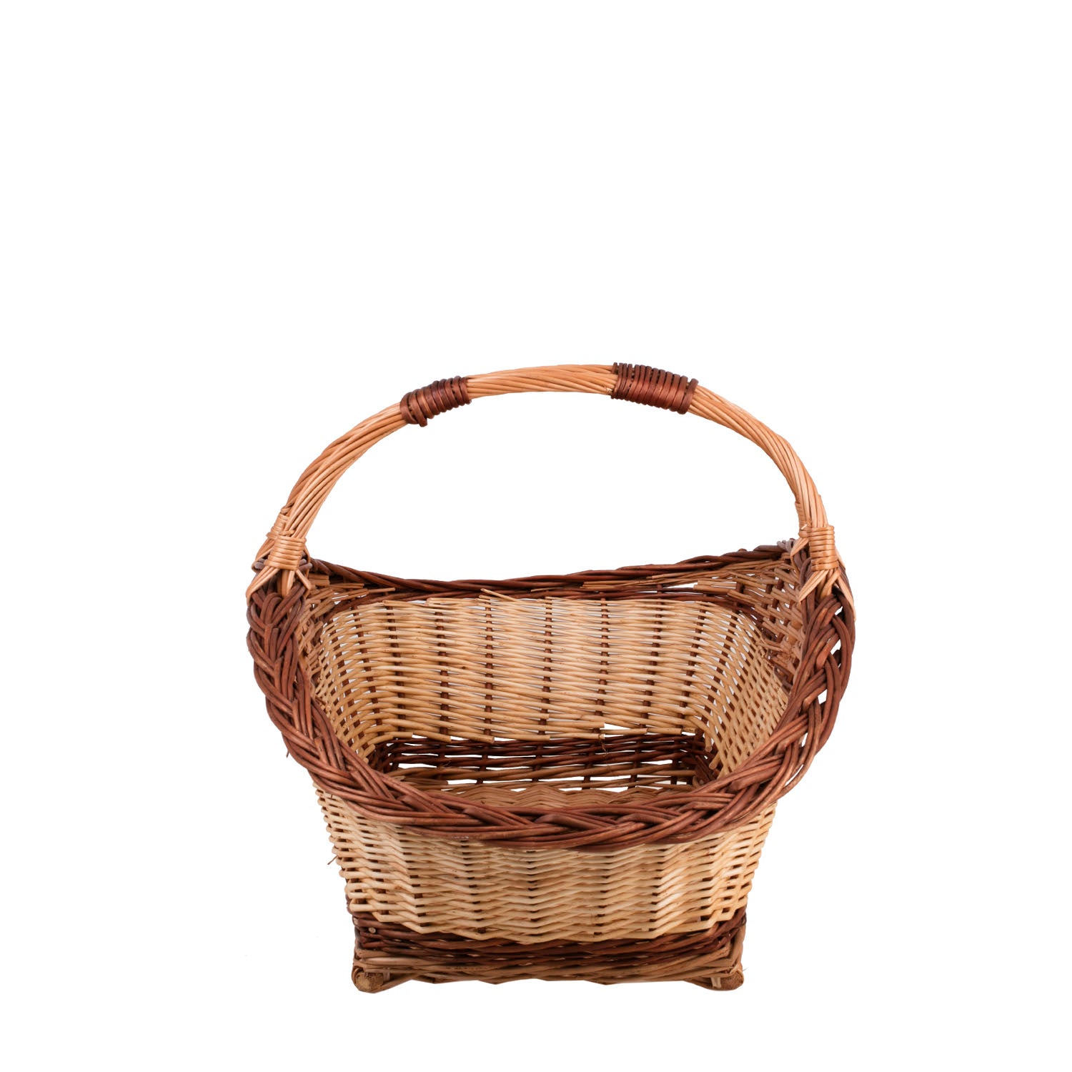 Prostokątny kosz na drewno o szerokiej podstawie i elegancko unoszących się ściankach przyciąga wzrok klasyczną formą. Nad korpusem wznosi się wyprofilowana, podwójna rączka, mocno spleciona i pewna w chwycie. Rant wykończony warkoczem oraz wzmocniona dolna listwa dodają stabilności. Dwubarwny splot wikliny tworzy subtelne, dekoracyjne pasy, które wnoszą do wnętrza ciepło natury.