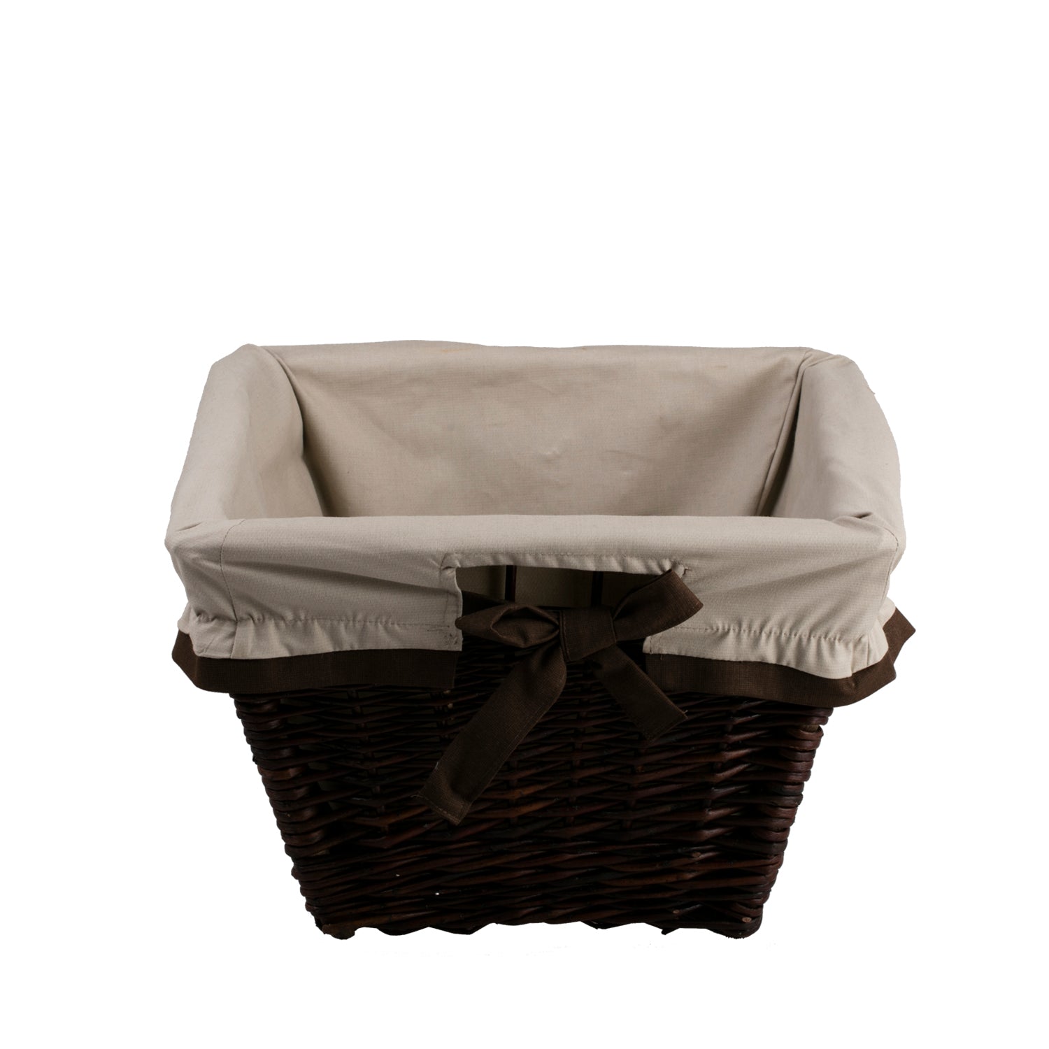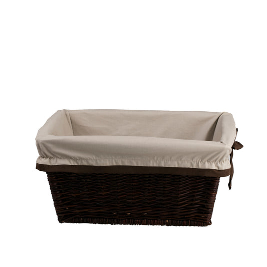 Prostokątny kosz wiklinowy w szlachetnym, ciemnobrązowym odcieniu zachwyca starannym, gęstym splotem i minimalistyczną linią. Solidnie wypleciony rant zwiększa sztywność, a zintegrowane uchwyty ułatwiają przenoszenie. Wnętrze wyłożono materiałowym obszyciem w kolorze kremowym, z ciemną lamówką i eleganckimi wiązaniami. Krawędzie są równo wykończone, a plecionka ma delikatny, naturalny połysk. Obszycie jest zdejmowane i nadaje się do prania w pralce w 30°C.