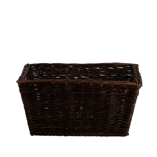 To wiklinowy kosz na drewno kominkowe, który przyciąga wzrok eleganckim, ciemnobrązowym wykończeniem o naturalnym połysku. Jego czysta linia i gęsty, falujący splot z widoczną korą podkreślają autentyczność materiału. Wzmocniona krawędź zwiększa stabilność, a zintegrowane, solidne uchwyty ułatwiają wygodne podnoszenie i ustawianie przy kominku. Kosz stanowi dekoracyjny akcent w salonie.