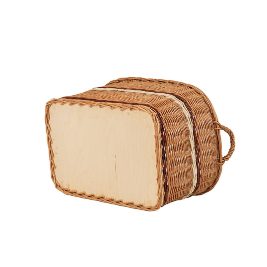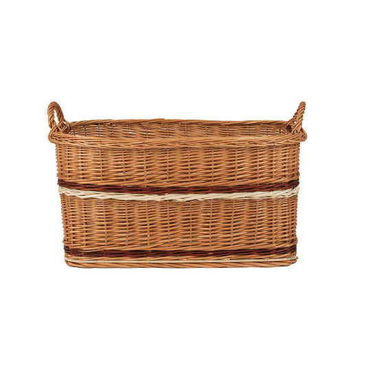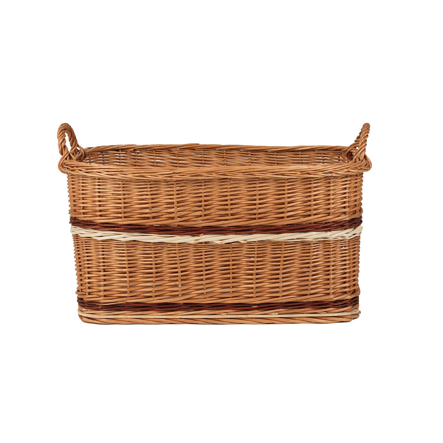 Prostokątny kosz z pełnej wikliny łączy prostotę i solidność. Wysokie, równomiernie plecione ścianki oraz stabilne dno tworzą pojemne wnętrze na drewno kominkowe. Dwa mocne uchwyty typu ucho, skręcane z grubych prętów, gwarantują pewny chwyt. Ozdobne pasy w jaśniejszych i ciemniejszych odcieniach podkreślają rękodzielniczy charakter, a gładka krawędź wygląda estetycznie.