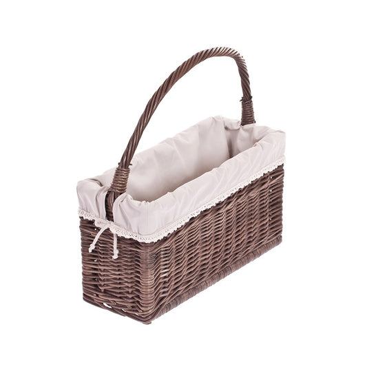 Ten ręcznie pleciony, ekologiczny kosz wiklinowy z rączką o wymiarach 45x18 cm i wysokości 23/41 cm to połączenie funkcjonalności, elegancji i tradycyjnego rzemiosła europejskiego. Wykonany z naturalnej wikliny, malowanej na brązowo, zachwyca klasycznym wyglądem i trwałością, stając się nie tylko praktycznym, ale również dekoracyjnym elementem wnętrza. Doskonale sprawdzi się jako organizer na czasopisma, gazety, książki czy drobne akcesoria w salonie, biurze lub kąciku czytelniczym.