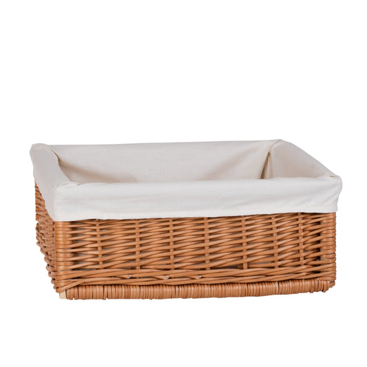 Elegancki, naturalny wygląd. Kosz wiklinowy o niskim, prostokątnym profilu pięknie eksponuje zawartość na stole. Ciepły, miodowy splot harmonizuje z wnętrzami, a kremowe, miękkie, bawełniane obszycie z szerokim podwinięciem tworzy subtelną ramę. Pełne dno i równy wyplata zapewniają stabilność, a gładki rant jest przyjemny w dotyku. Subtelna fala przy spodzie nadaje mu lekkości i charakteru.