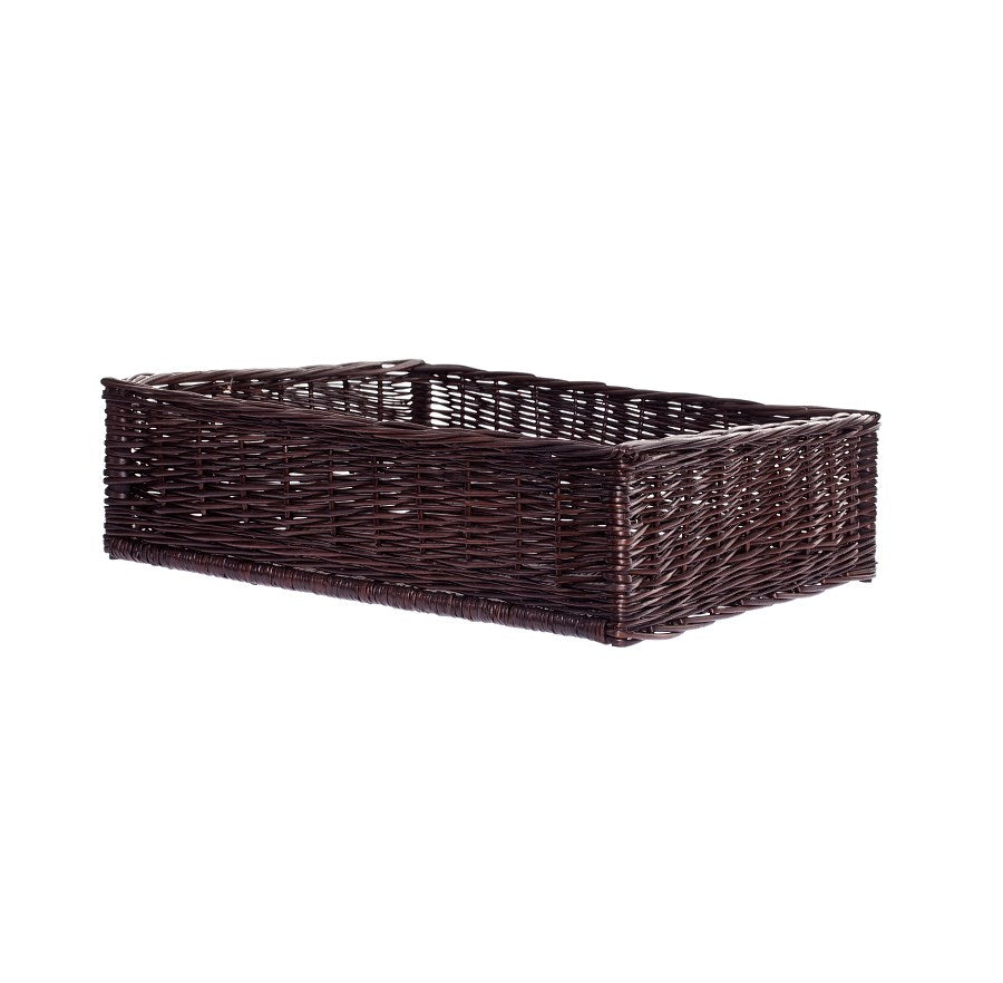 Prostokątny kosz ekspozycyjny z naturalnej wikliny zachwyca głębokim, ciemnobrązowym odcieniem wenge, który elegancko podkreśla prezentowane produkty. Niskie ścianki o wysokości ok. 12 cm zapewniają wygodny dostęp do zawartości, a starannie wyprowadzony rant usztywnia całość. Gęstszy splot przy krawędziach i delikatnie ażurowe boki tworzą lekką formę bez uchwytów i obszycia. Subtelny połysk włókien oraz dodatkowy oplot na krawędziach podnosi estetykę i trwałość.