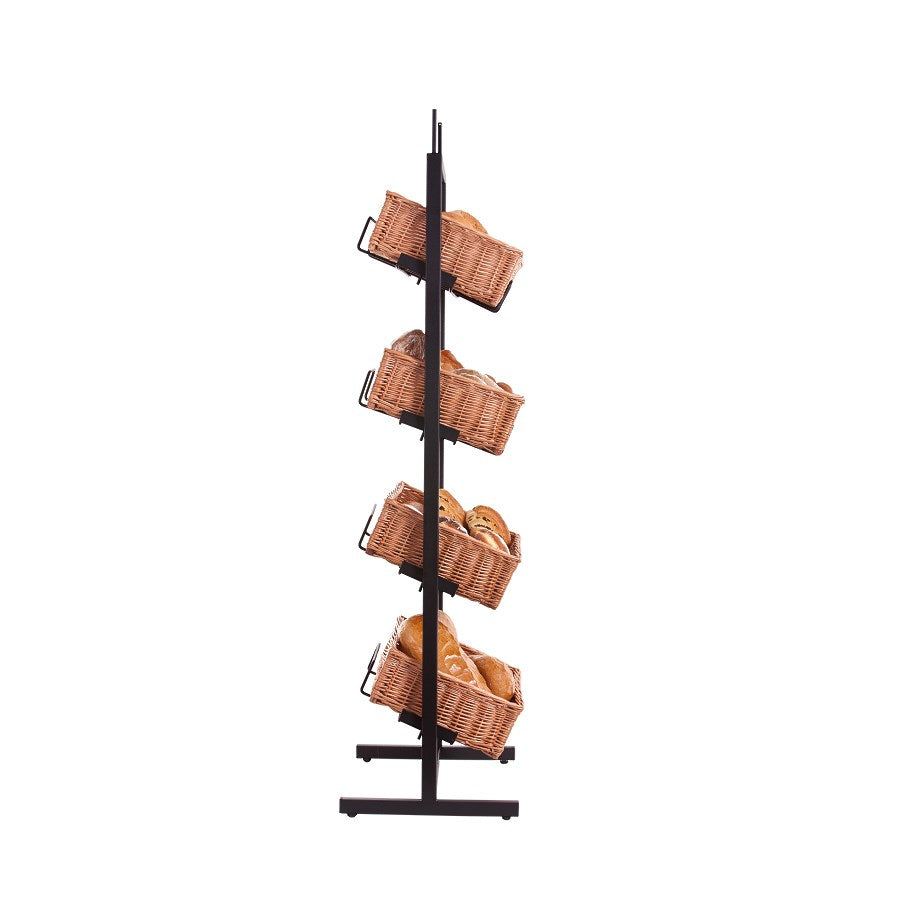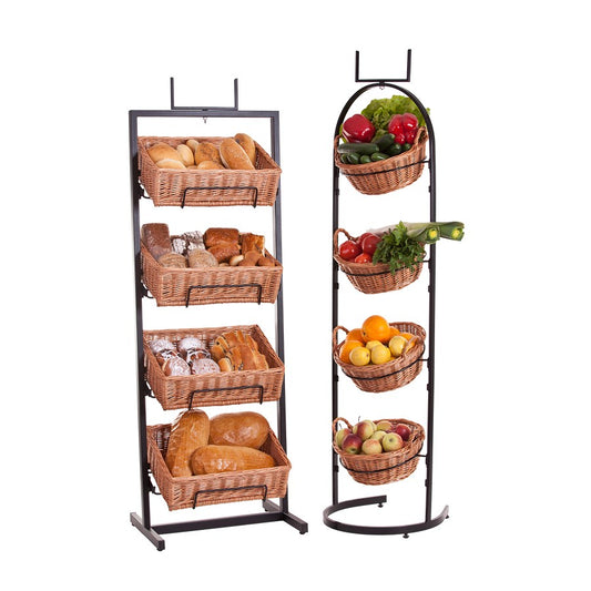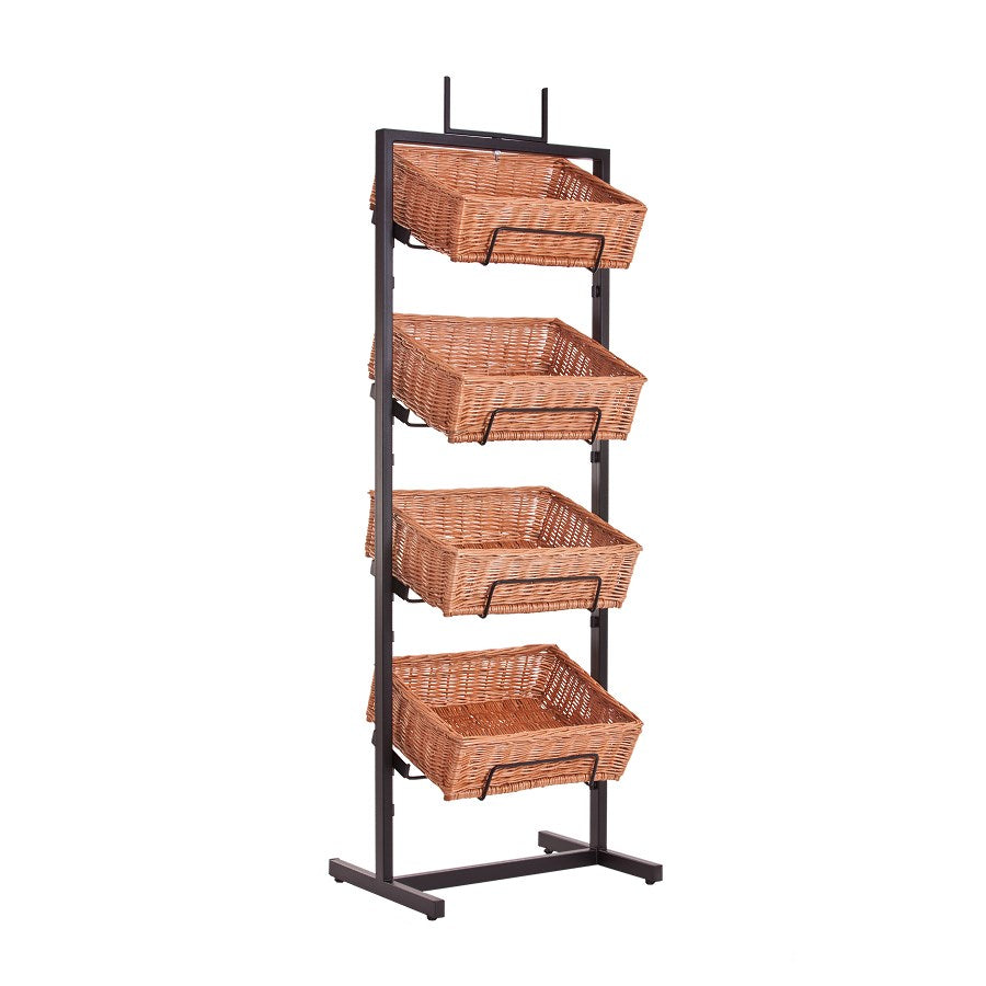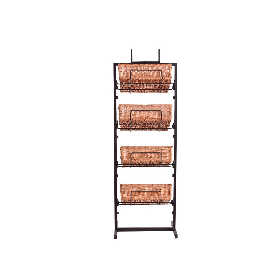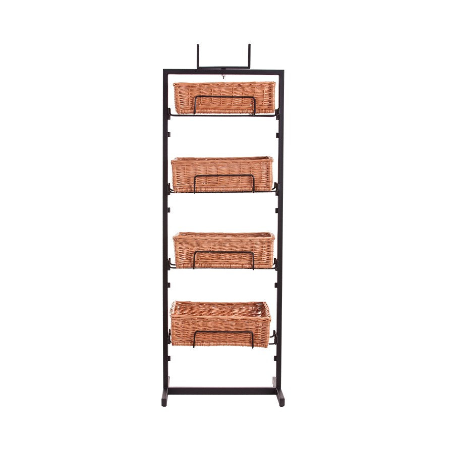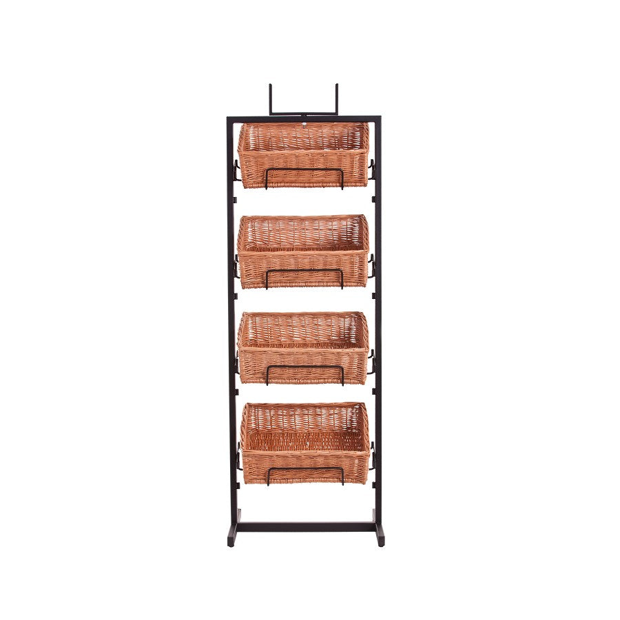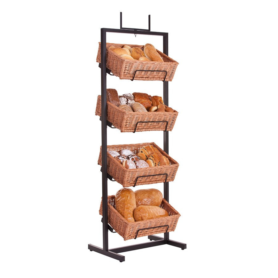 Wymiary umożliwiają wygodne ustawienie go w dowolnym miejscu lokalu. Każdy z koszy pozwala na przechowywanie i prezentację różnorodnych produktów – od pieczywa i warzyw po drobne akcesoria czy produkty sezonowe. Kosze można łatwo wyjmować i przenosić, co ułatwia utrzymanie porządku w miejscu sprzedaży.