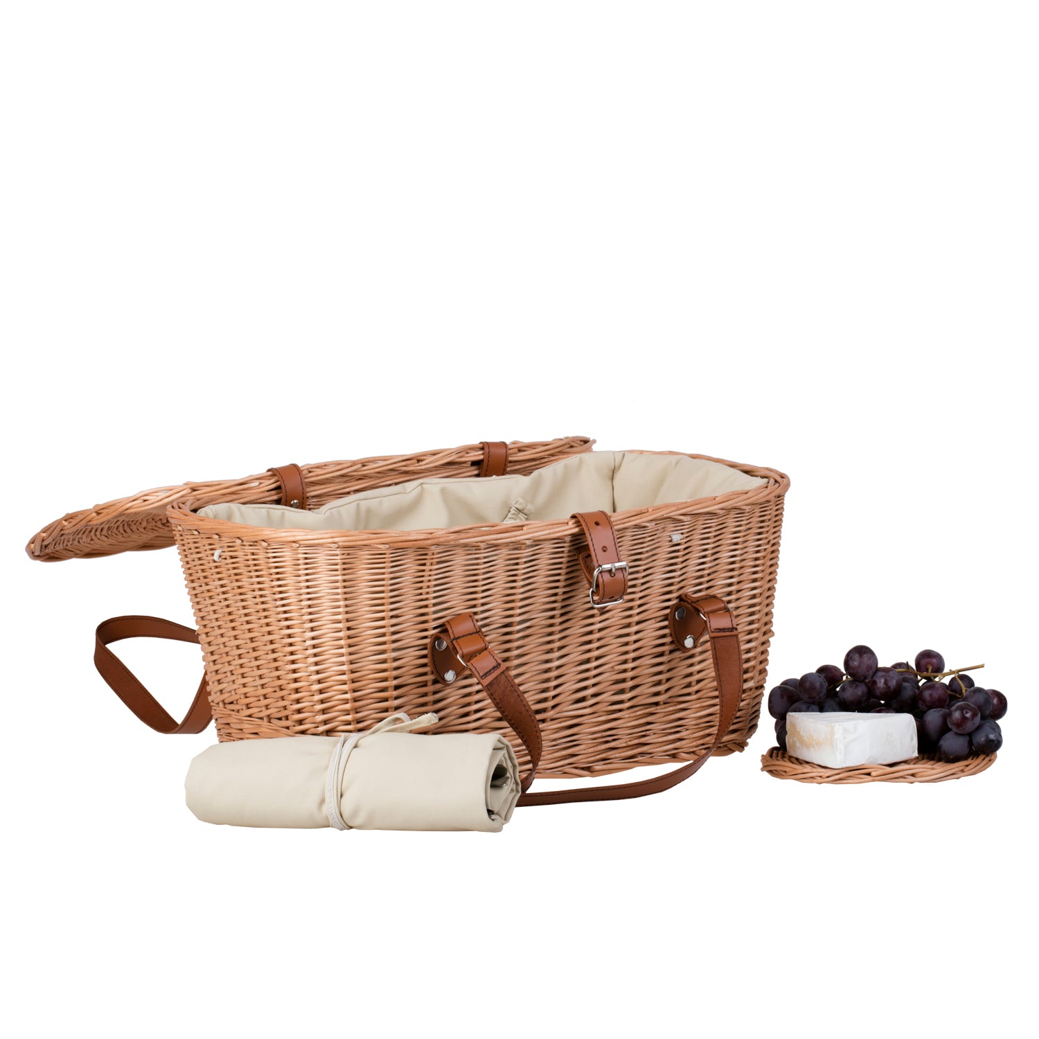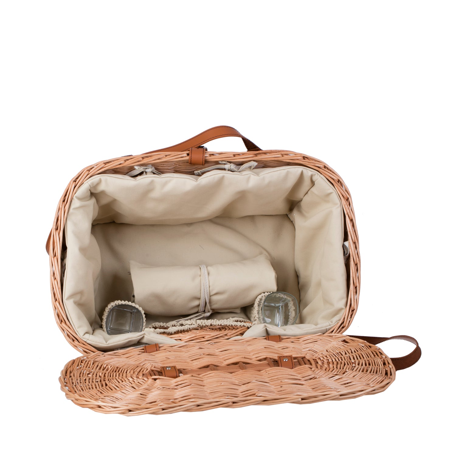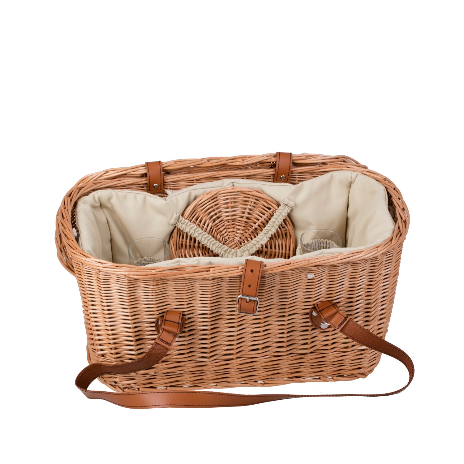 Powstał z myślą o piknikach, wycieczkach i długich spacerach. Sztywna pokrywa skutecznie osłania prowiant przed kurzem i owadami, a długie skórzane paski umożliwiają wygodne przenoszenie nawet cięższego zestawu. Wewnątrz praktyczny wkład z bawełny z kieszonkami na szkło pomaga uporządkować kubki i drobiazgi. Dołączona okrągła taca z wikliny ułatwia serwowanie oraz separowanie delikatnych produktów, talerzy czy pieczywa.