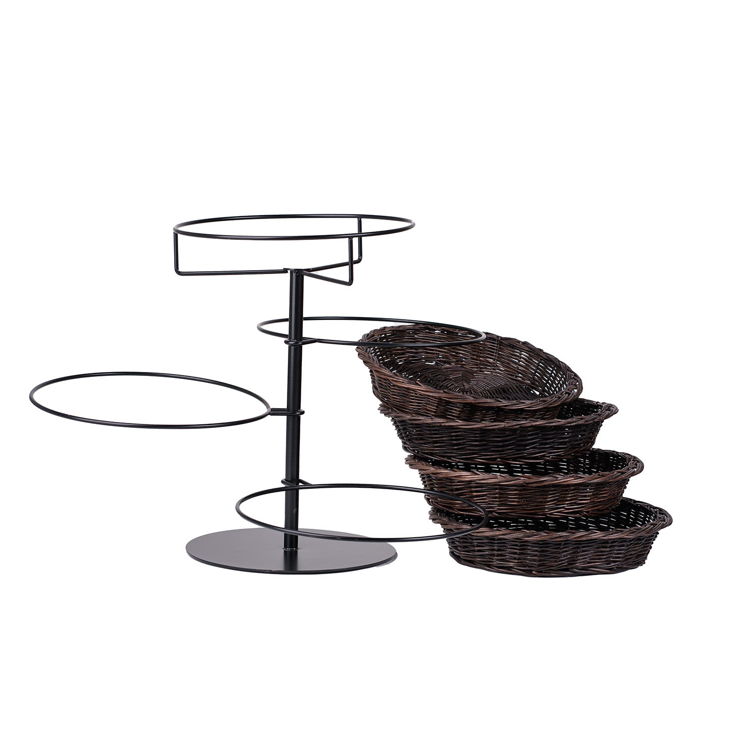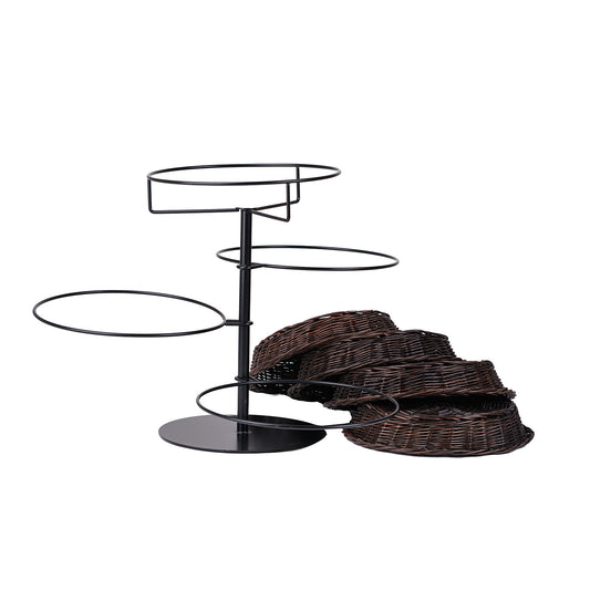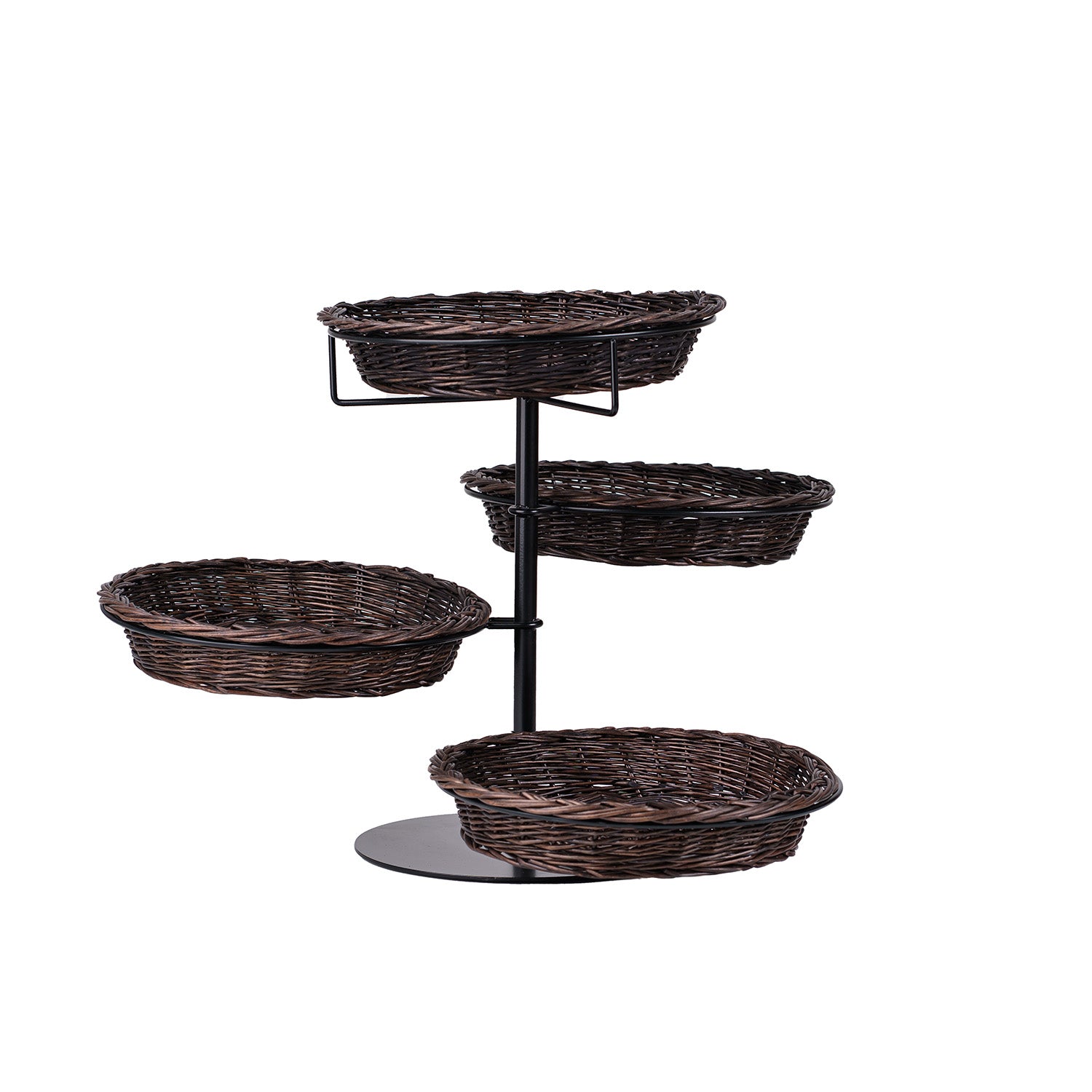 Wysokiej klasy stojak ekspozycyjny z czterema płytkimi koszami z wikliny prezentuje towar w elegancki, przejrzysty sposób. Każdy koszyk ma niską, równą krawędź i staranny splot, a całość utrzymana jest w ciemnym brązie. Kosze osadzone są na centralnym, metalowym trzonie z okrągłą podstawą, rozmieszczone kaskadowo na różnych wysokościach. Wykończenie jest estetyczne, a splot gęsty i równy.