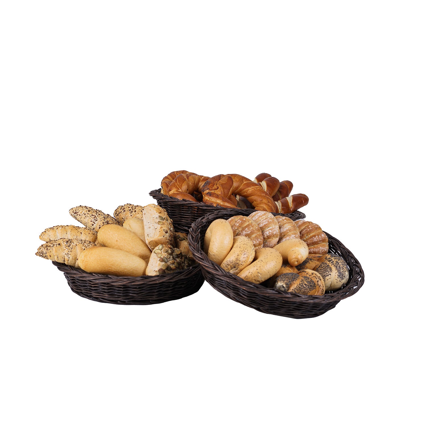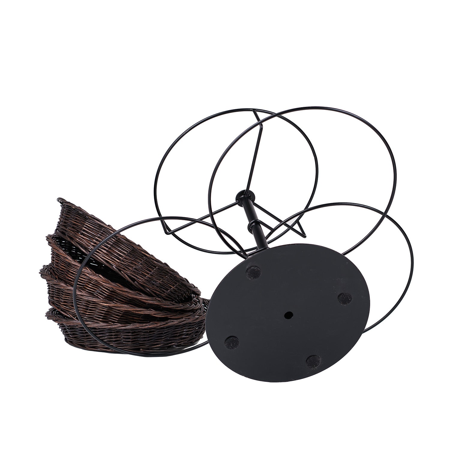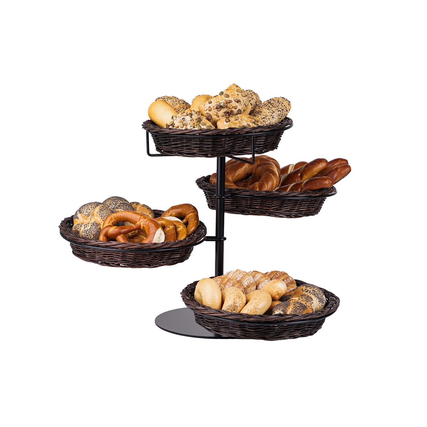 Wysokiej klasy stojak ekspozycyjny z czterema płytkimi koszami z wikliny prezentuje towar w elegancki, przejrzysty sposób. Każdy koszyk ma niską, równą krawędź i staranny splot, a całość utrzymana jest w ciemnym brązie. Kosze osadzone są na centralnym, metalowym trzonie z okrągłą podstawą, rozmieszczone kaskadowo na różnych wysokościach. Wykończenie jest estetyczne, a splot gęsty i równy.