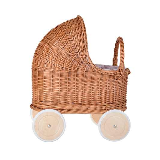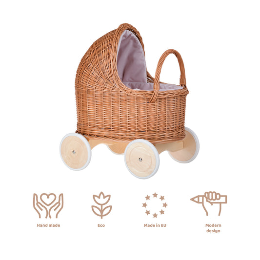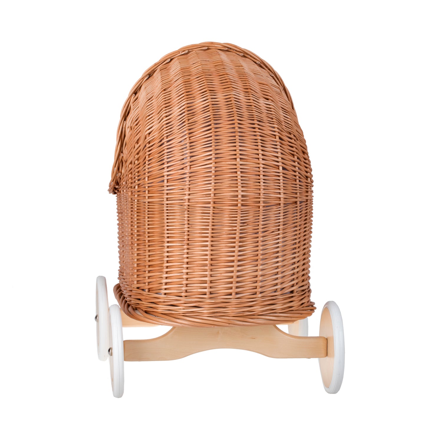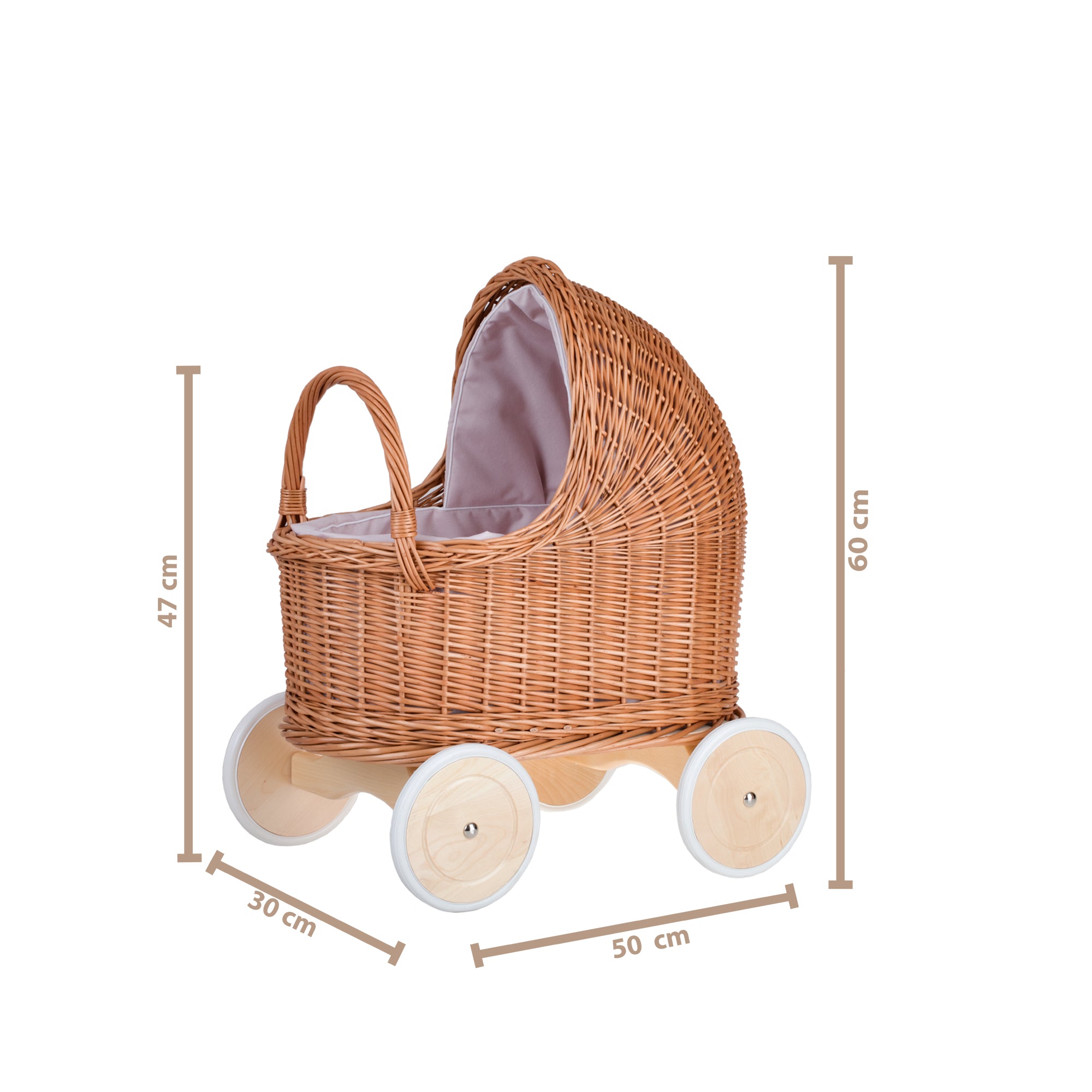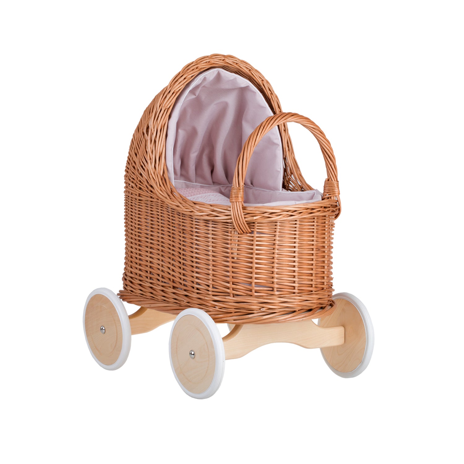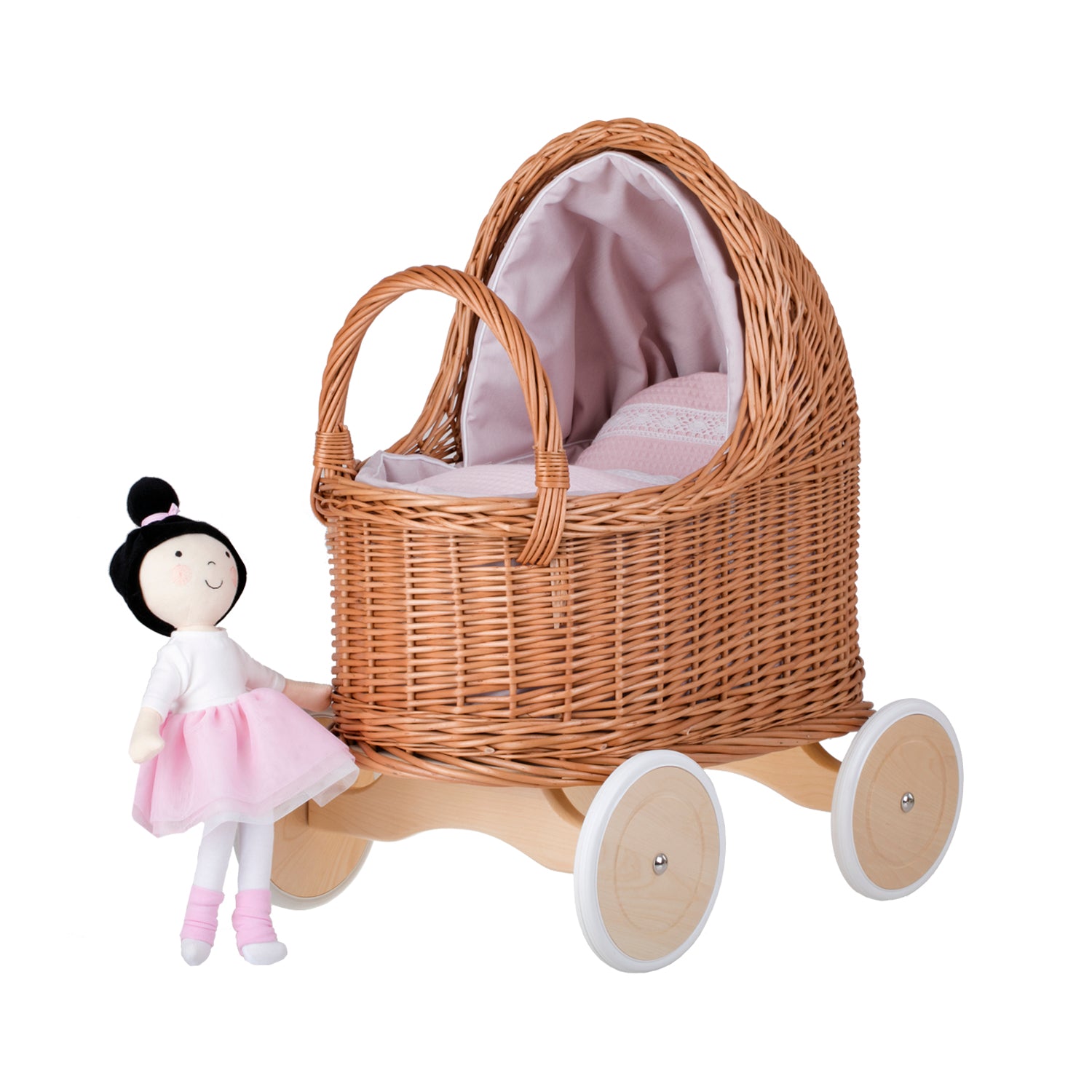Lara wiklinowy wózek dla lalek z różowym obszyciem, kołderką i poduszką TheWickerStories