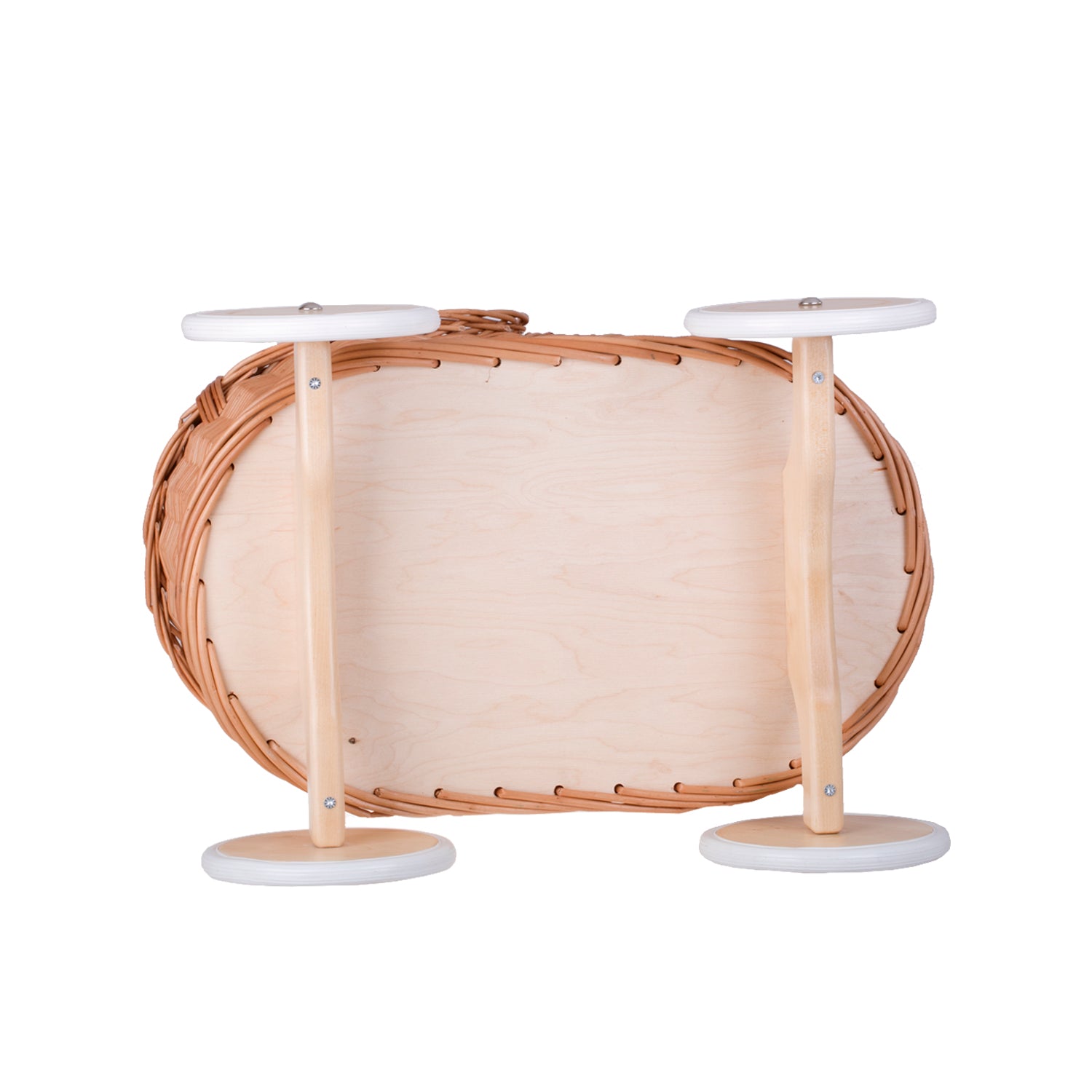 Stabilne, drewniane kółka zapewniają płynne i bezpieczne prowadzenie, a solidna wiklinowa rączka gwarantuje wygodę w przenoszeniu. Produkt jest lekki, ale jednocześnie wytrzymały, co umożliwia długotrwałą i aktywną zabawę w domu oraz na świeżym powietrzu. Jego konstrukcja zachęca do kreatywnej aktywności i odgrywania ról.