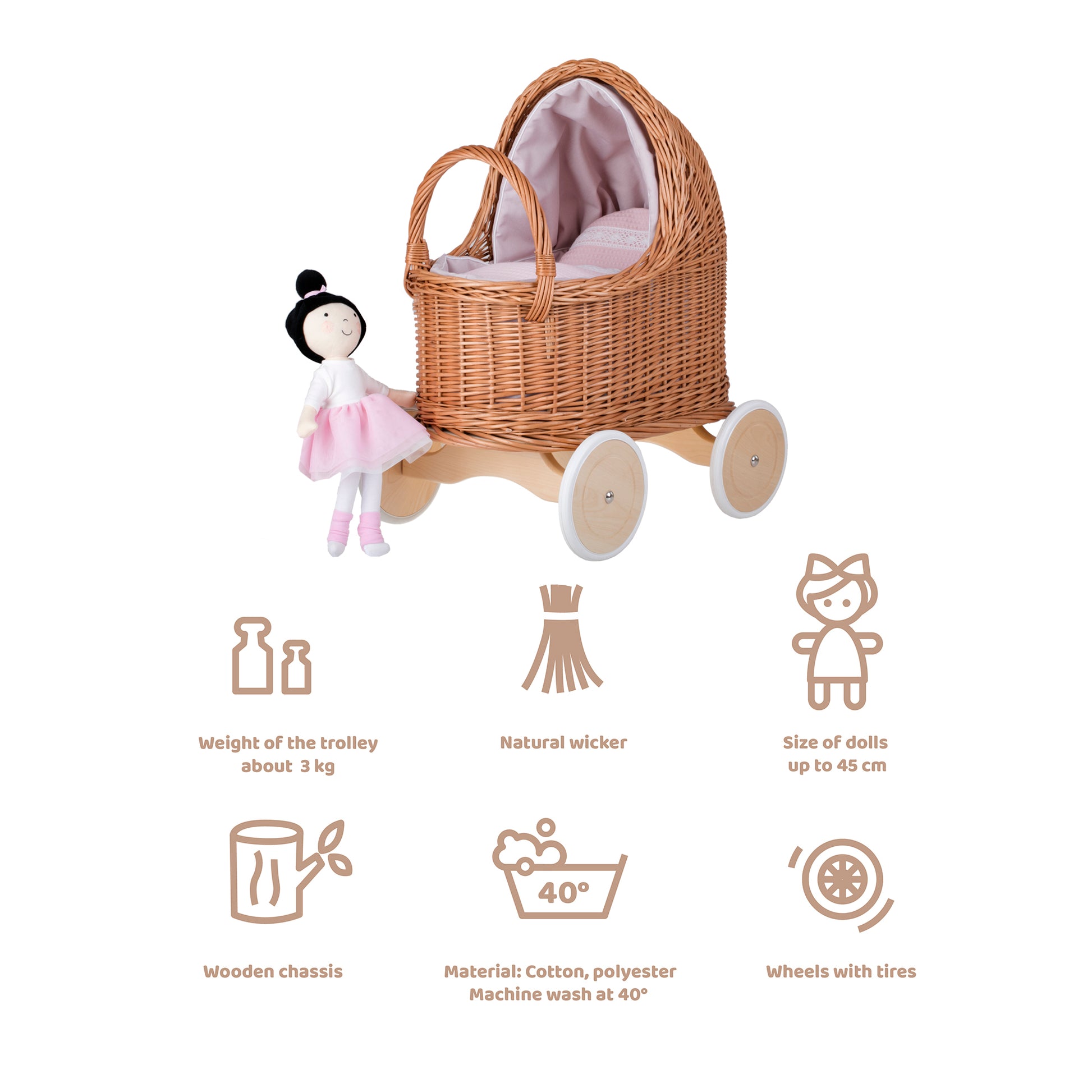 Specyfikacja Twojego Lara wiklinowy wózek dla lalek z różowym obszyciem, kołderką i poduszką TheWickerStories