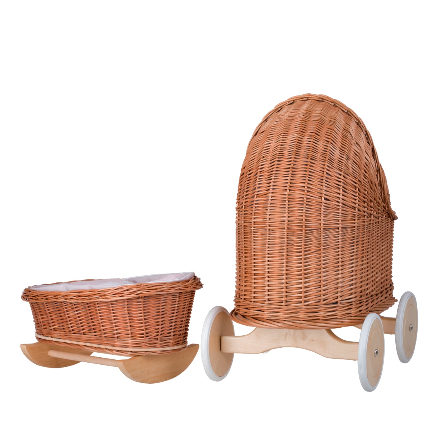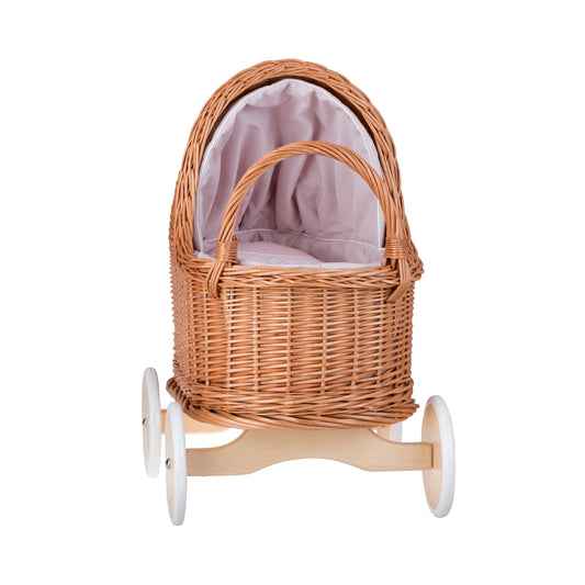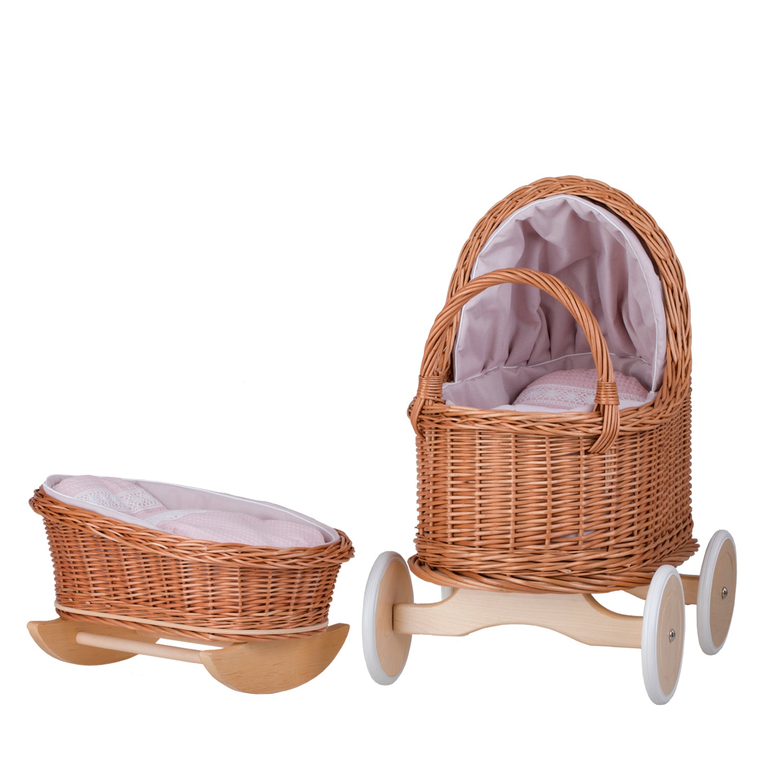 Lara wiklinowy wózek i kołyska dla lalek z różowym obszyciem, kołderką i poduszką TheWickerStories