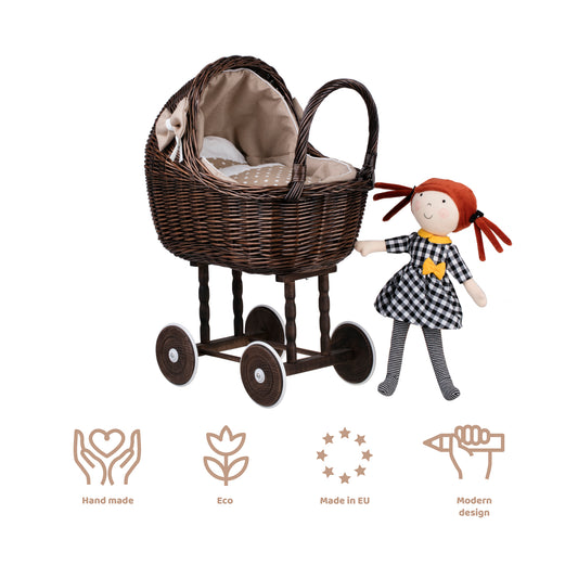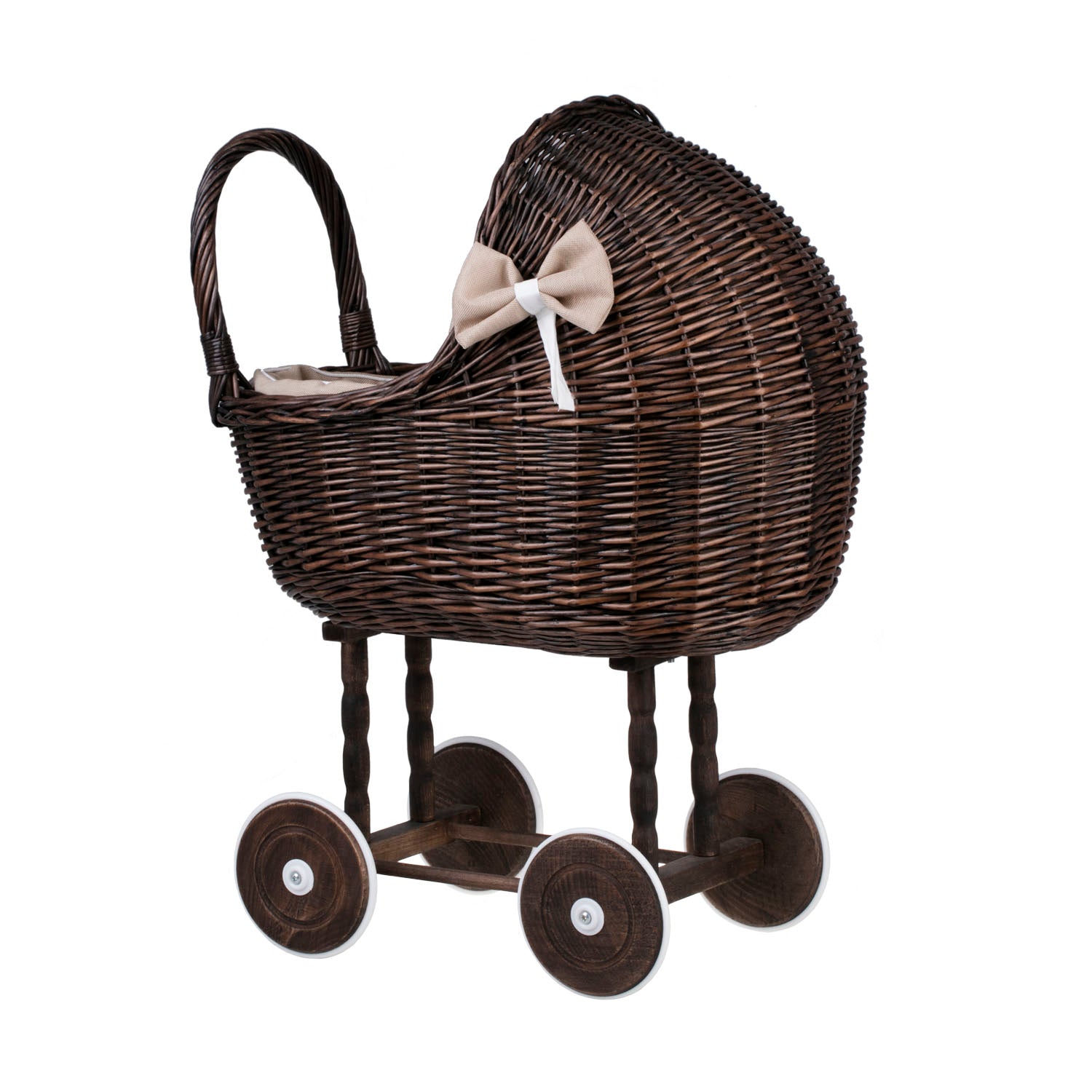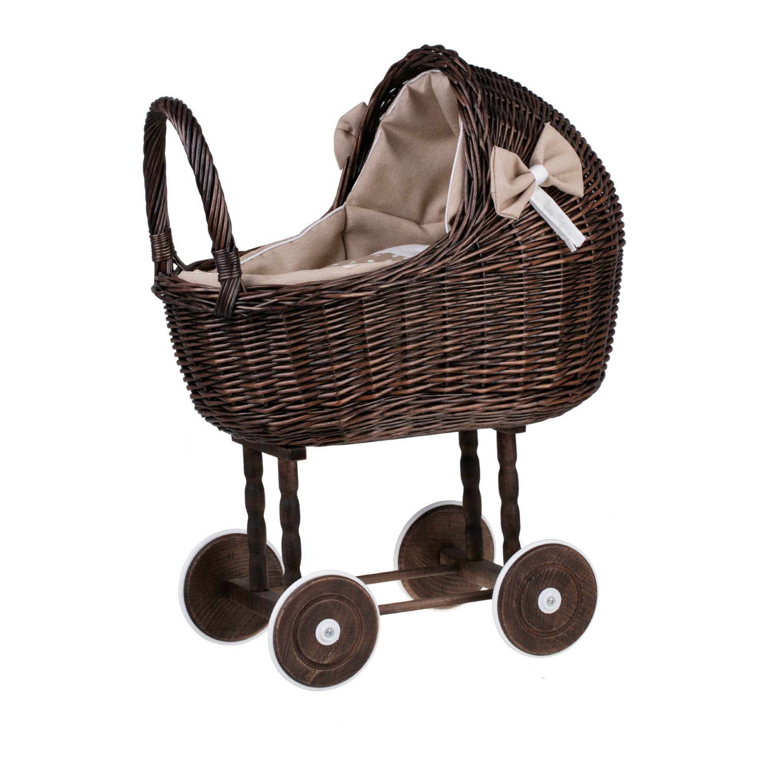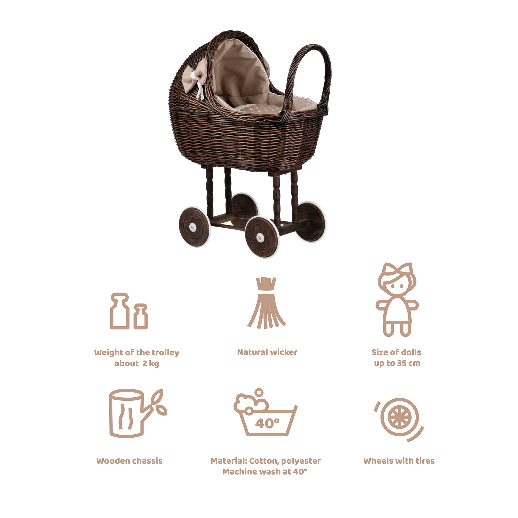 Lena wiklinowy wózek dla lalek z beżowym obszyciem, kołderką i poduszką TheWickerStories