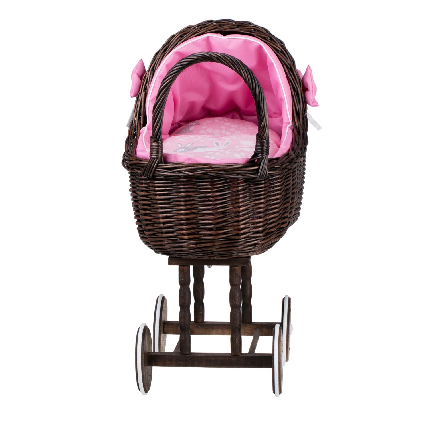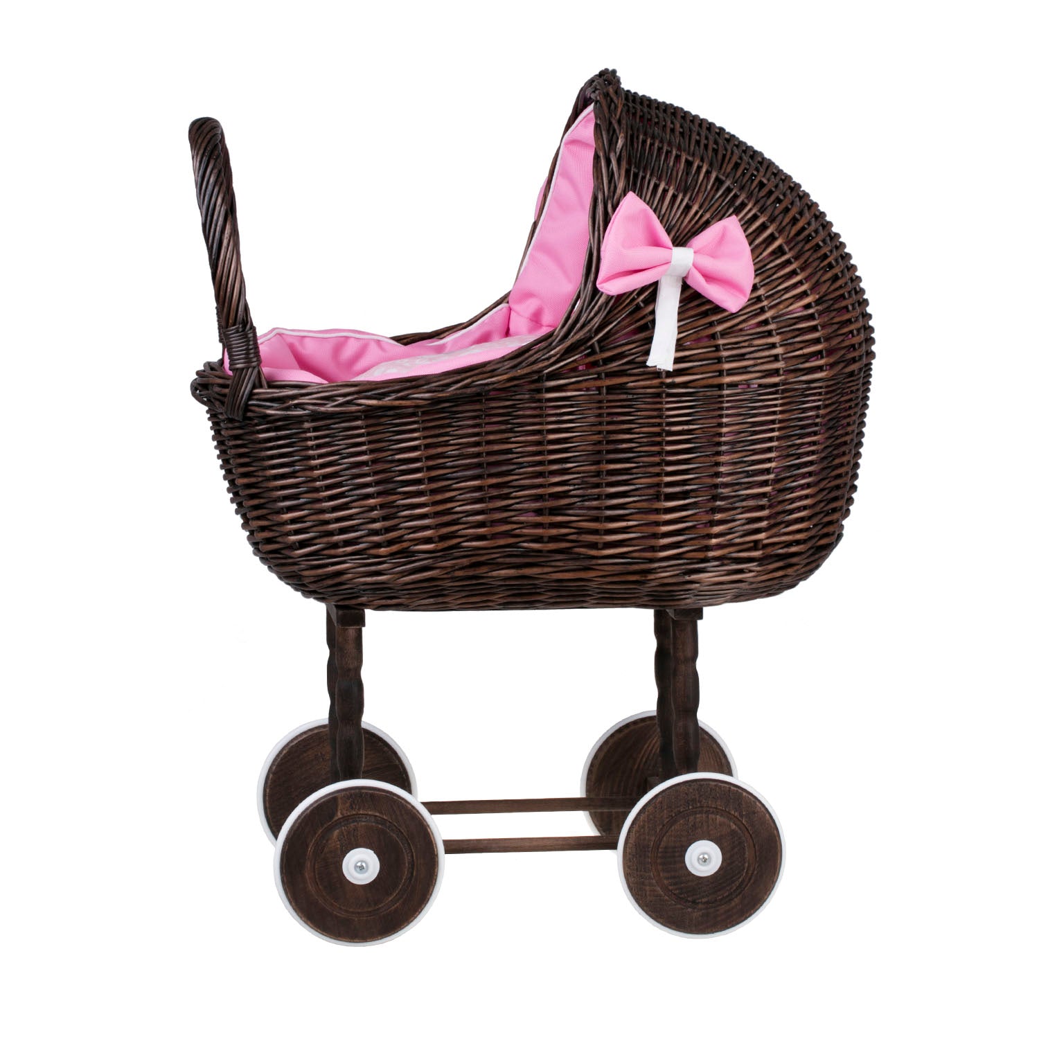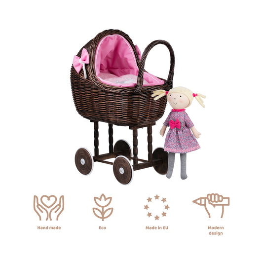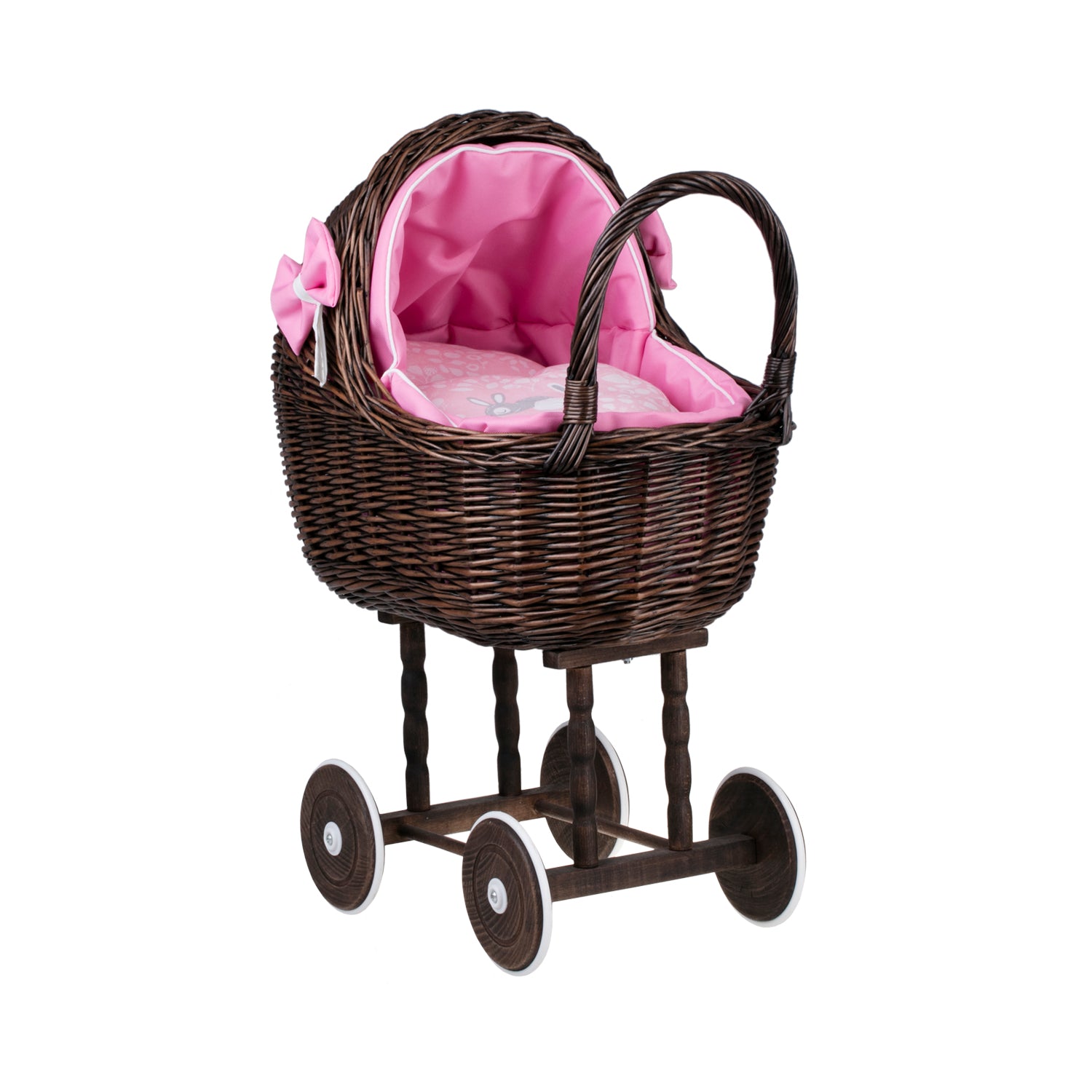 Lena wiklinowy wózek dla lalek z różowym obszyciem, kołderką i poduszką TheWickerStories