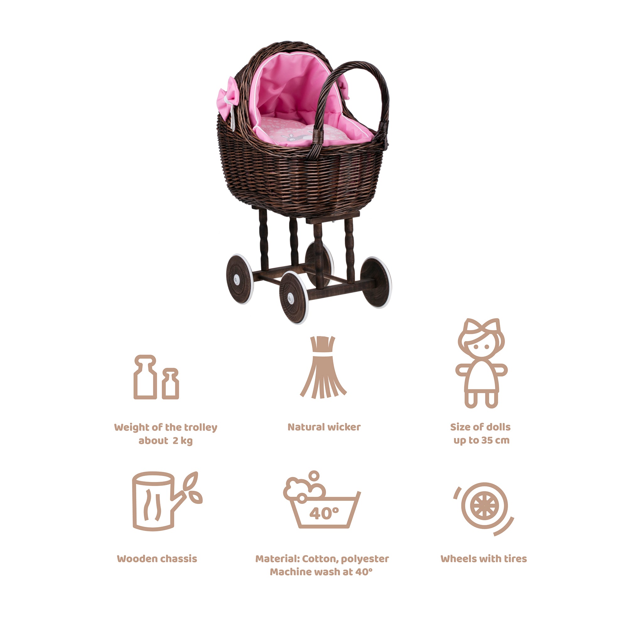 Specyfikacja Twojego Lena wiklinowy wózek dla lalek z różowym obszyciem, kołderką i poduszką TheWickerStories