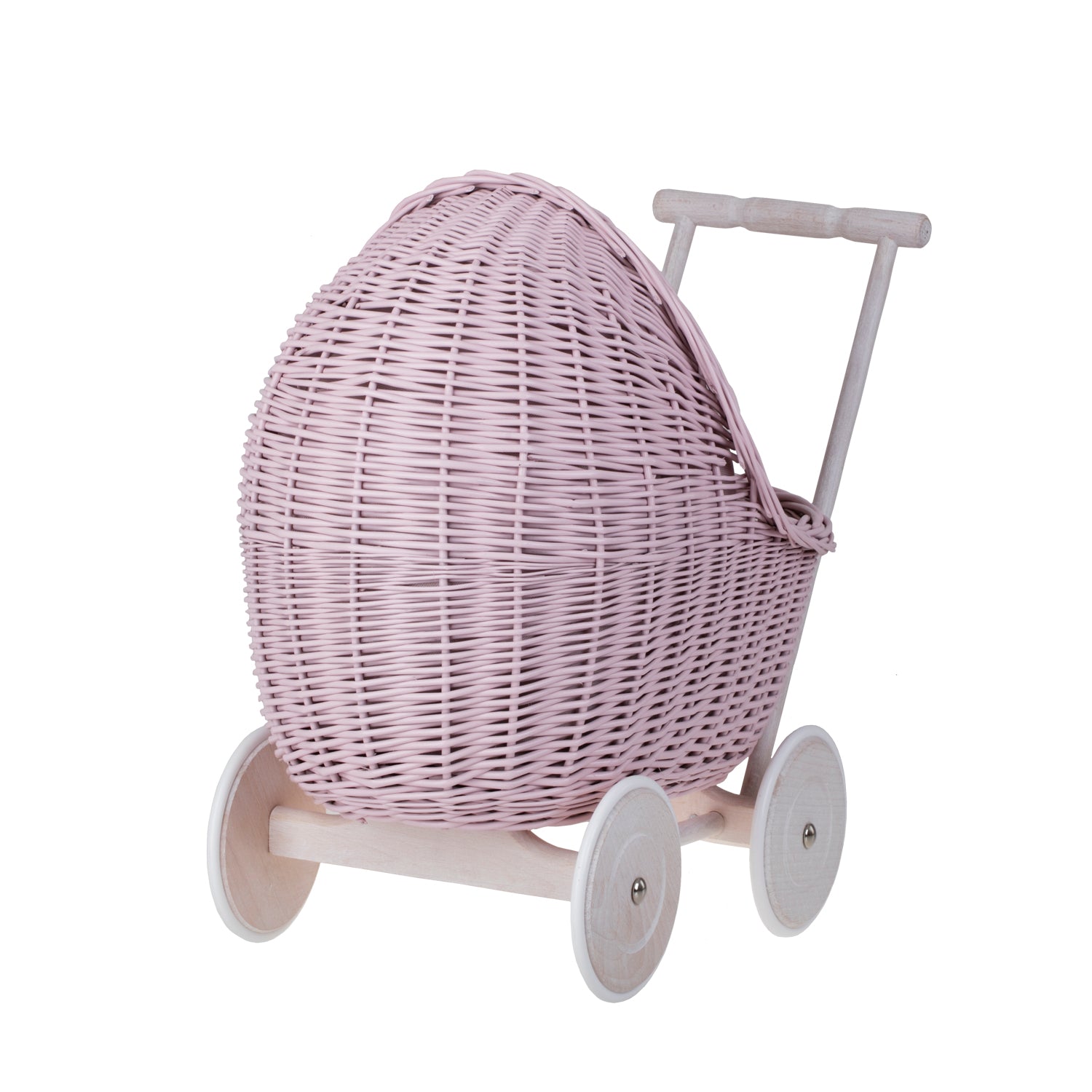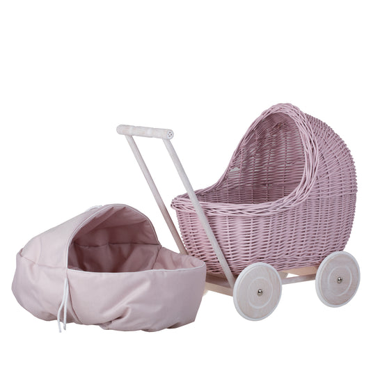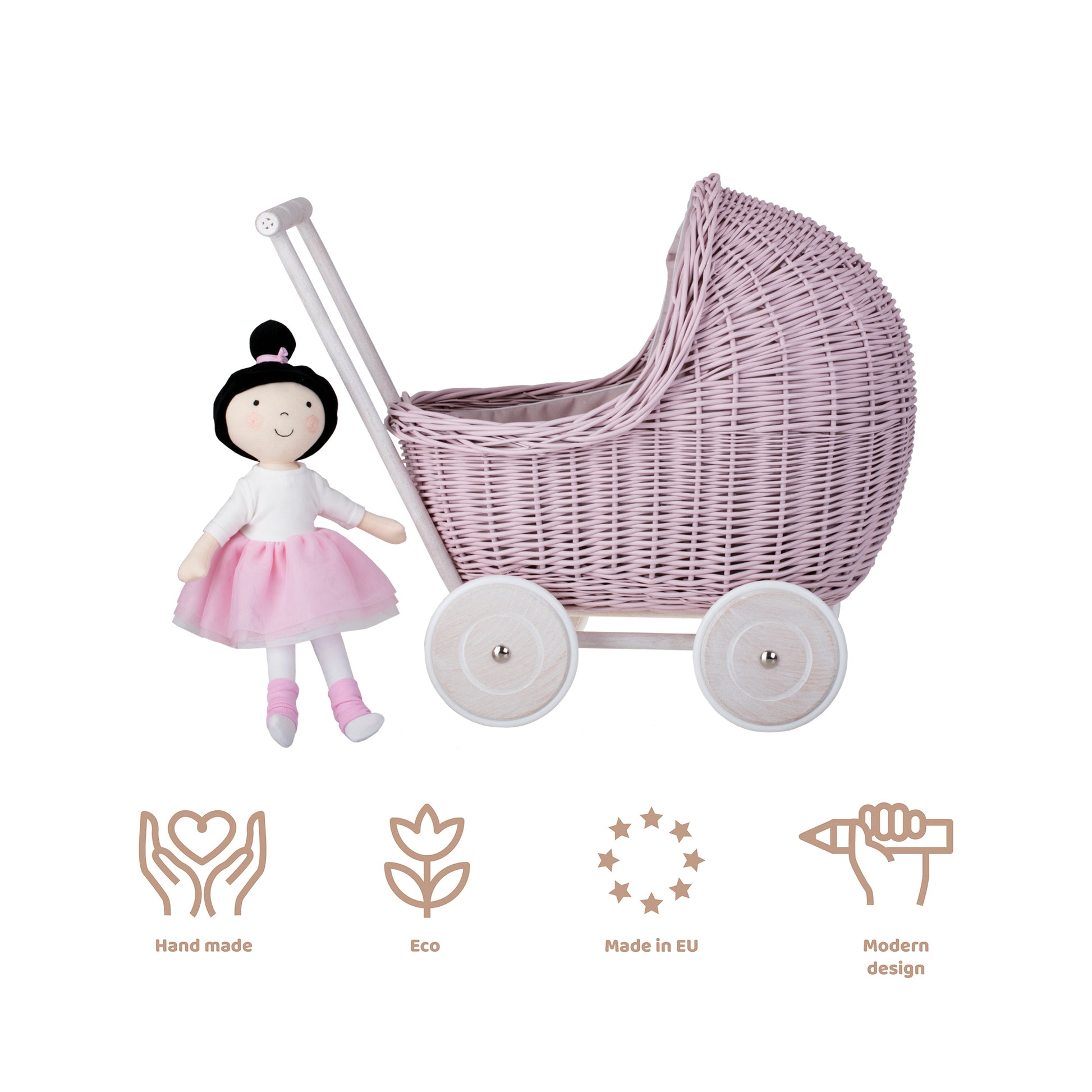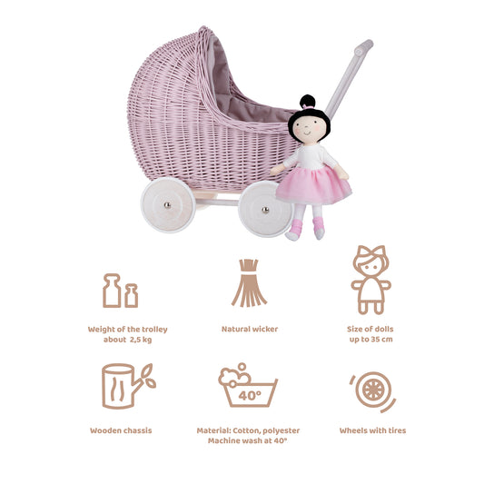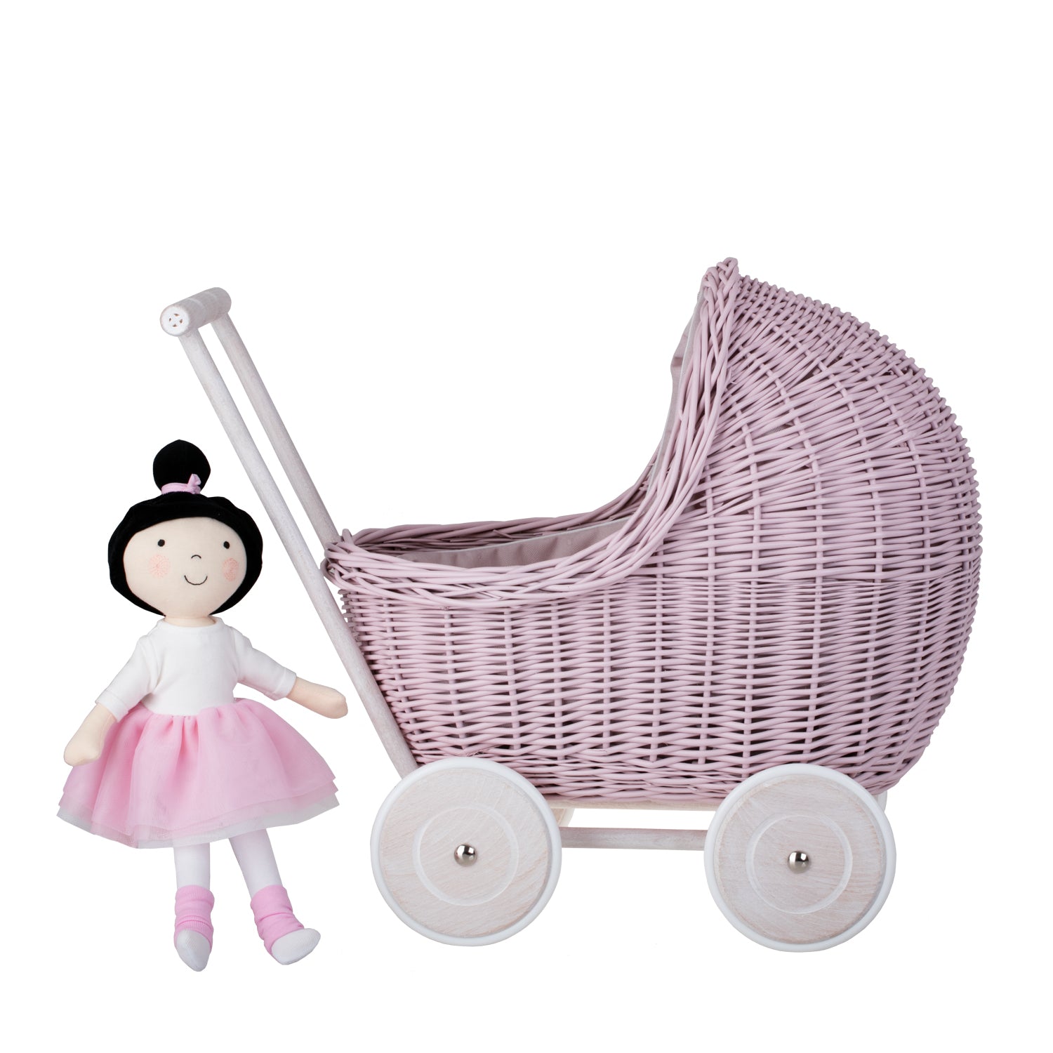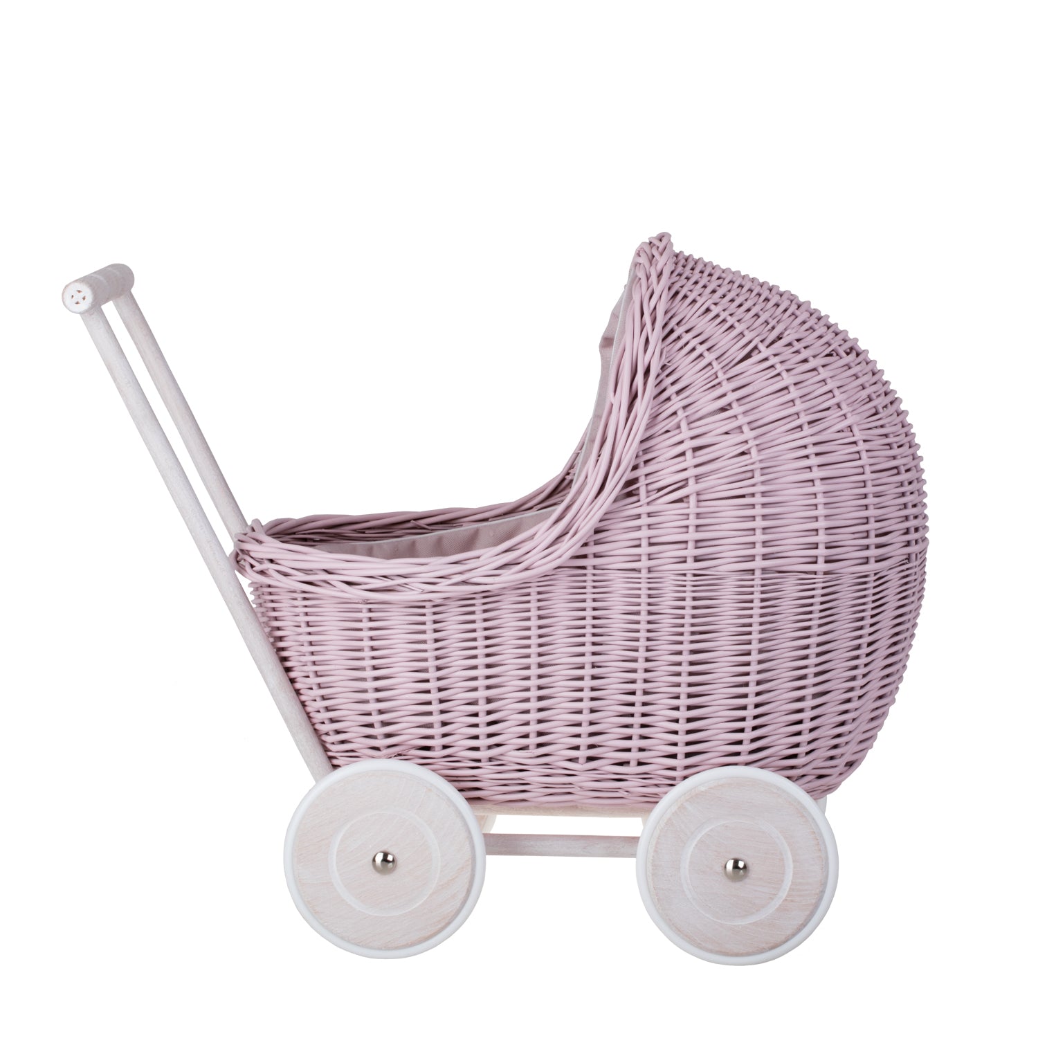 Lili wiklinowy wózek dla lalek z beżowym obszyciem, kołderką i poduszką TheWickerStories