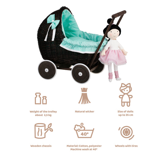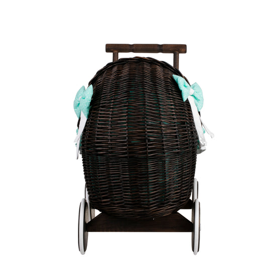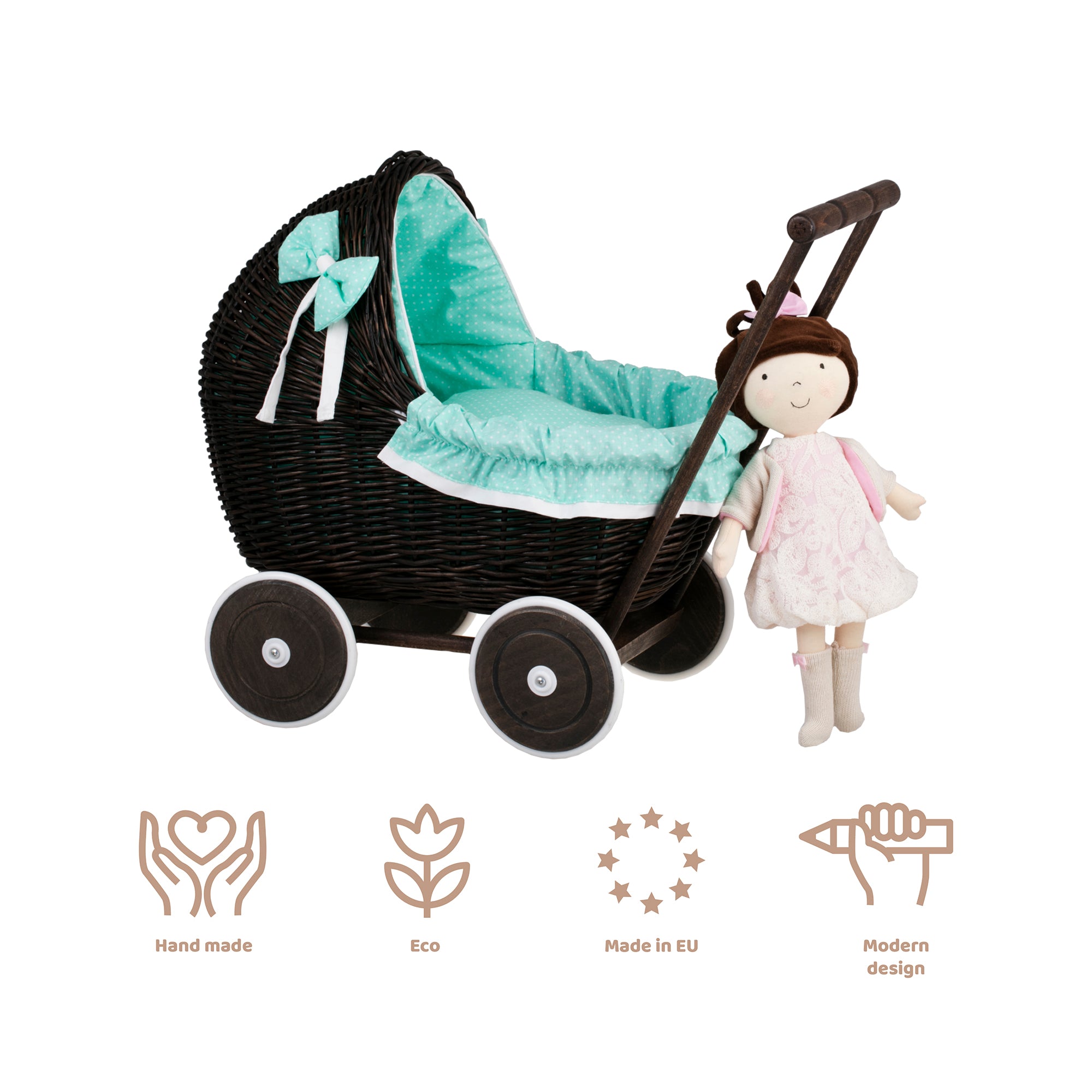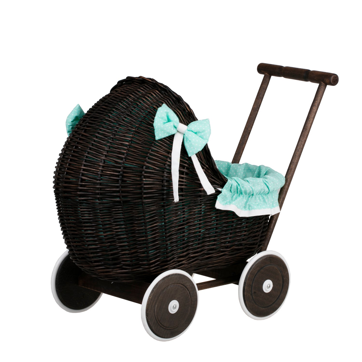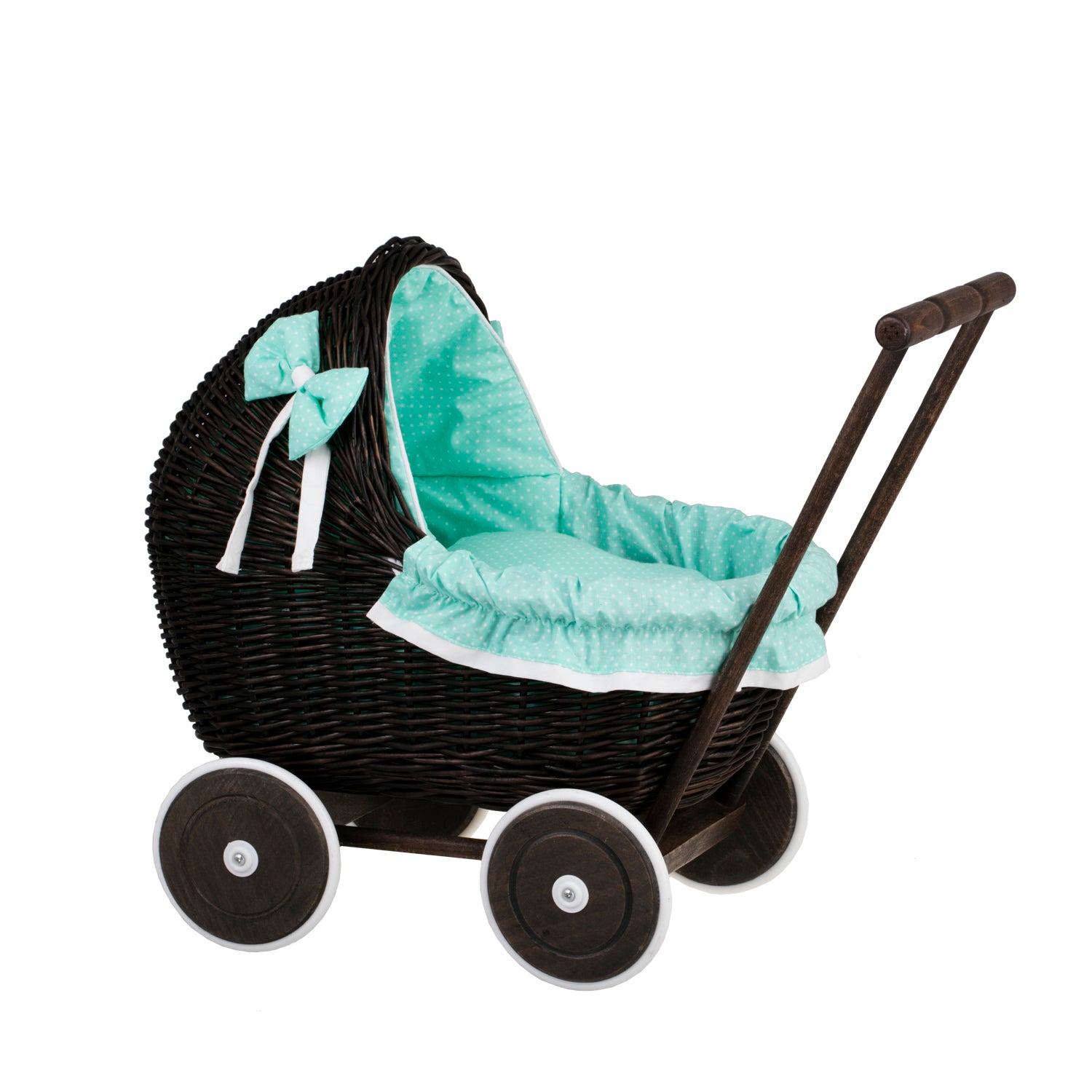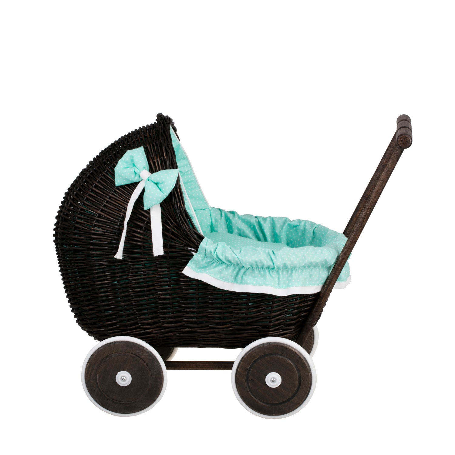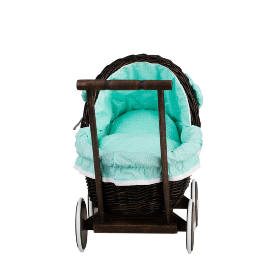 Lili wiklinowy wózek dla lalek z miętowym obszyciem, kołderką i poduszką TheWickerStories