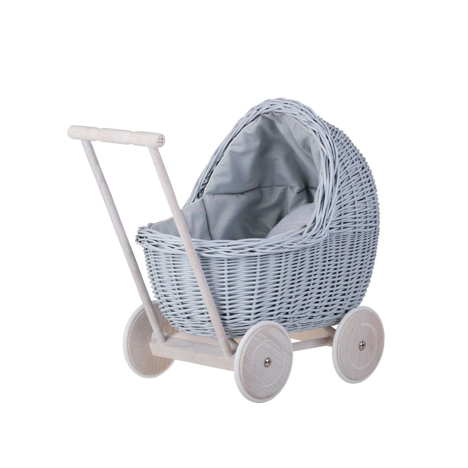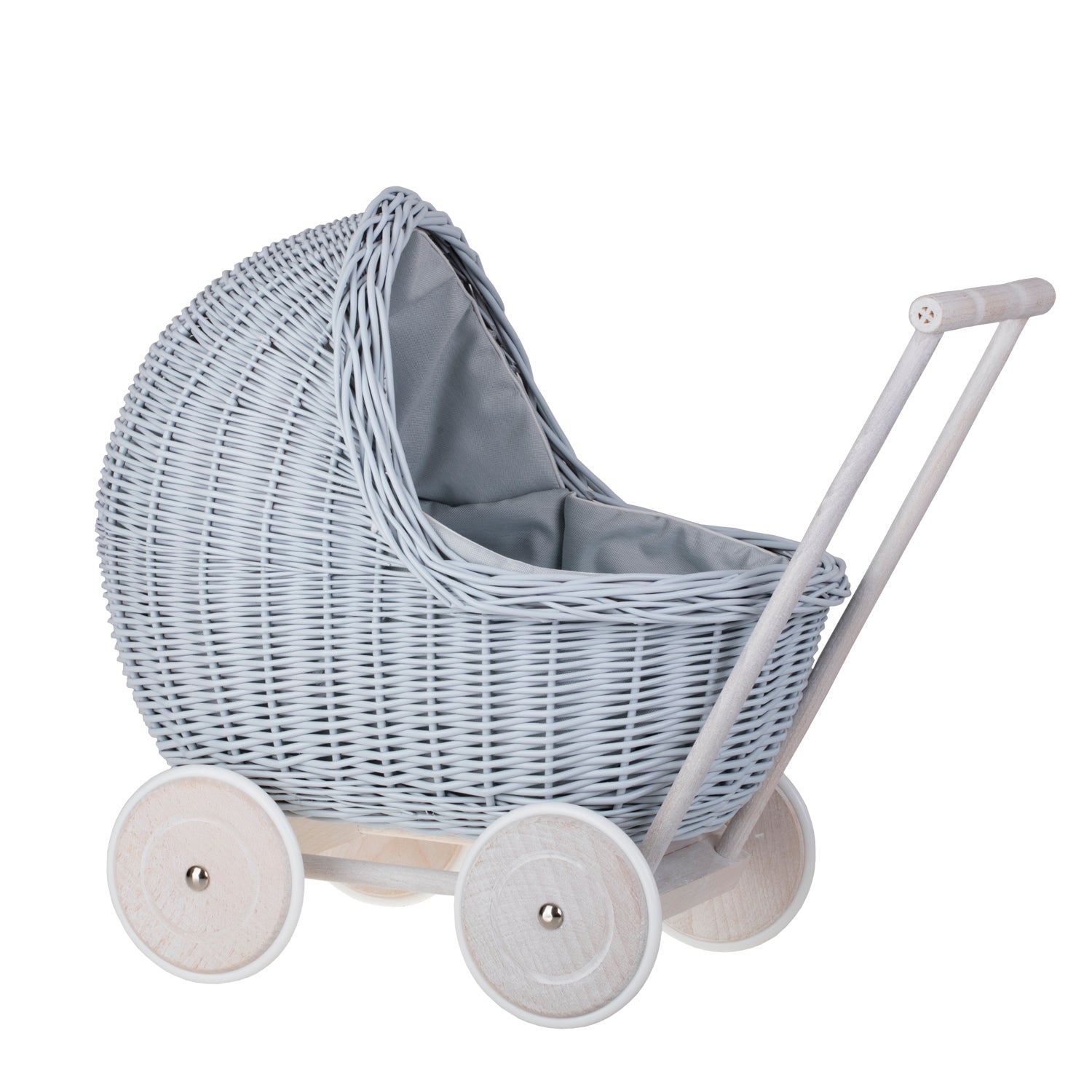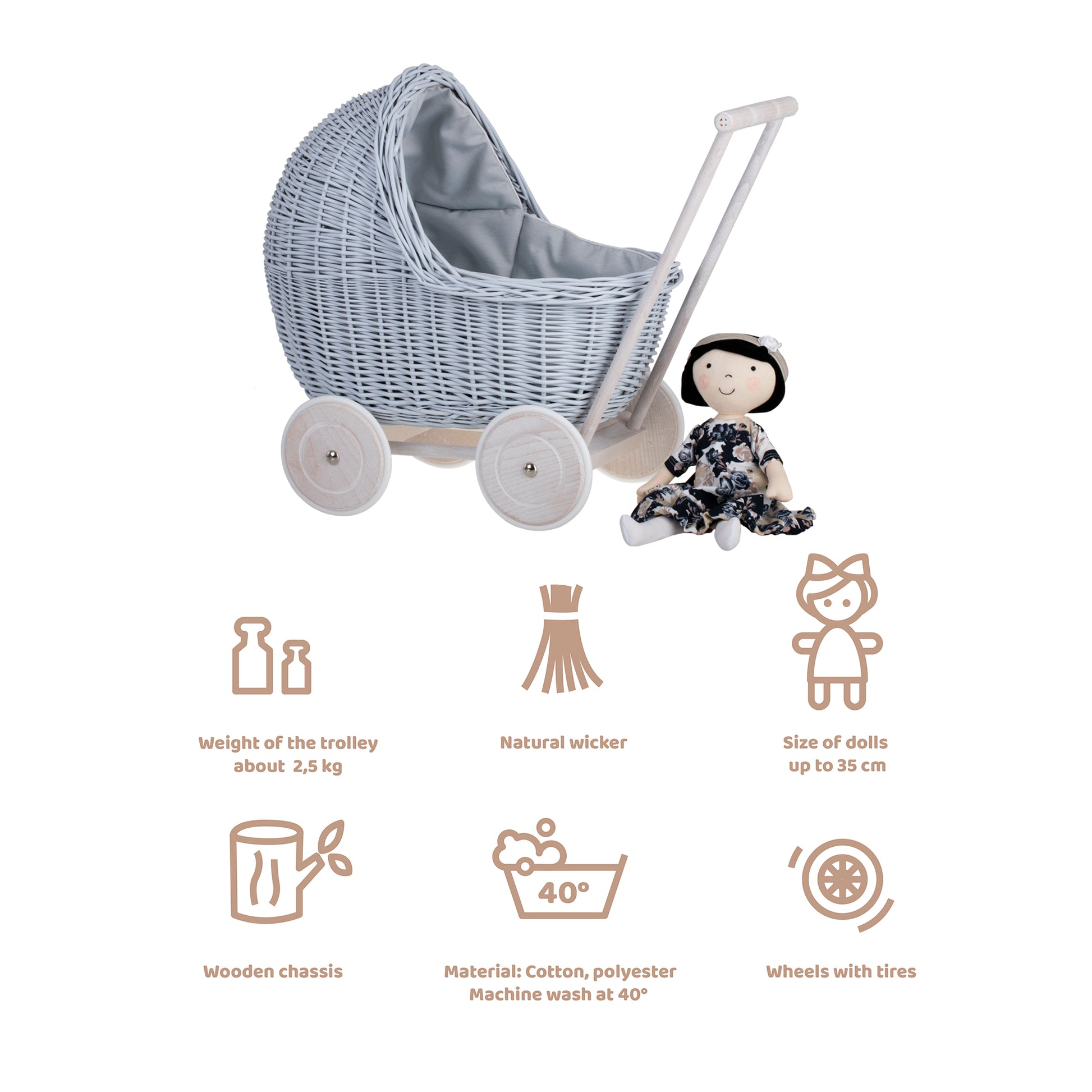 Lili wiklinowy wózek dla lalek z niebieskim obszyciem, kołderką i poduszką TheWickerStories