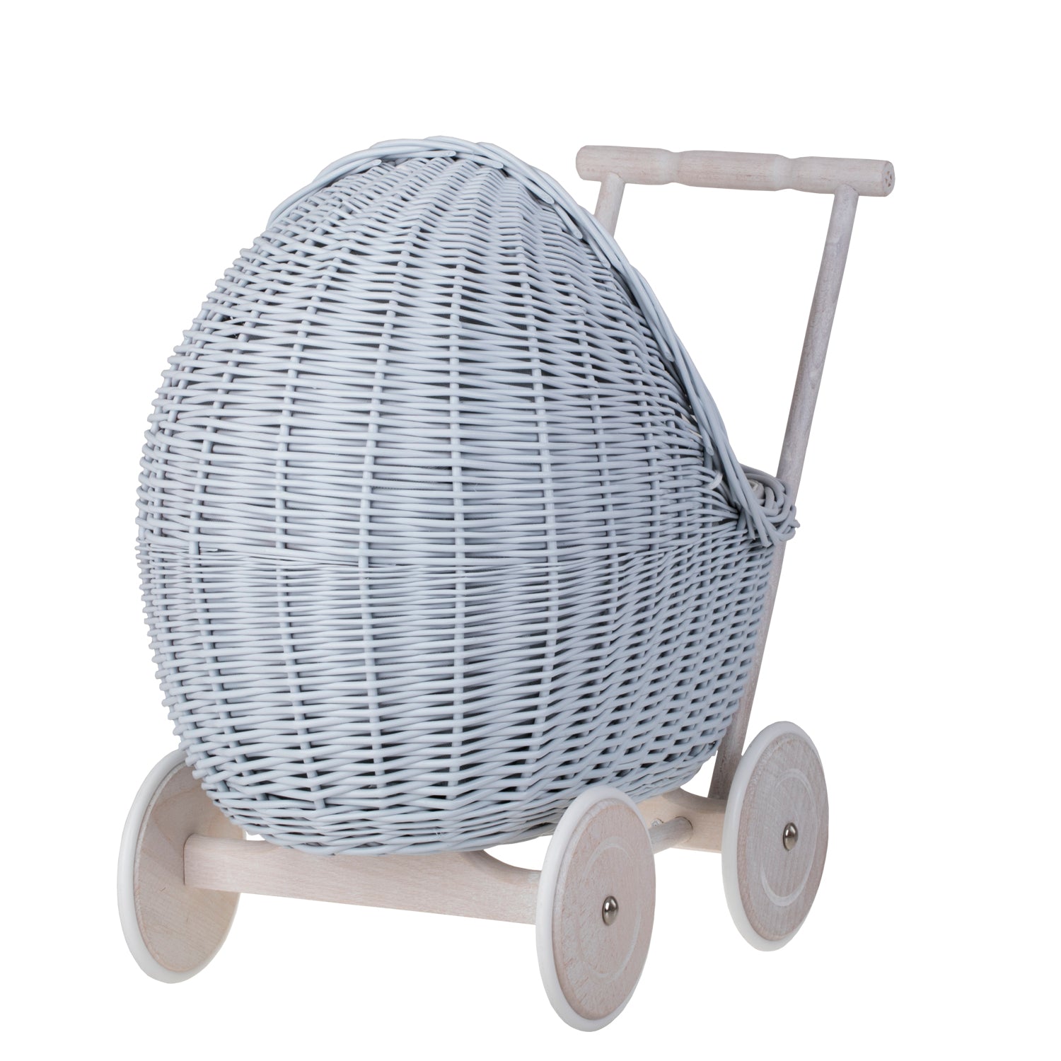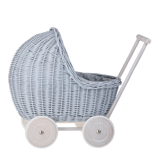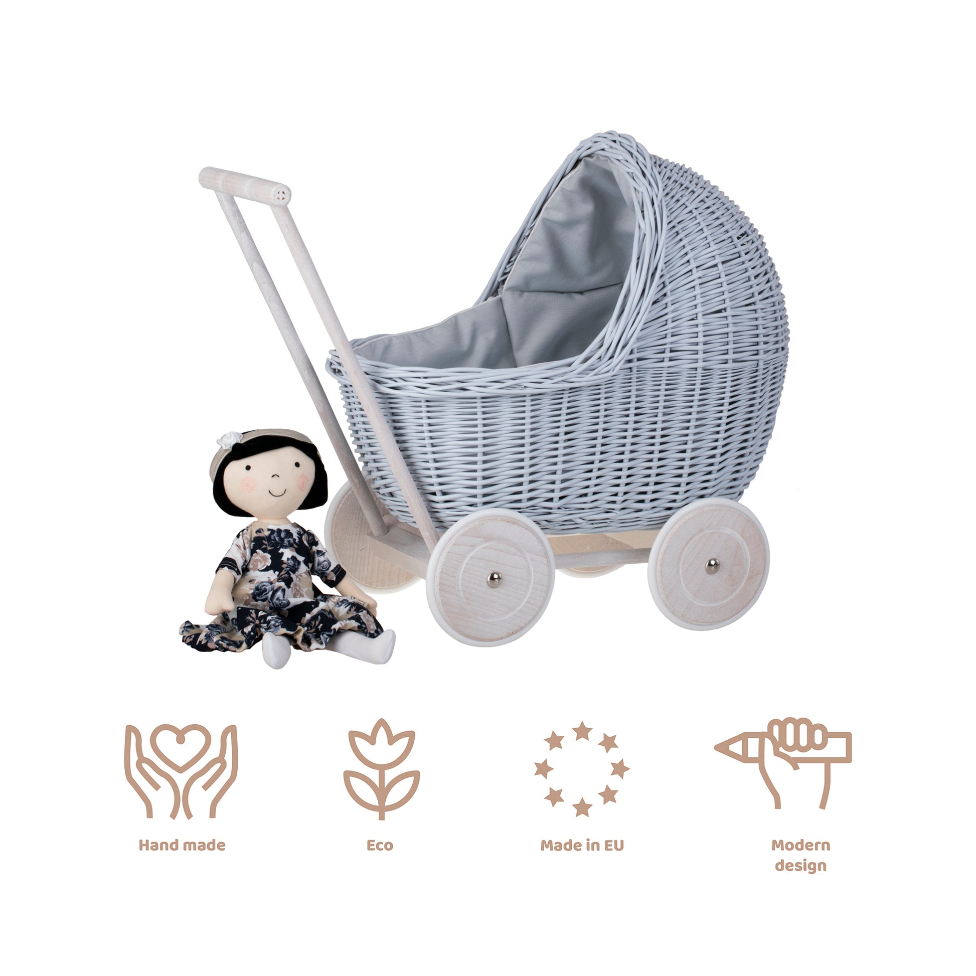 Lili wiklinowy wózek dla lalek z niebieskim obszyciem, kołderką i poduszką TheWickerStories