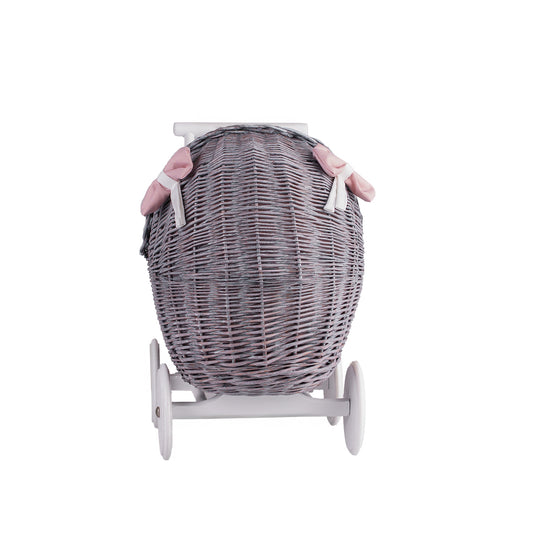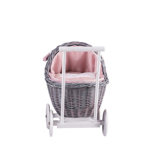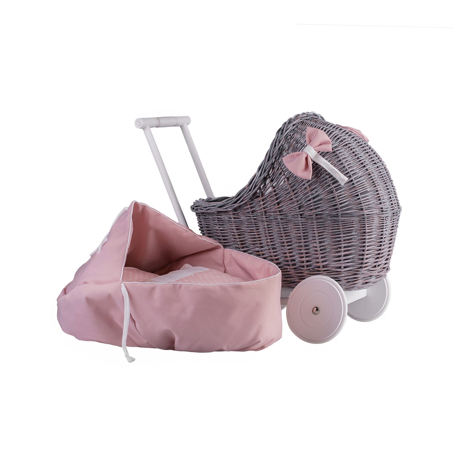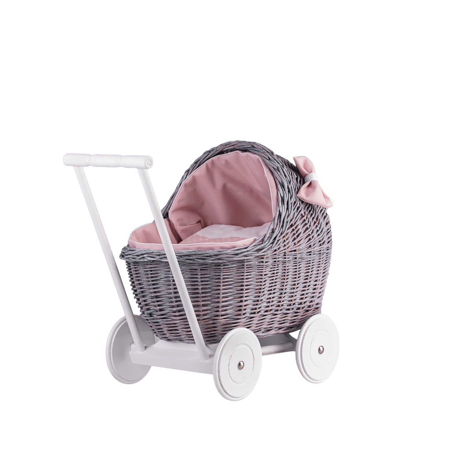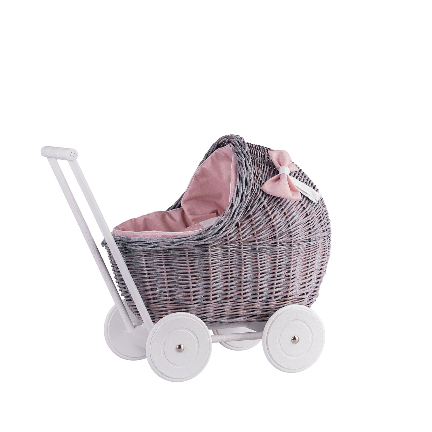Lili wiklinowy wózek dla lalek z różowym obszyciem, kołderką i poduszką TheWickerStories