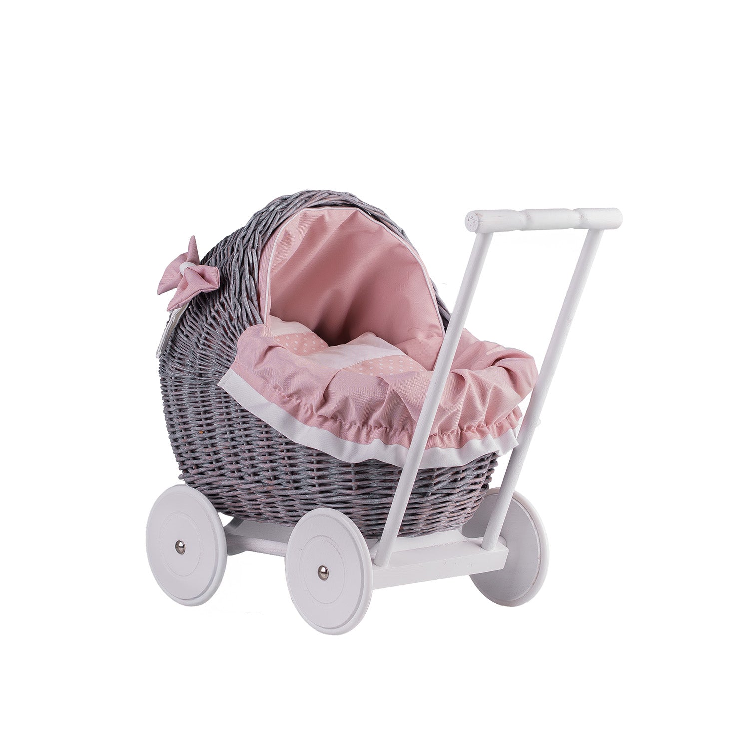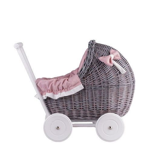 Lili wiklinowy wózek dla lalek z różowym obszyciem, kołderką i poduszką TheWickerStories