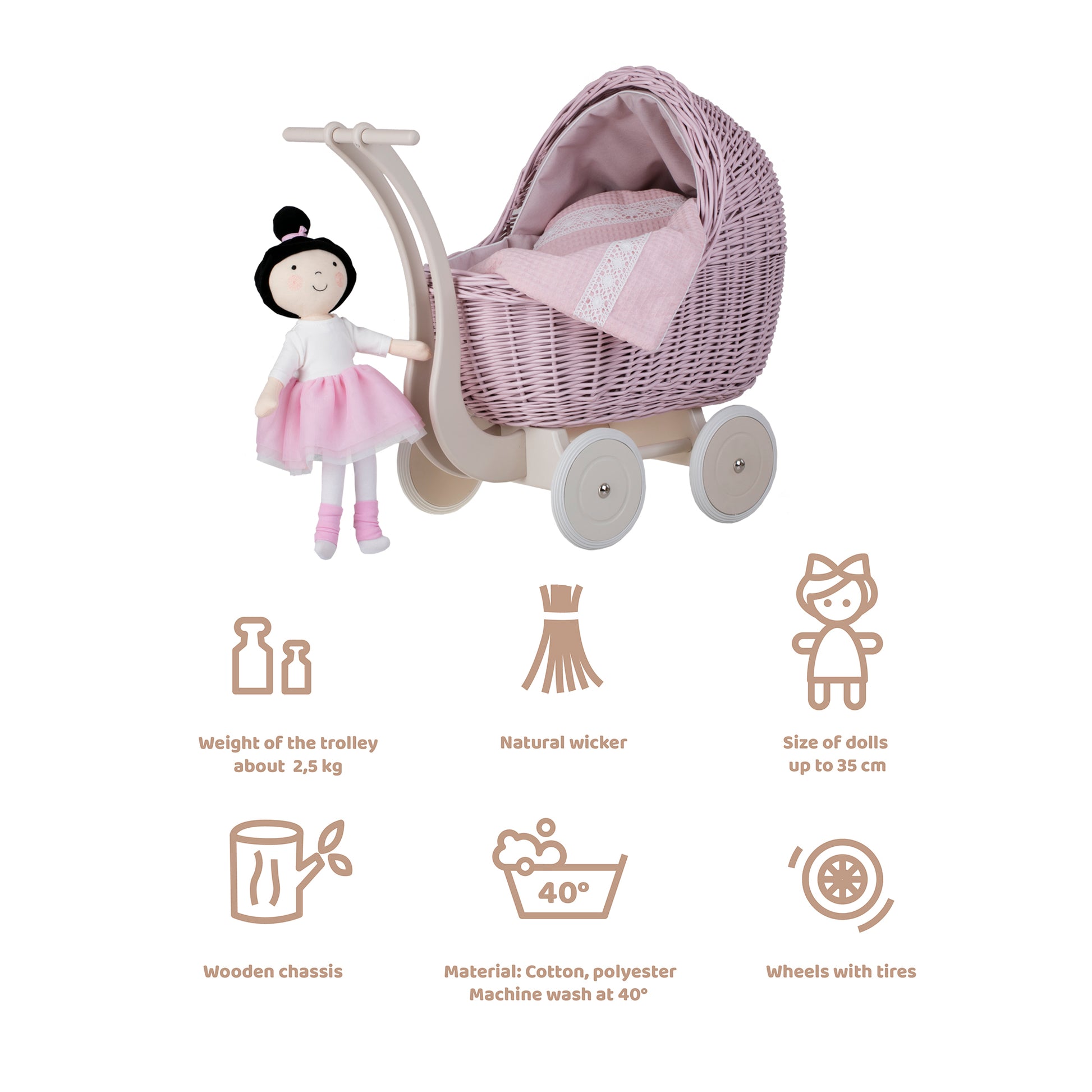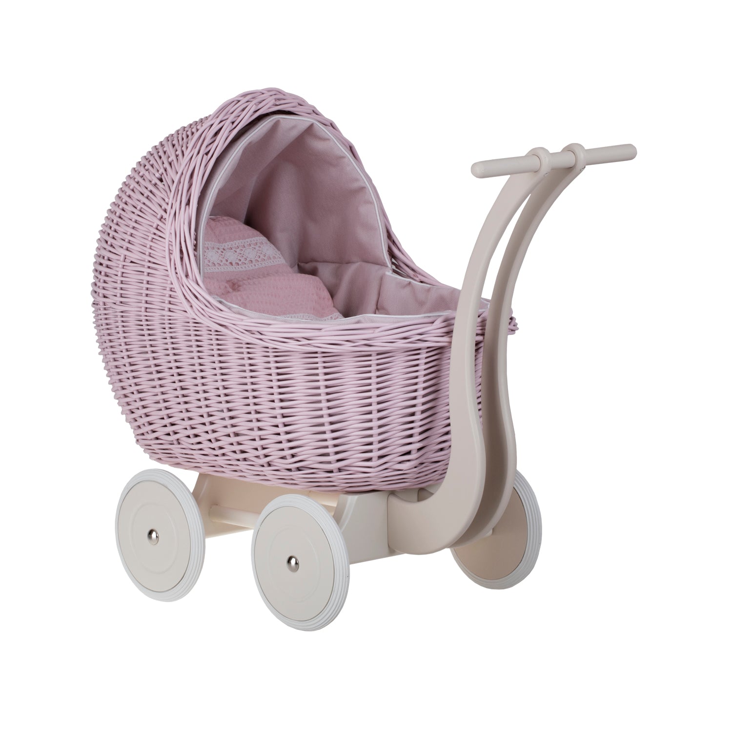 Lili wiklinowy wózek dla lalek z różowym obszyciem, kołderką i poduszką TheWickerStories