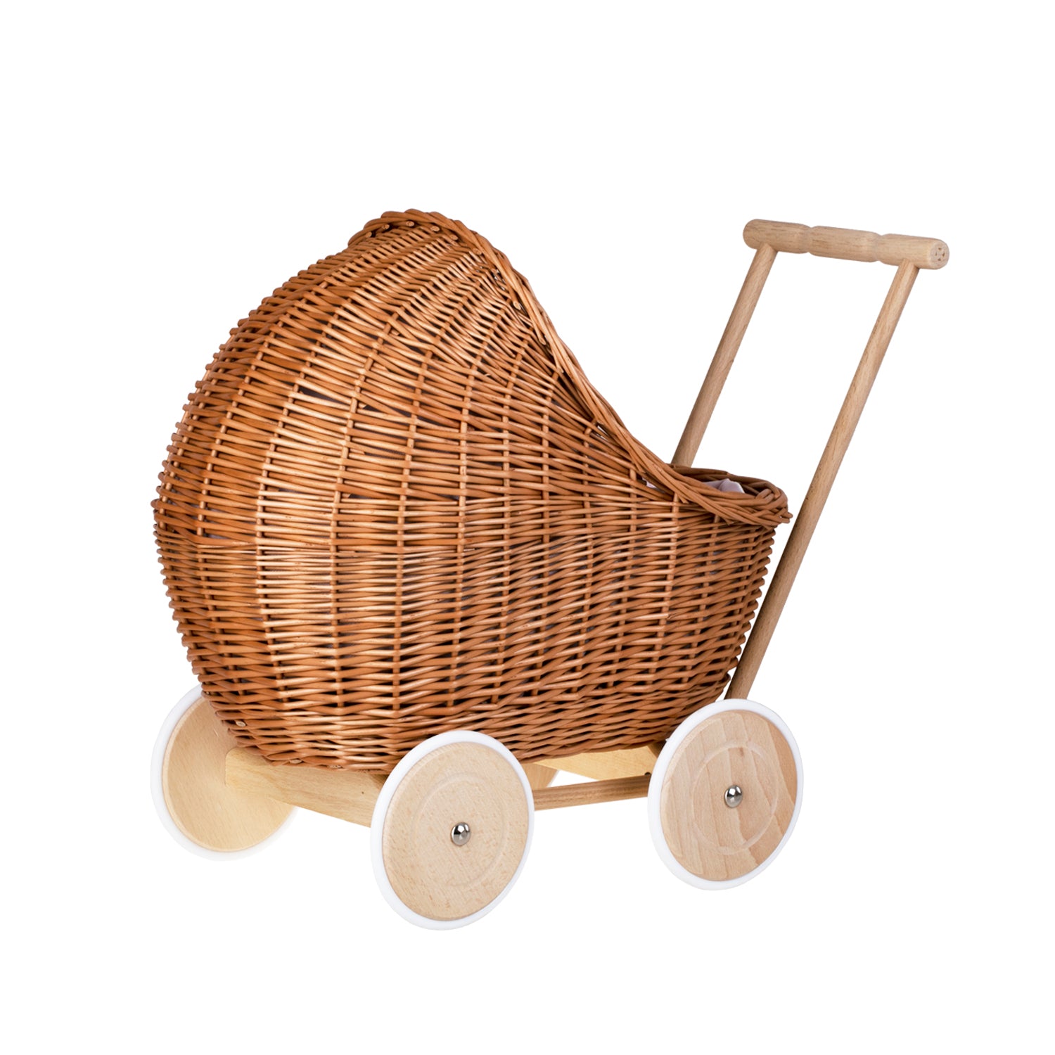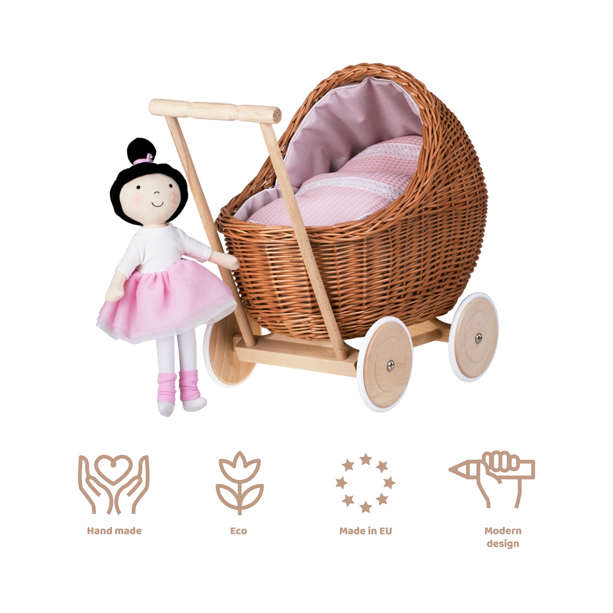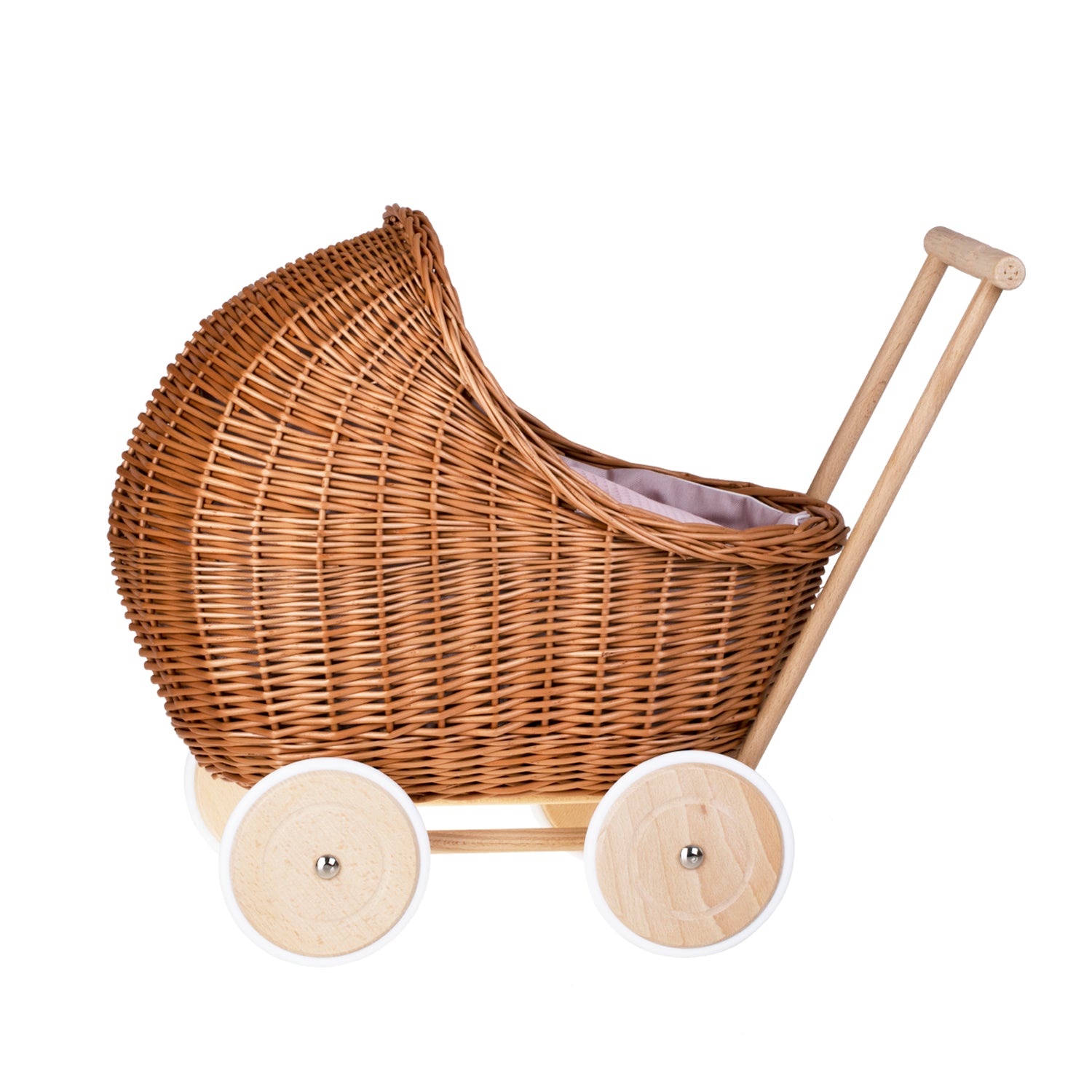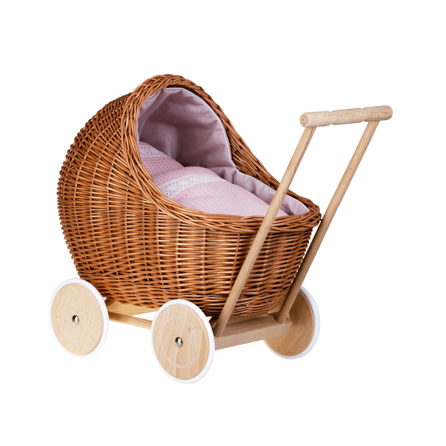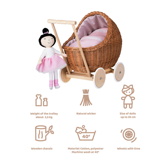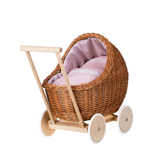 Lili wiklinowy wózek dla lalek z różowym obszyciem, kołderką i poduszką TheWickerStories