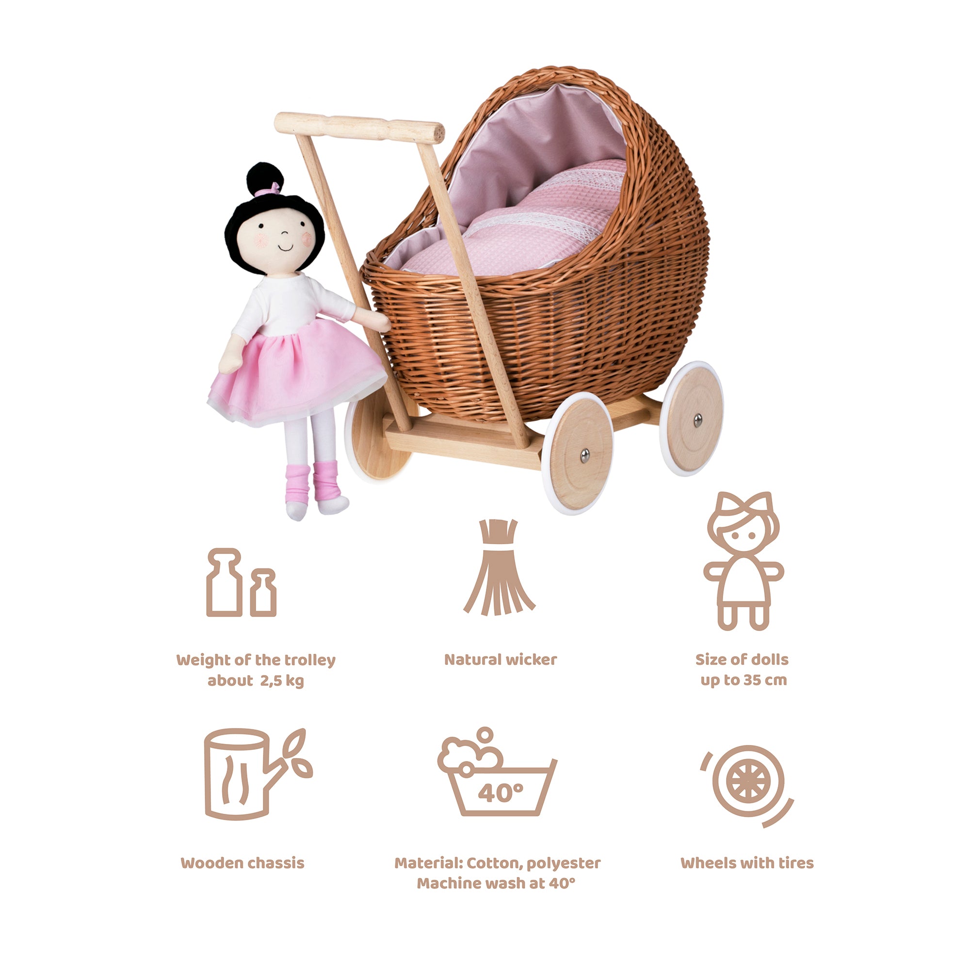 Specyfikacja Twojego Lili wiklinowy wózek dla lalek z różowym obszyciem, kołderką i poduszką TheWickerStories