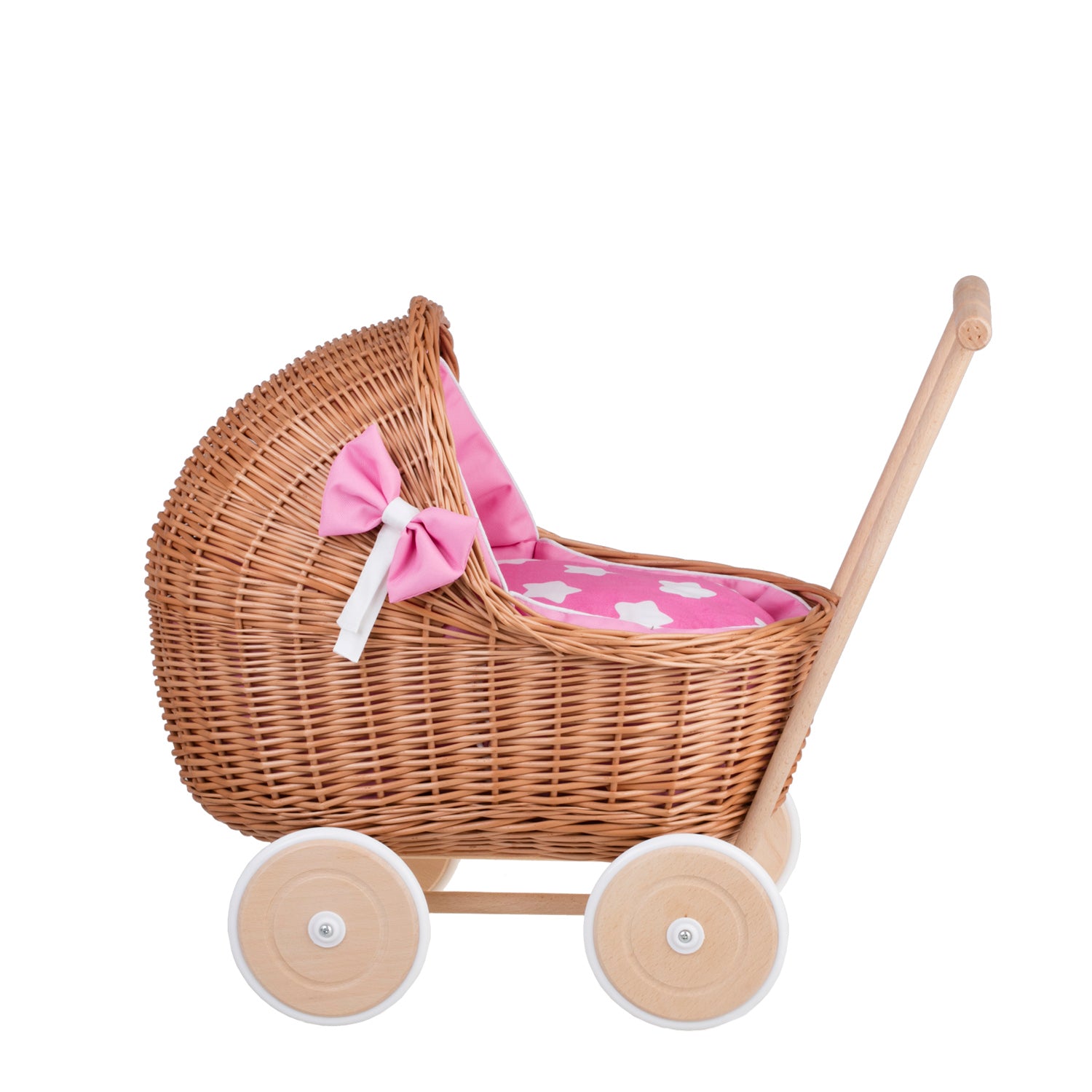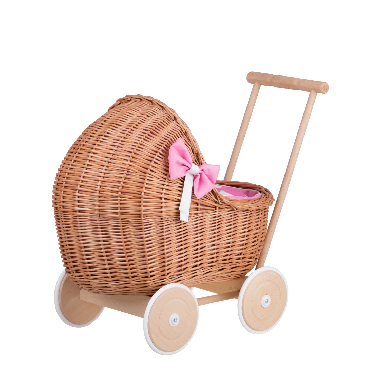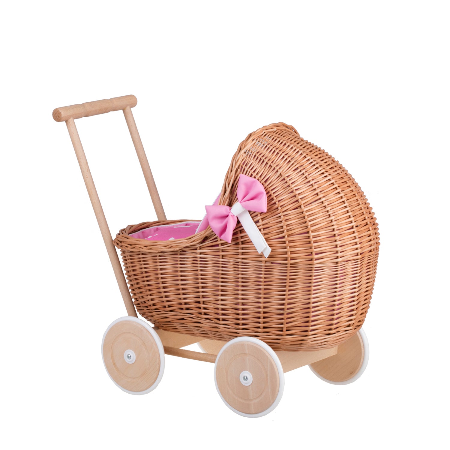 Lili wiklinowy wózek dla lalek z różowym obszyciem, kołderką i poduszką TheWickerStories