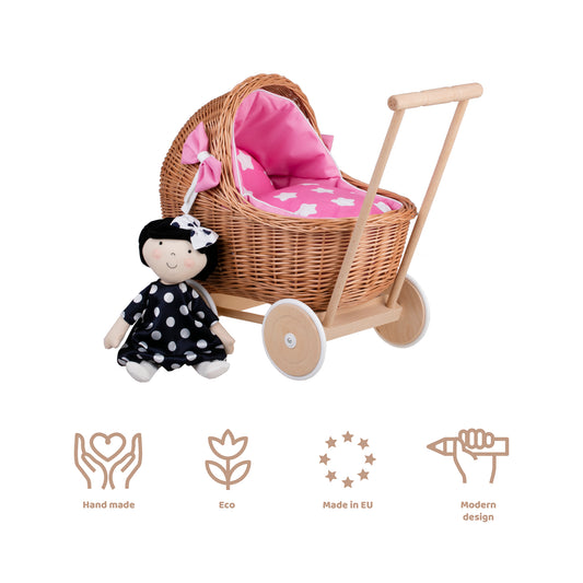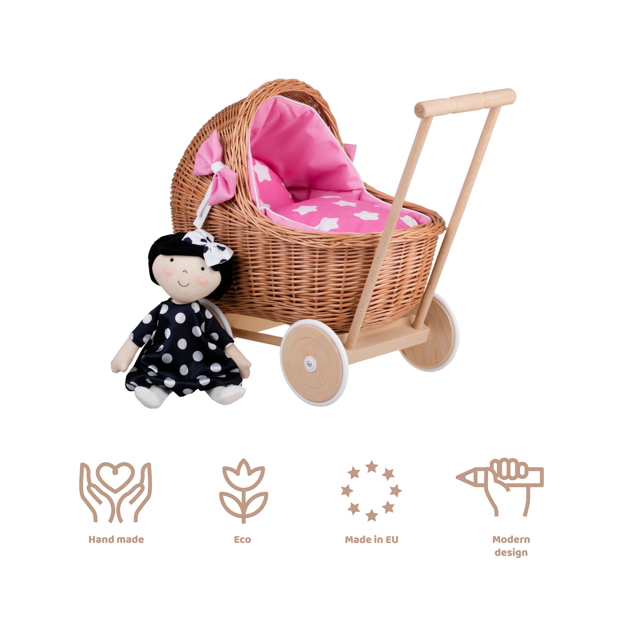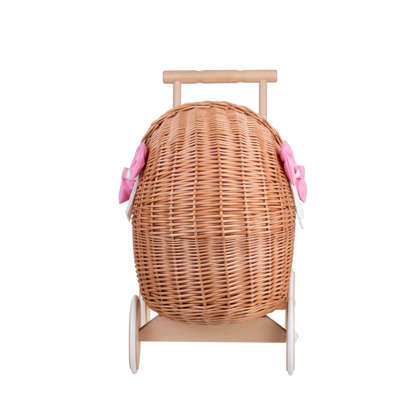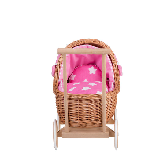 Lili wiklinowy wózek dla lalek z różowym obszyciem, kołderką i poduszką TheWickerStories