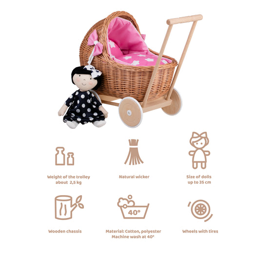 Specyfikacja Twojego Lili wiklinowy wózek dla lalek z różowym obszyciem, kołderką i poduszką TheWickerStories