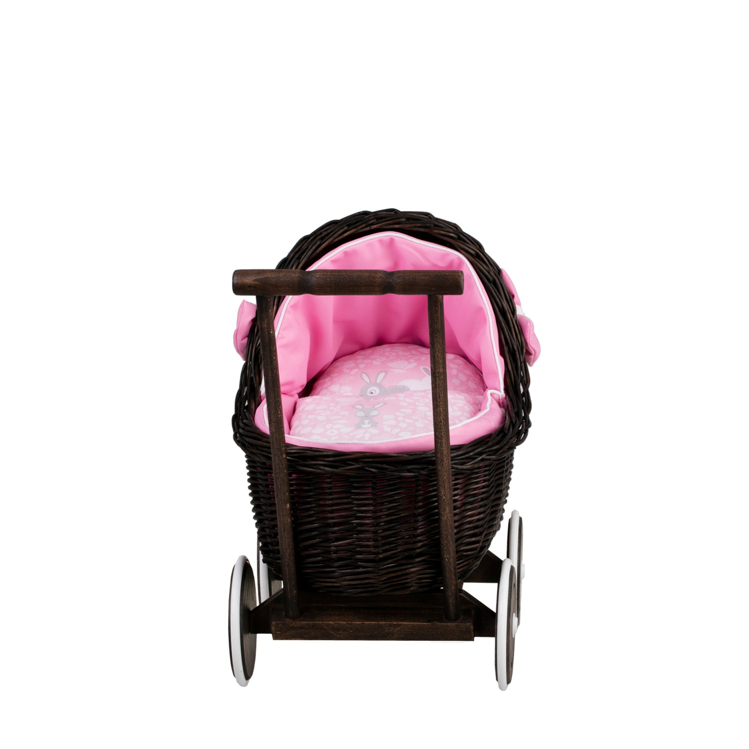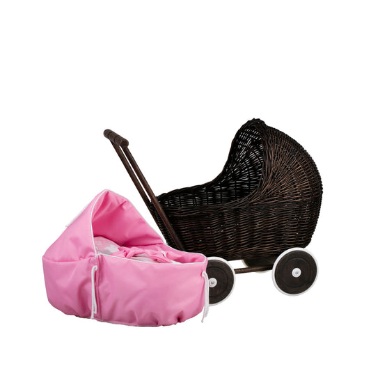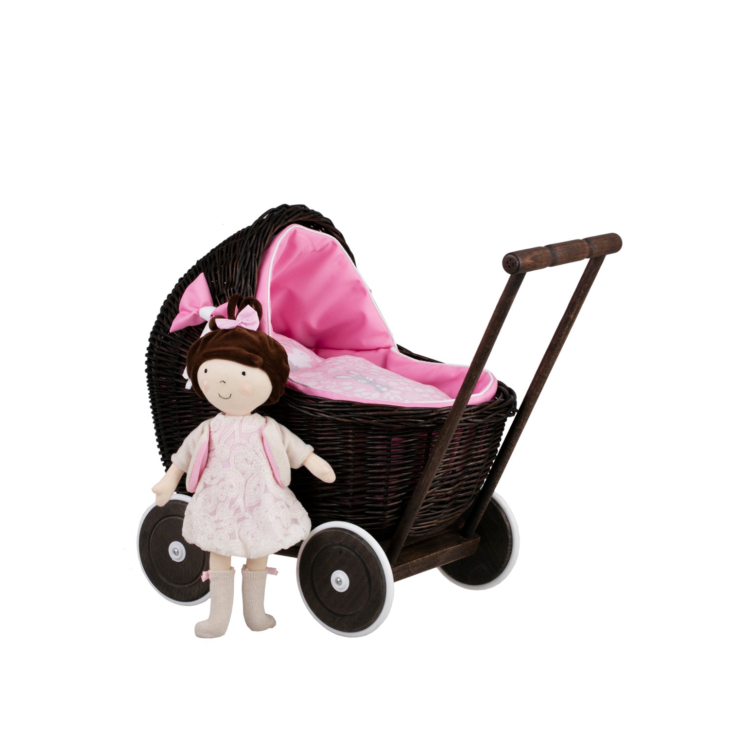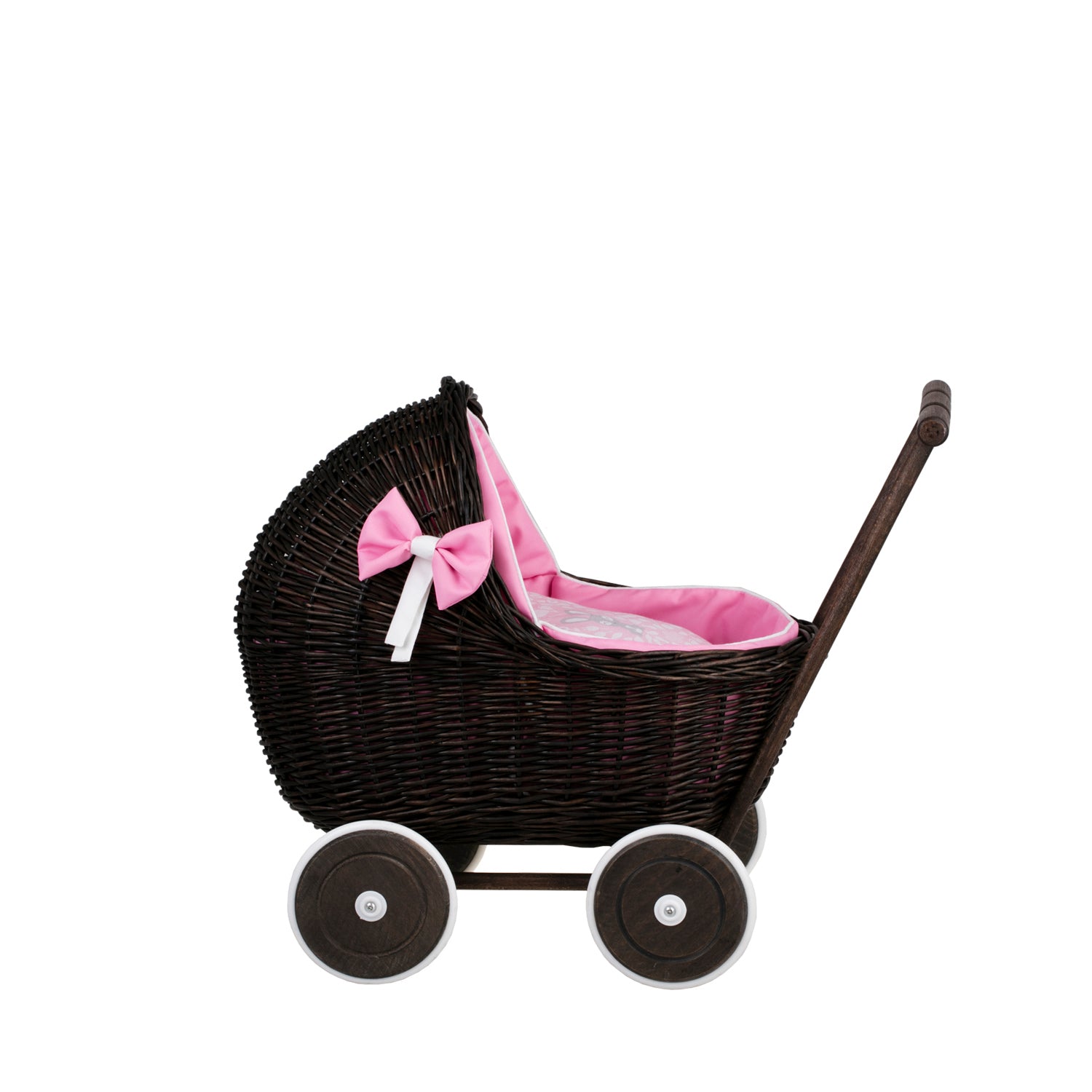 Lili wiklinowy wózek dla lalek z różowym obszyciem, kołderką i poduszką TheWickerStories