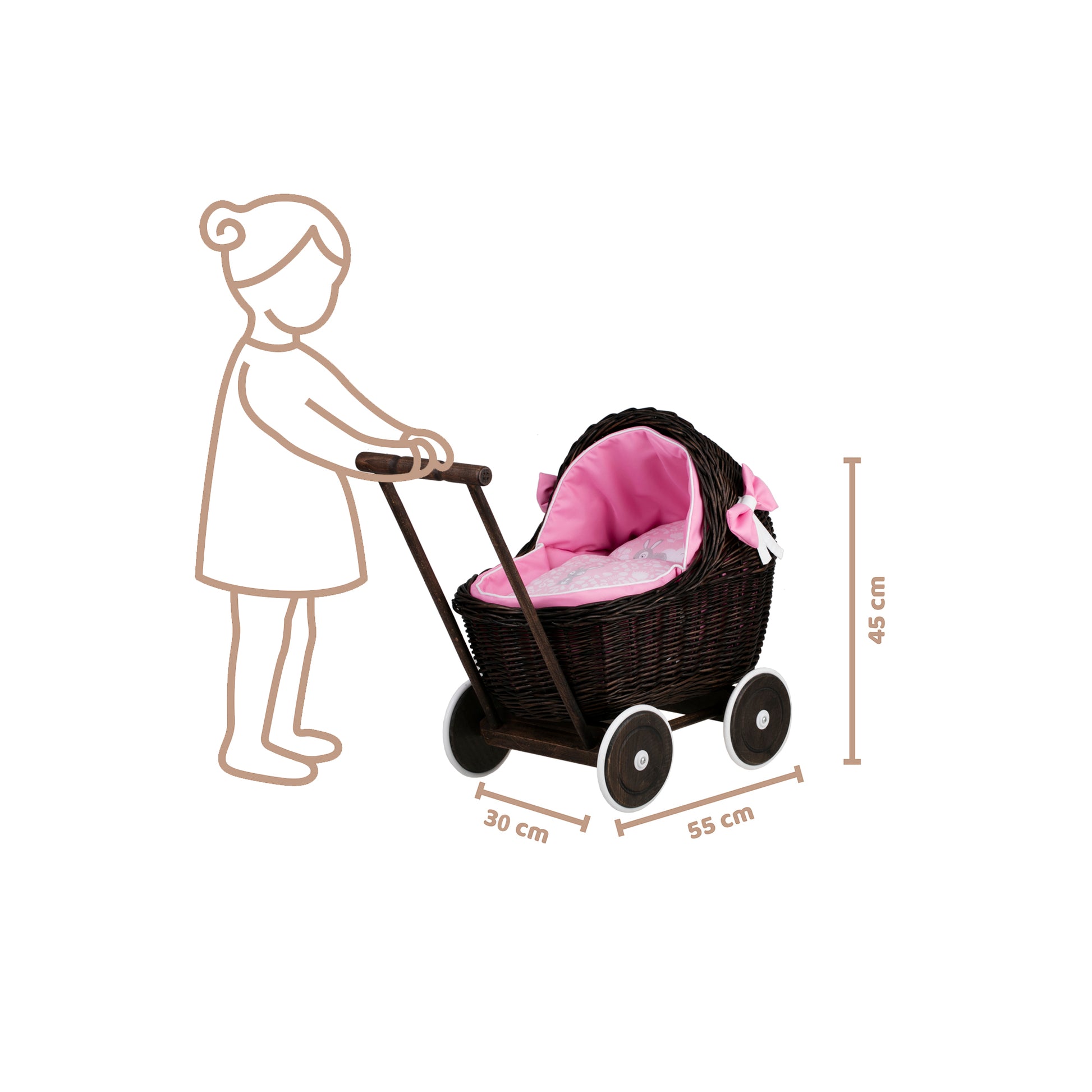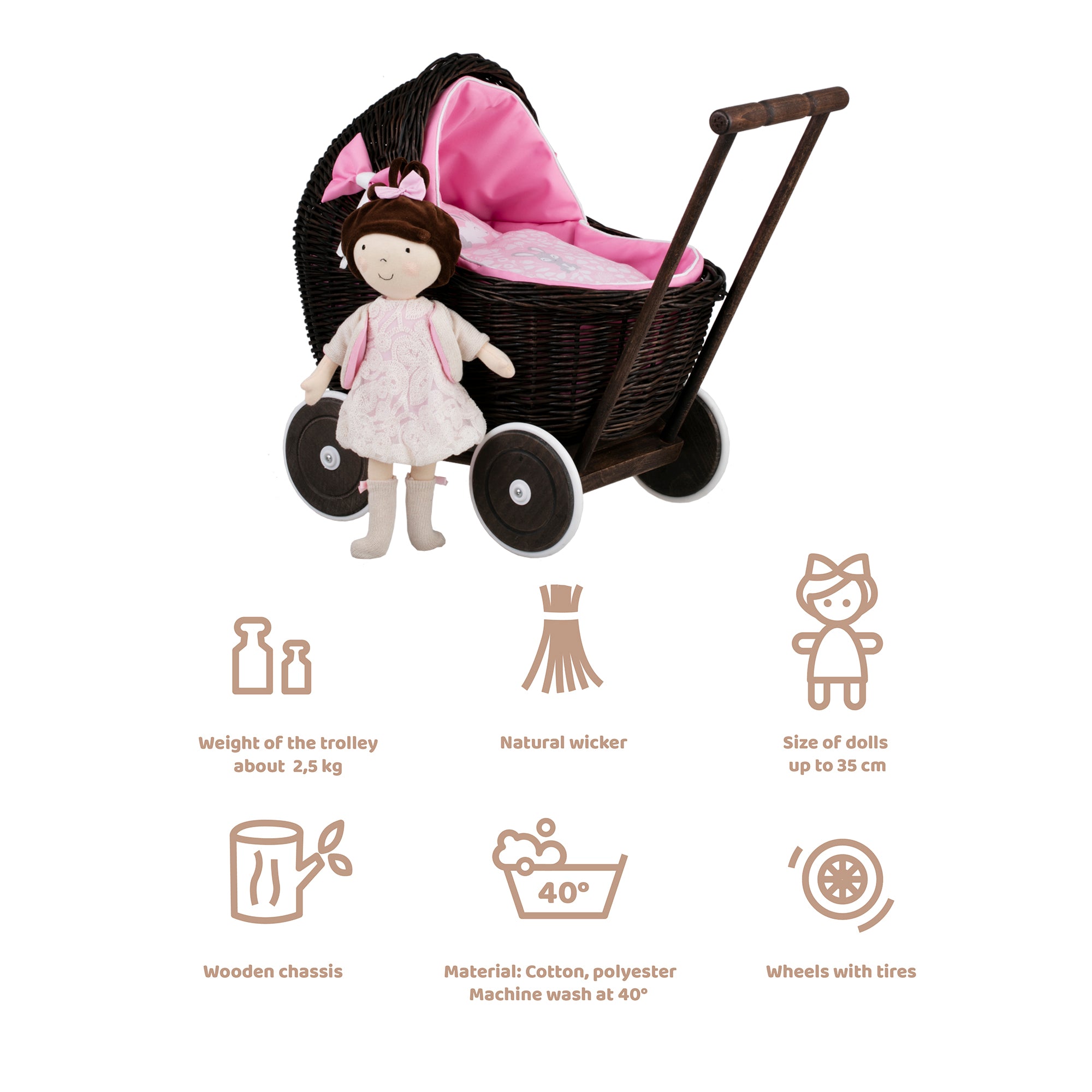 Specyfikacja Twojego Lili wiklinowy wózek dla lalek z różowym obszyciem, kołderką i poduszką TheWickerStories
