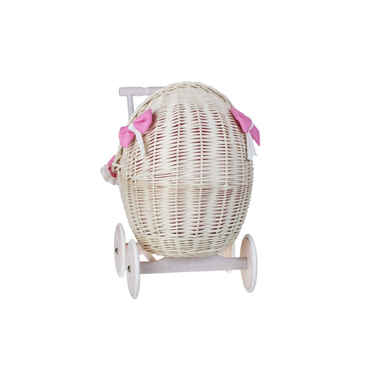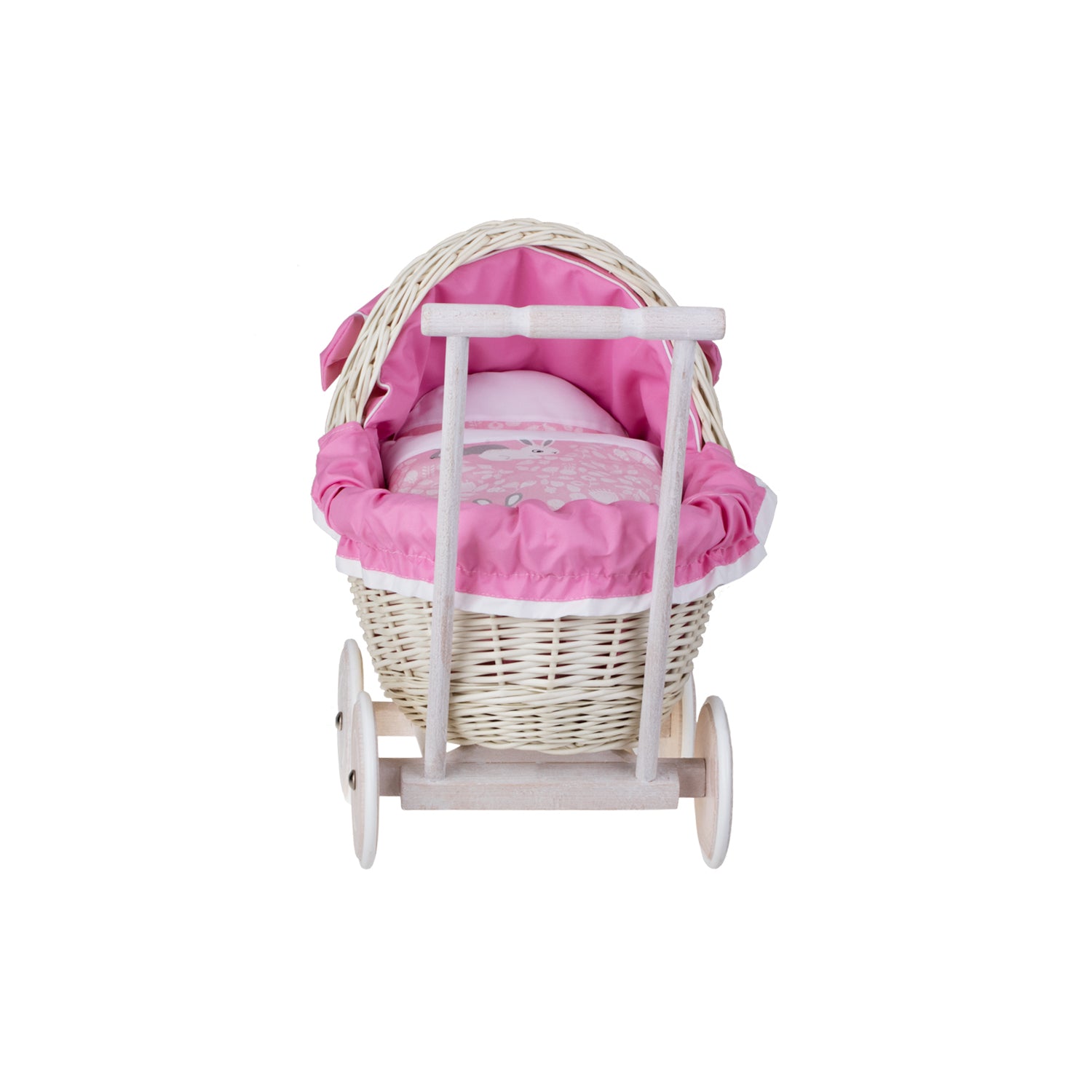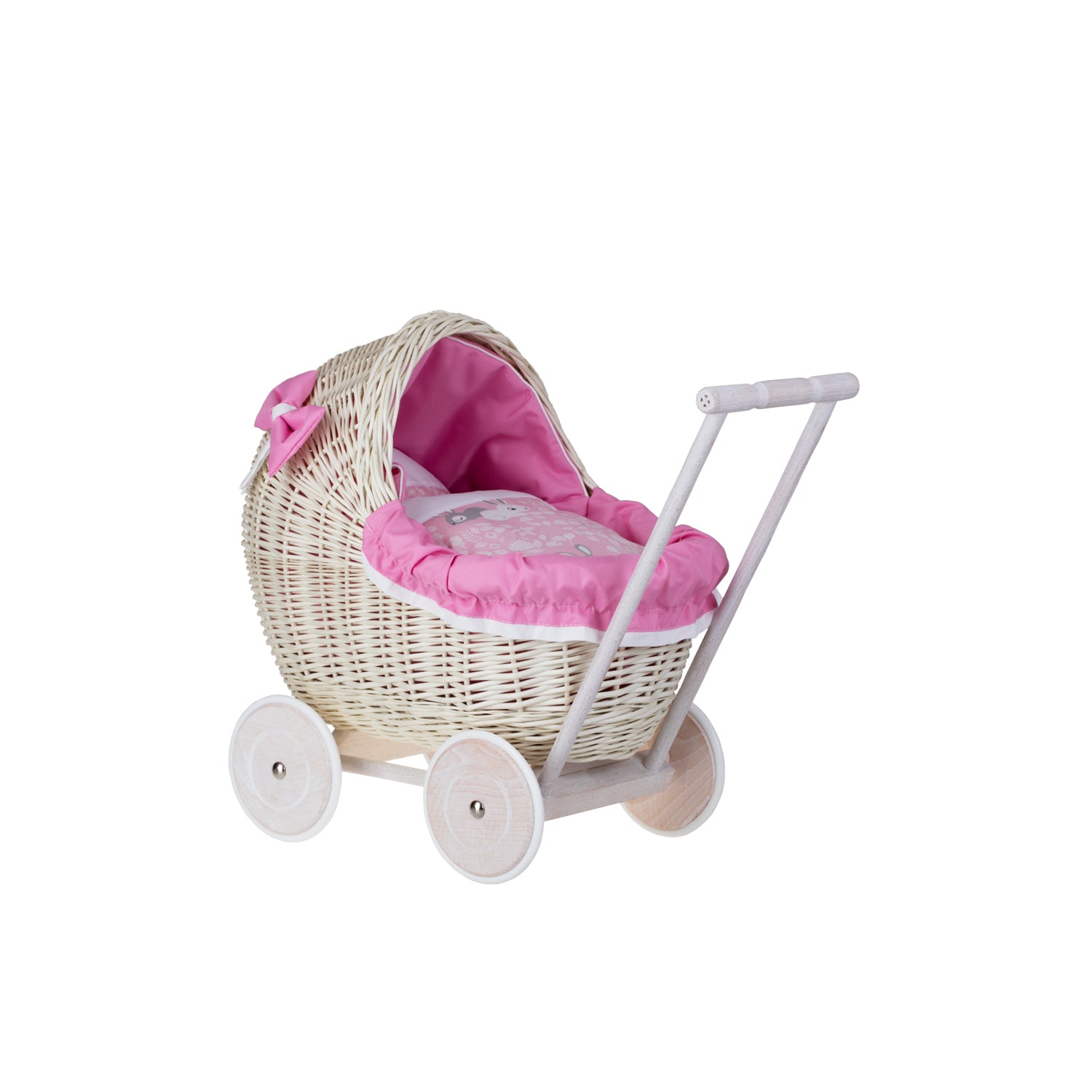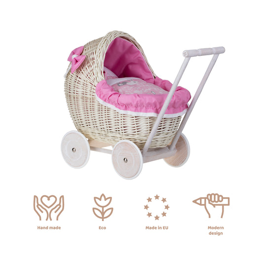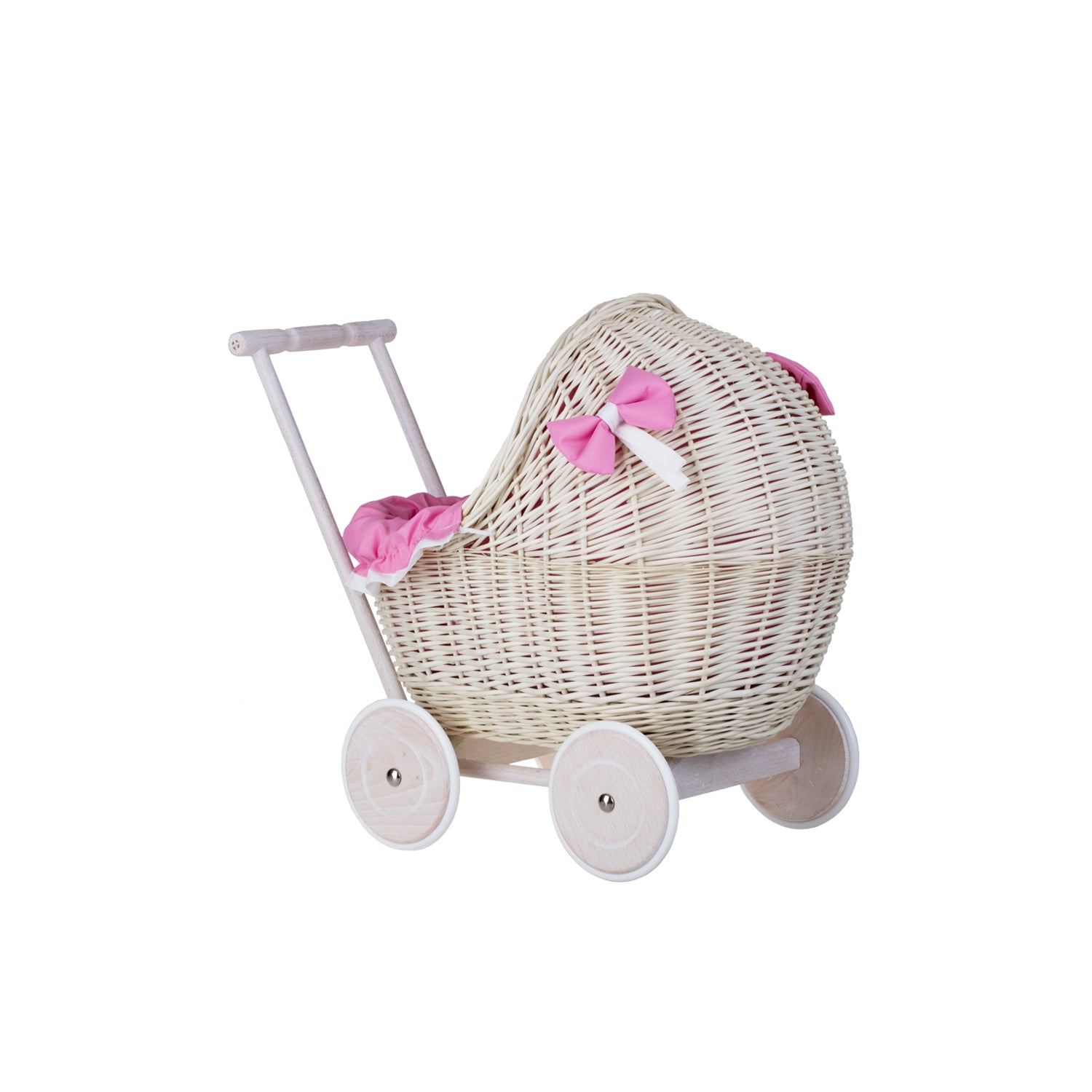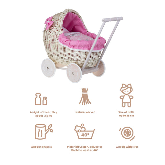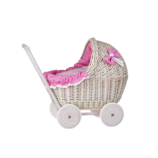 Lili wiklinowy wózek dla lalek z różowym obszyciem, kołderką i poduszką TheWickerStories