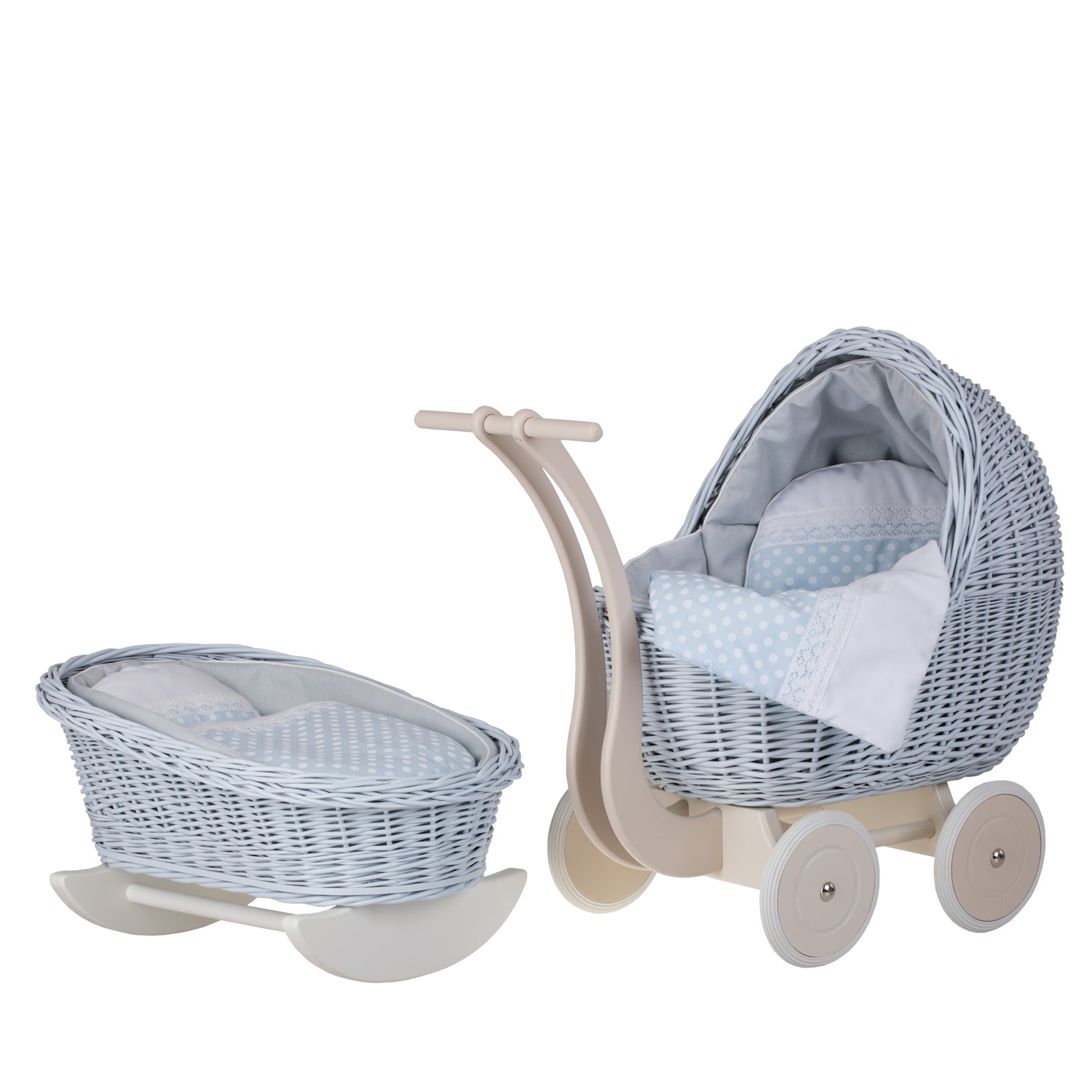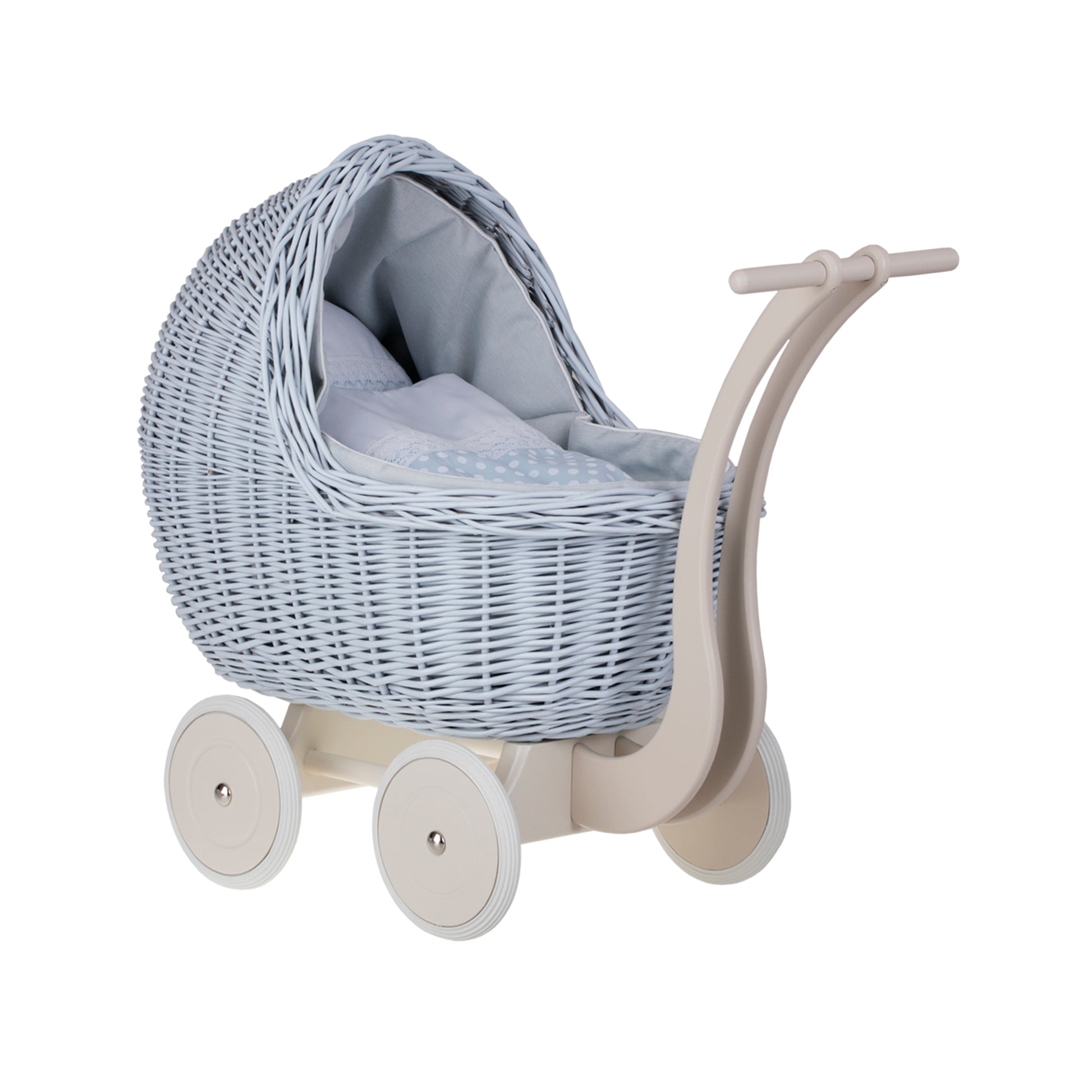 Lili wiklinowy wózek i kołyska dla lalek z niebieskim obszyciem, kołderką i poduszką TheWickerStories