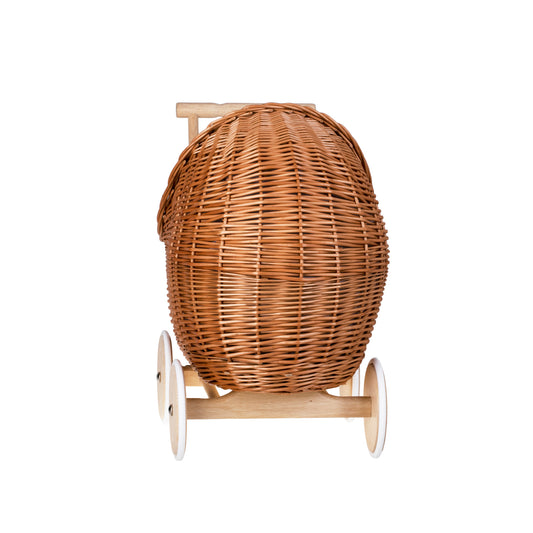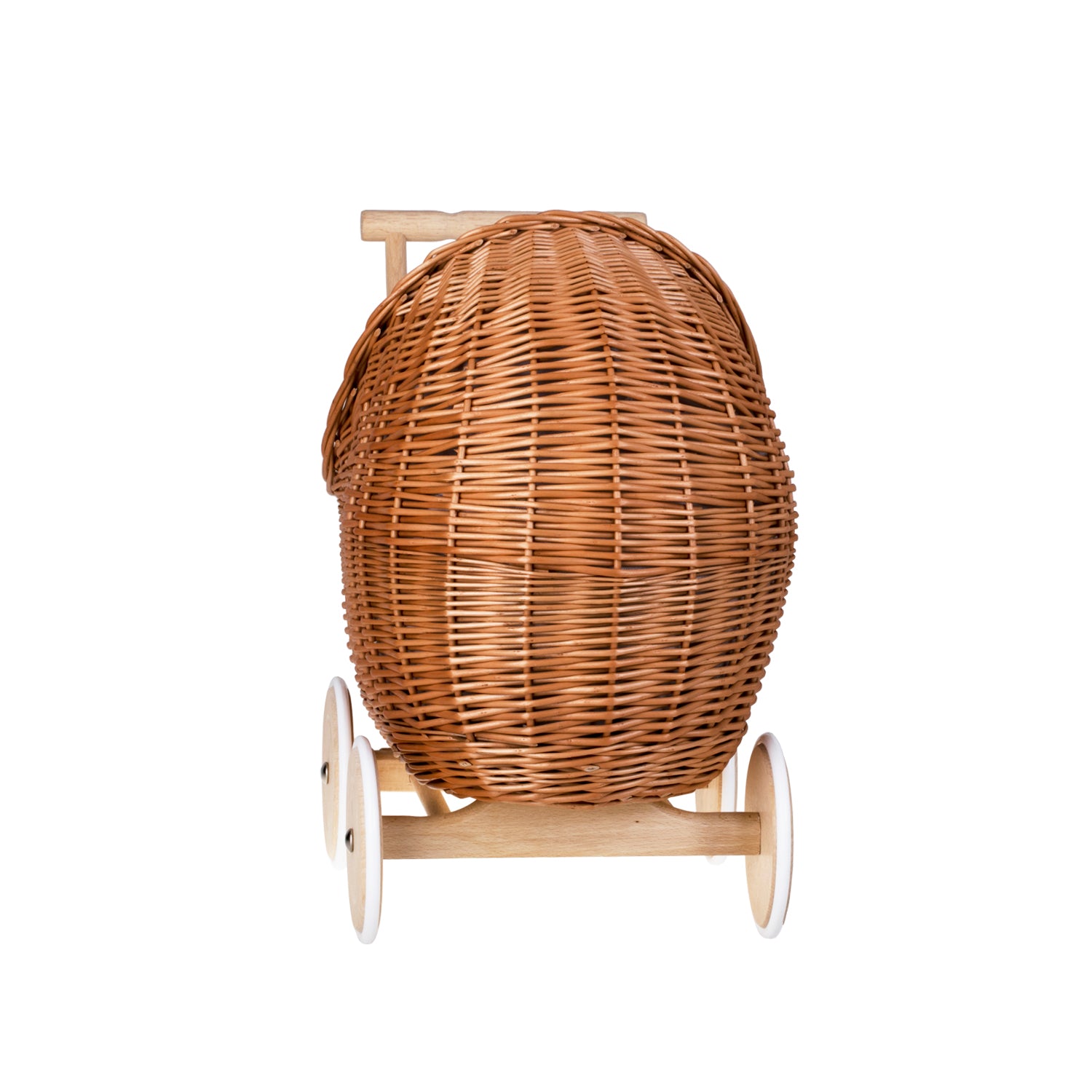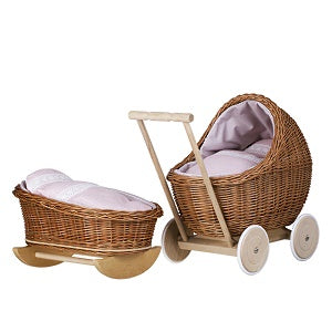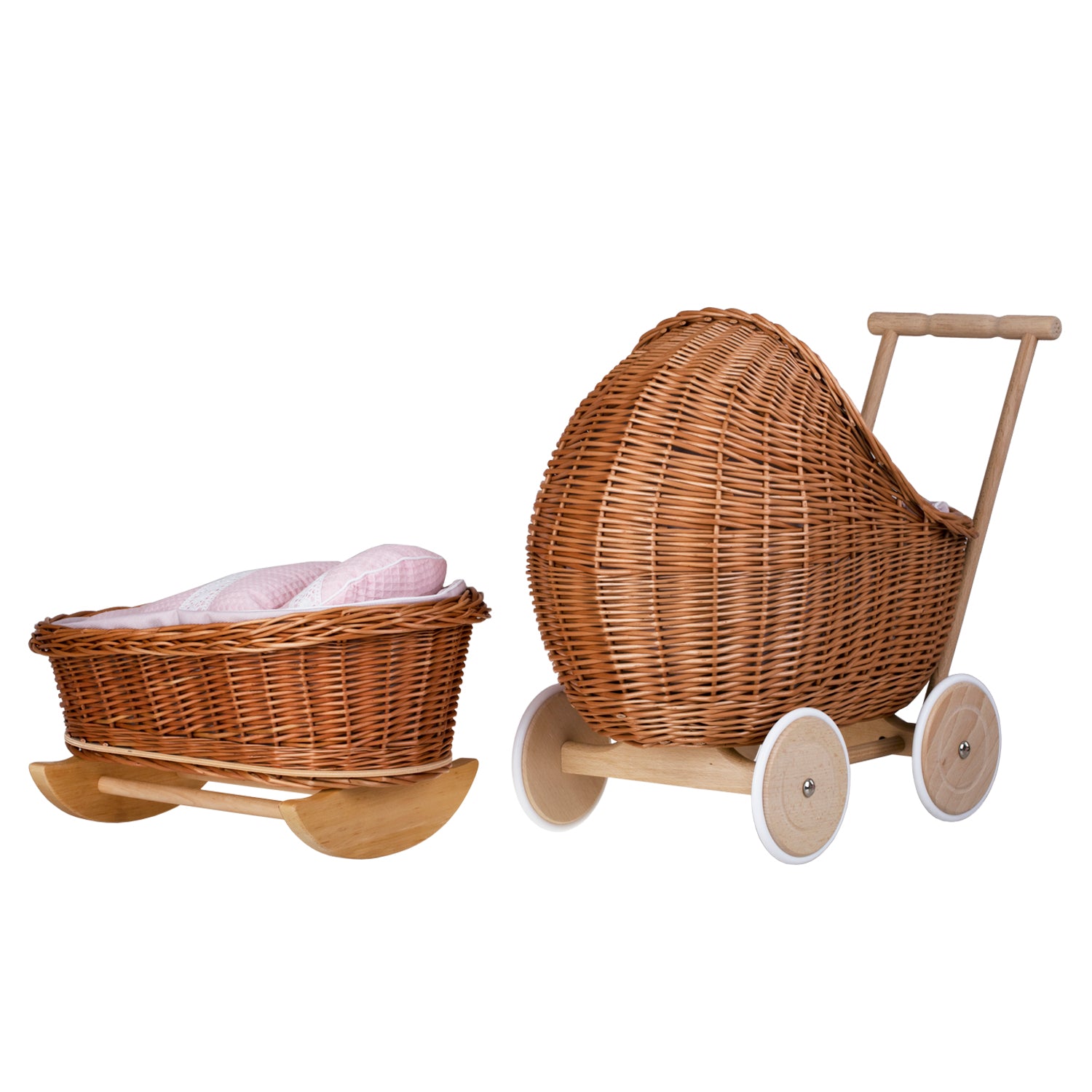 Lili wiklinowy wózek i kołyska dla lalek z różowym obszyciem, kołderką i poduszką TheWickerStories