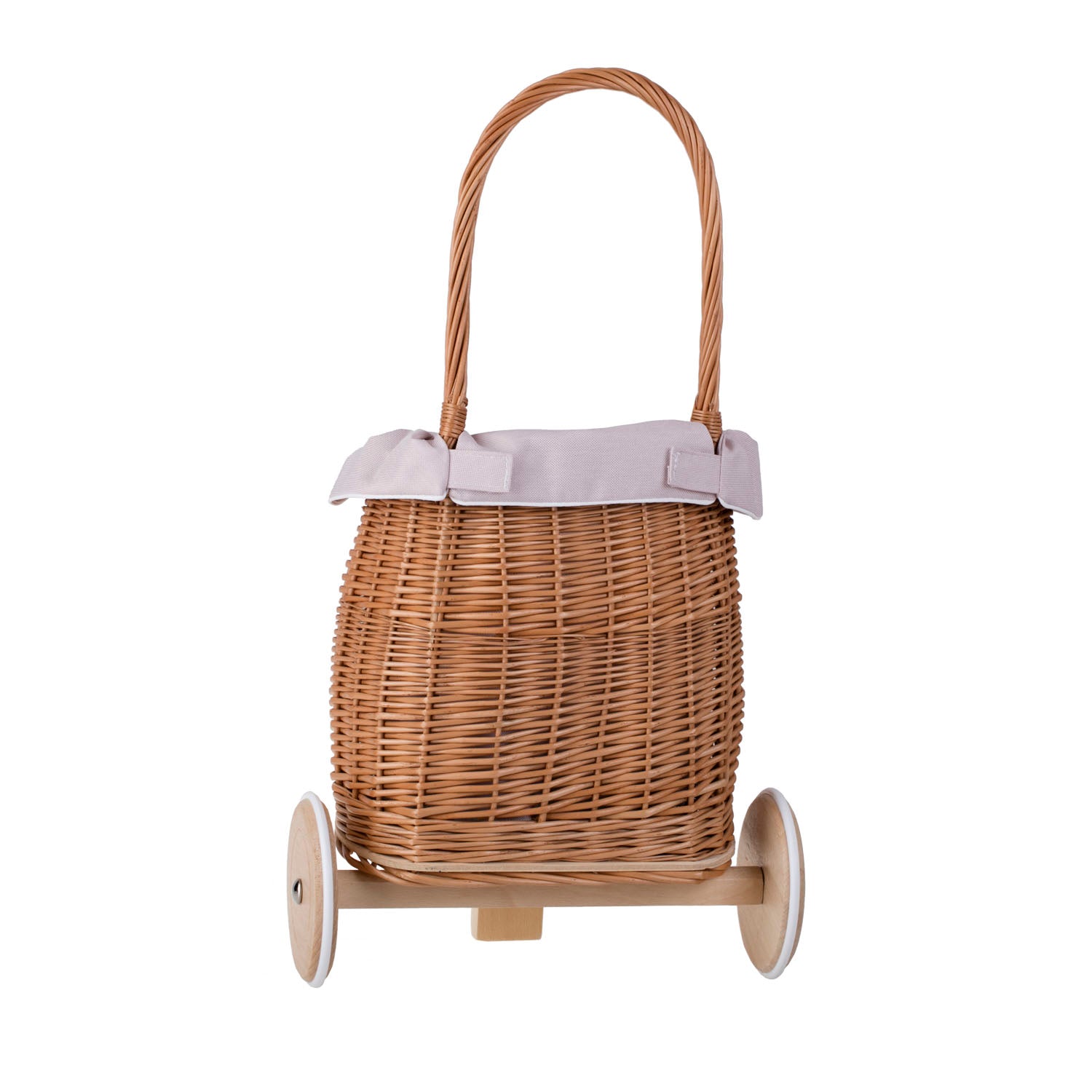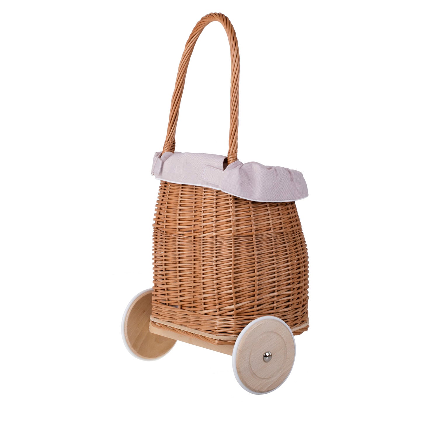 Luke wiklinowy wózek dla dzieci z różowym obszyciem, z rączką i drewnianymi kołami TheWickerStories