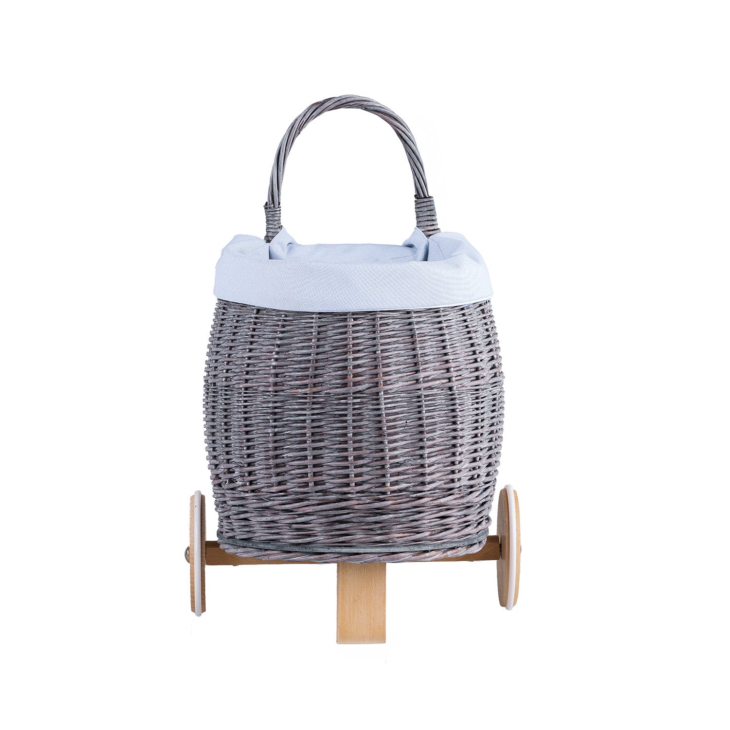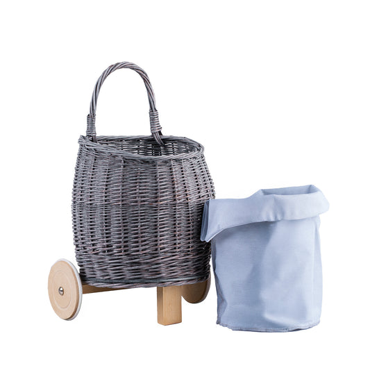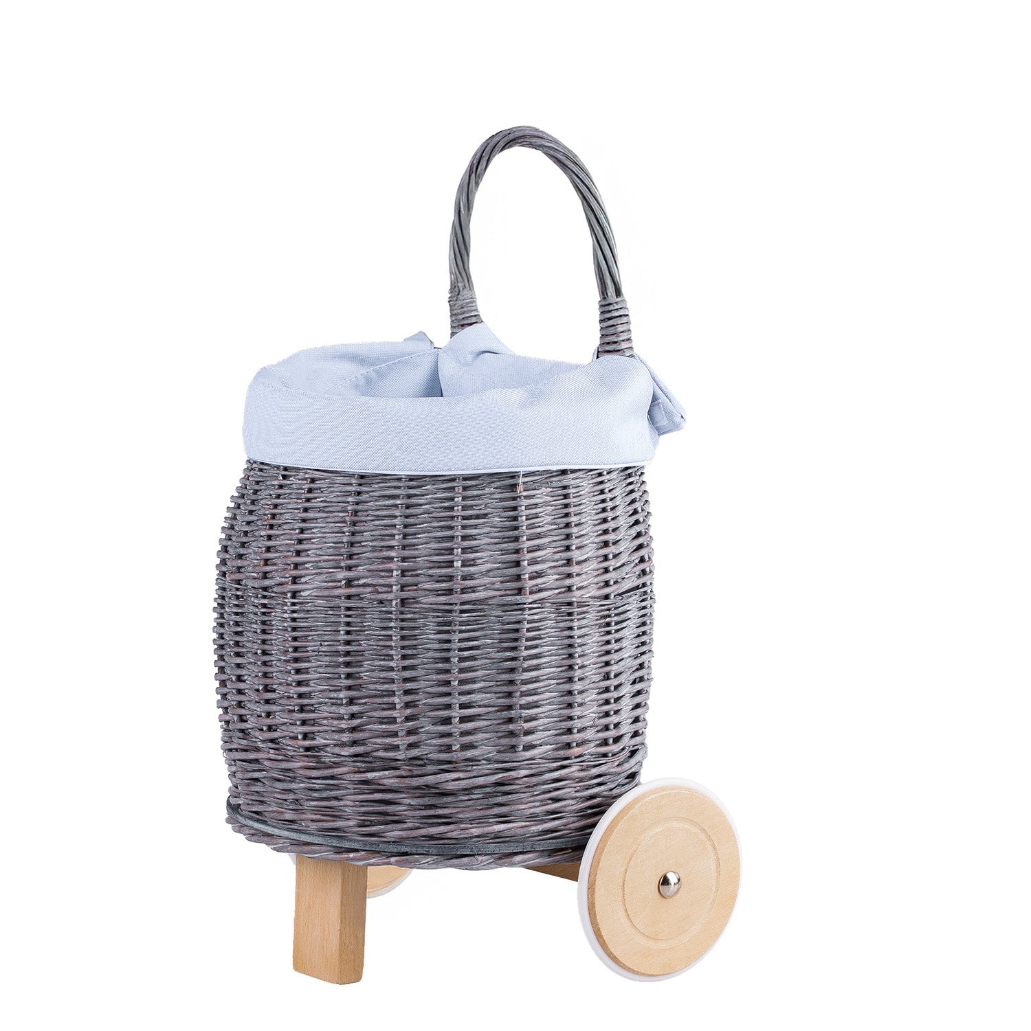 Wybierz naturalny, ręcznie pleciony wózek z błękitnym obszyciem i podaruj dziecku ekologiczny prezent, który bawi, uczy i pomaga utrzymać porządek.