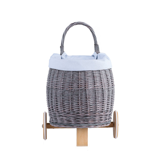 Elegancki wiklinowy wózek dla dzieci zachwyca równą, gęstą plecionką i dopracowanymi detalami. Wysoki kosz wykończono miękkim, błękitnym obszyciem, które chroni skarby przed obiciami i dodaje uroku. Wyplatany uchwyt pewnie leży w dłoni, a dwa duże drewniane koła oraz stabilne nóżki gwarantują płynne toczenie i bezpieczne odstawienie wózka, gdy zabawa dobiega końca.