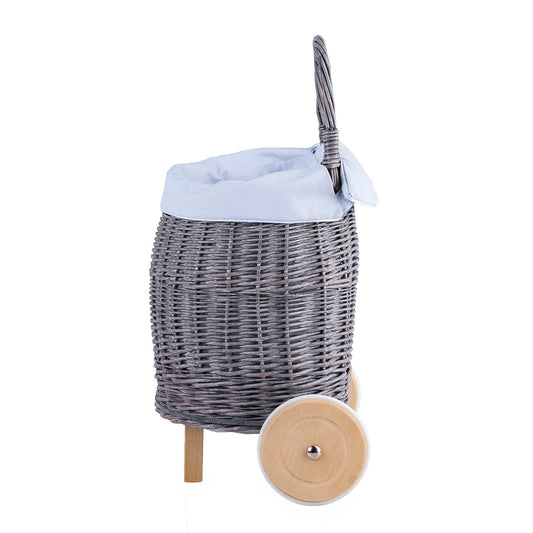 Luke wiklinowy wózek dla lalek i zabawek z błękitnym obszyciem, z rączką i drewnianymi kołami TheWickerStories