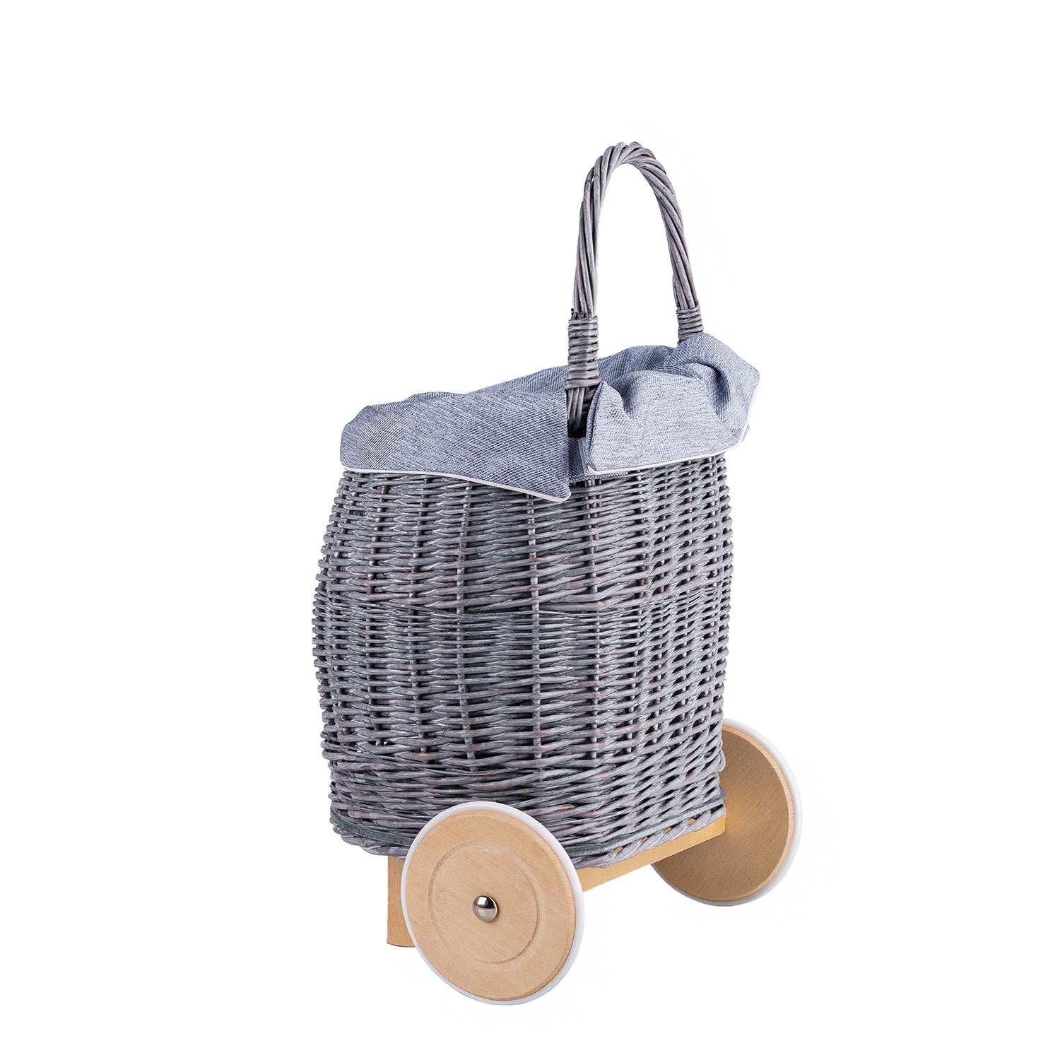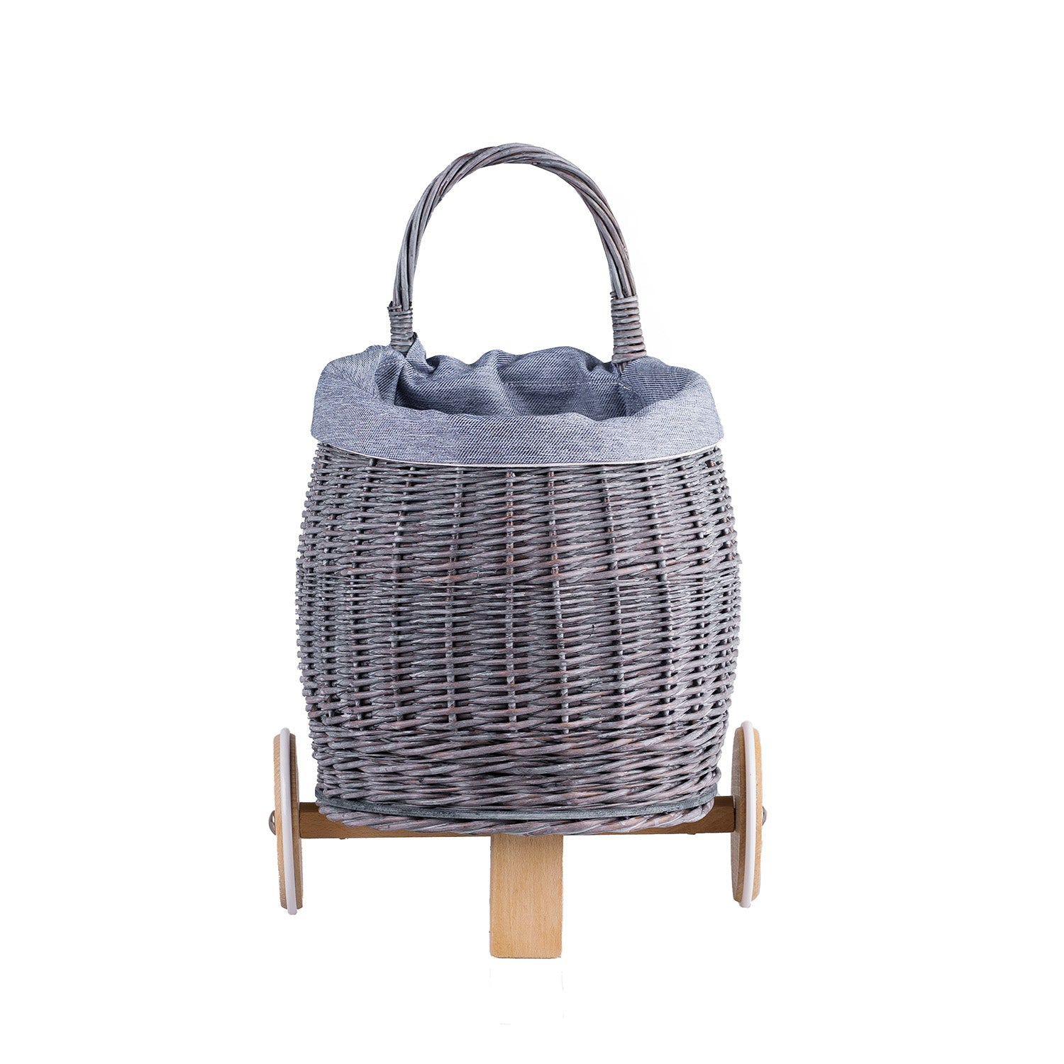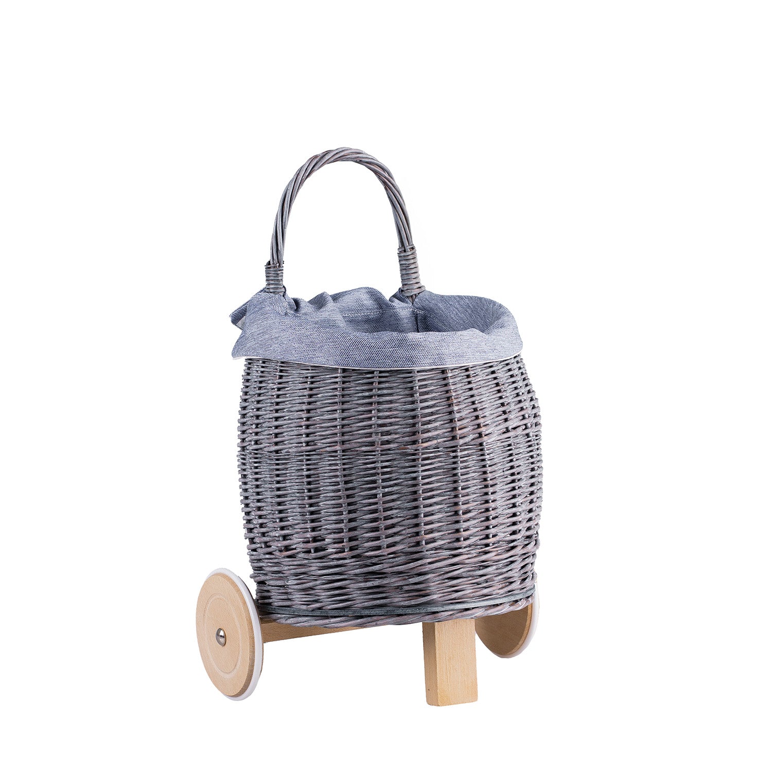 Stabilna konstrukcja z drewnianymi kołami ułatwia manewrowanie i poruszanie się po różnych powierzchniach, a lekka wiklina pozwala dziecku samodzielnie sterować wózkiem. Produkt pomaga w rozwijaniu koordynacji i siły mięśni, wspiera naukę chodzenia i zachęca do kreatywnej zabawy. W pokoju dziecka z powodzeniem pełni rolę kosza do przechowywania.