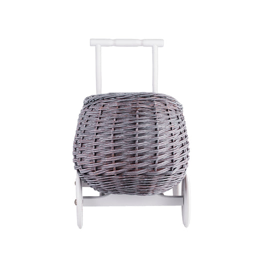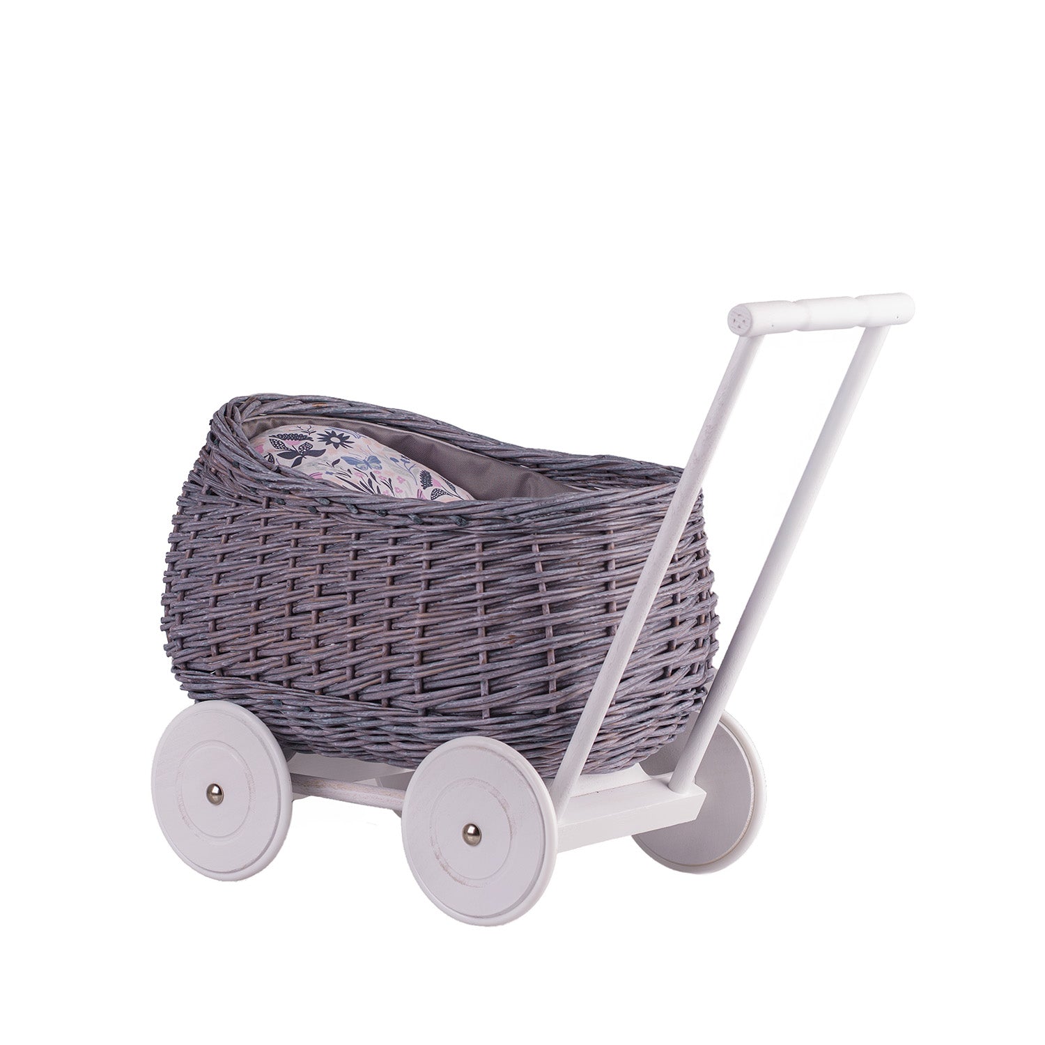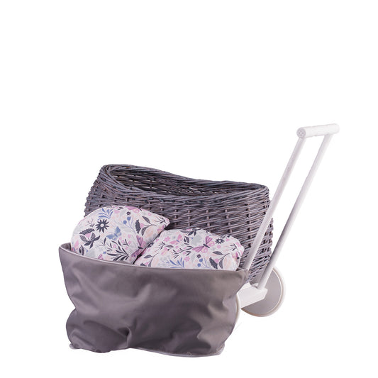 Luke wiklinowy wózek pchacz z szarym obszyciem i poduszką TheWickerStories