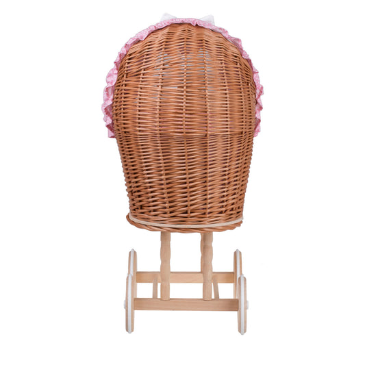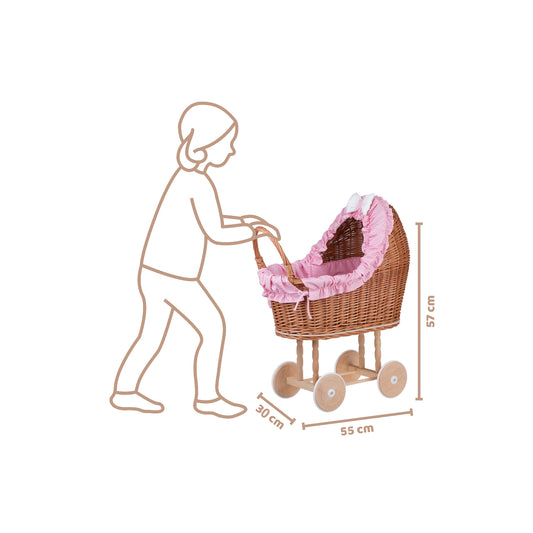 Ten elegancki wózek dla lalek z naturalnej wikliny zachwyca starannym, równym splotem i ponadczasowym charakterem. Różowe, zdejmowane obszycie miękko otula krawędzie i tworzy dekoracyjną falbankę, a subtelne kokardy dodają mu przytulnego uroku. Zintegrowana rączka ułatwia prowadzenie, a solidna drewniana podstawa z czterema kołami podkreśla klasyczny styl zabawki. Wnętrze kosza wygodnie mieści ulubioną lalkę lub maskotkę oraz drobne akcesoria do zabawy.