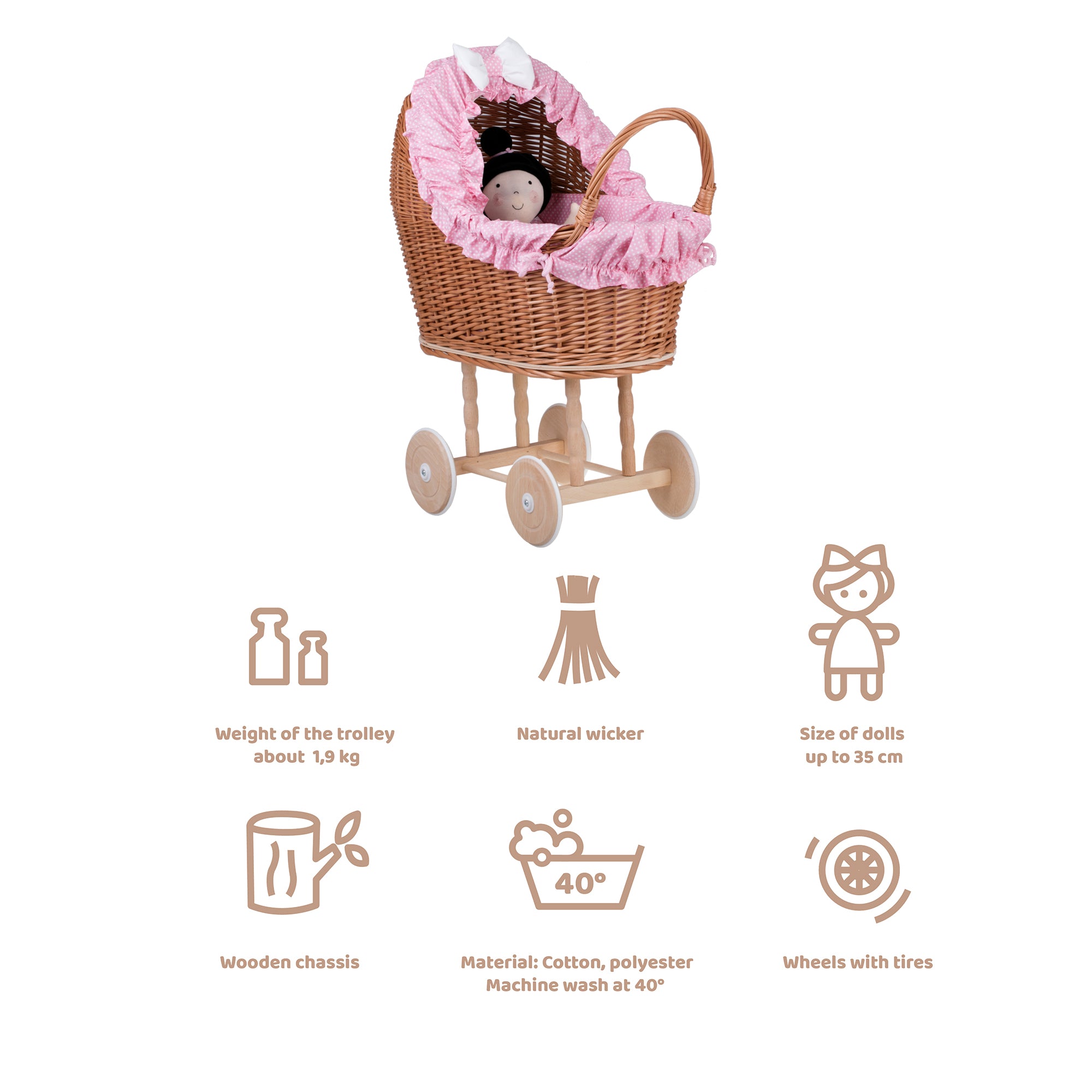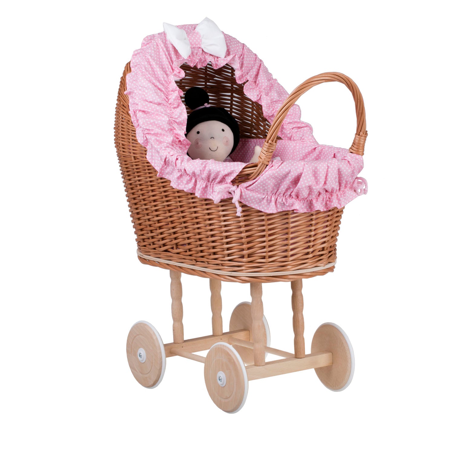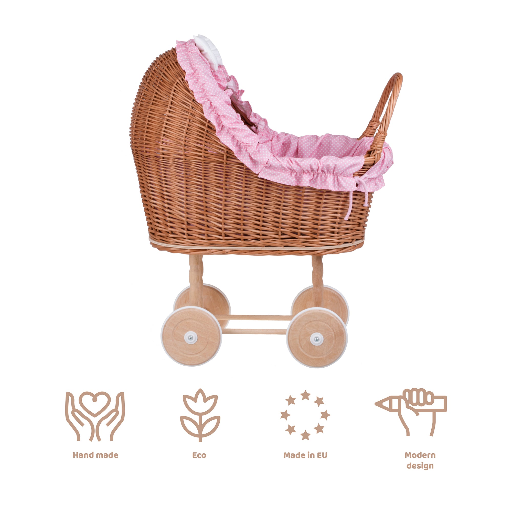 Lulu wiklinowy wózek dla lalek z różowym obszyciem, kołderką i poduszką TheWickerStories