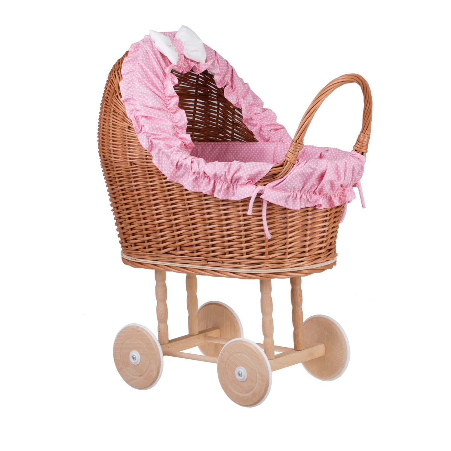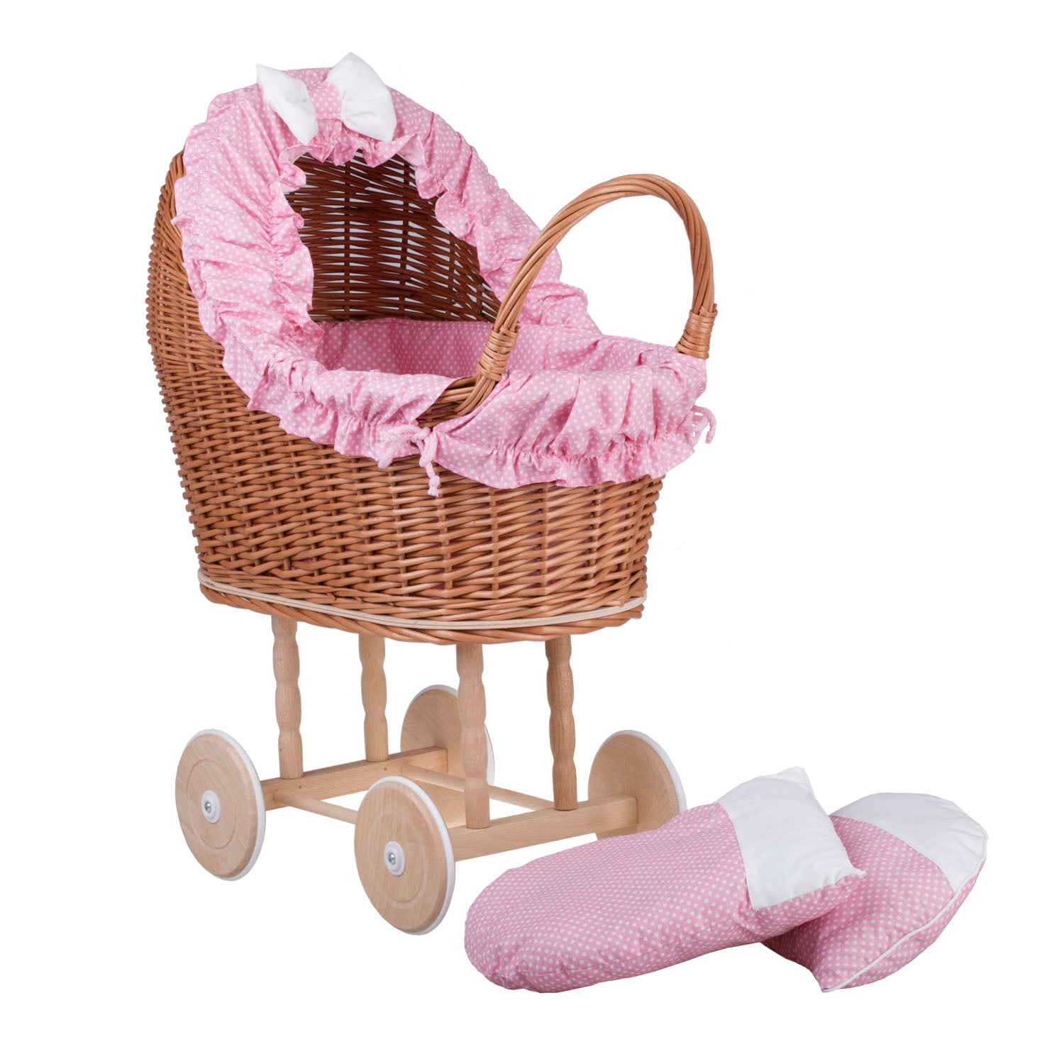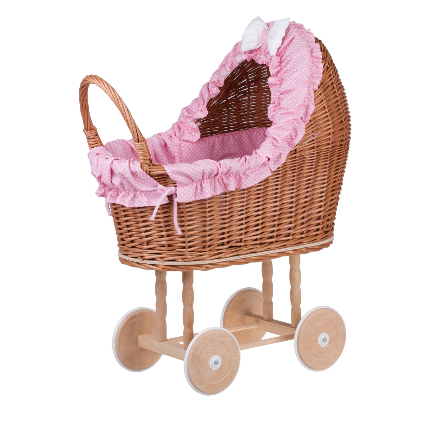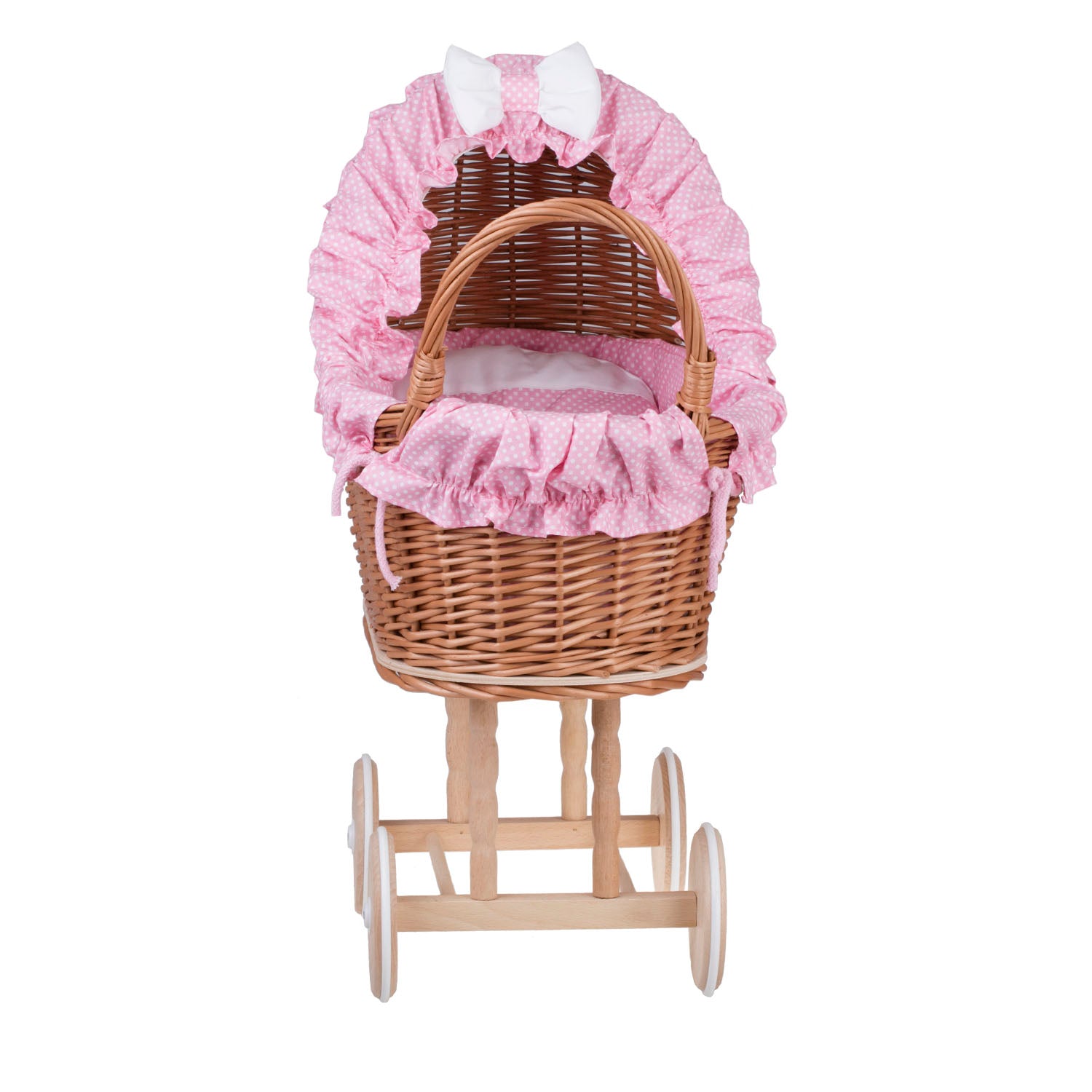 Lulu wiklinowy wózek dla lalek z różowym obszyciem, kołderką i poduszką TheWickerStories