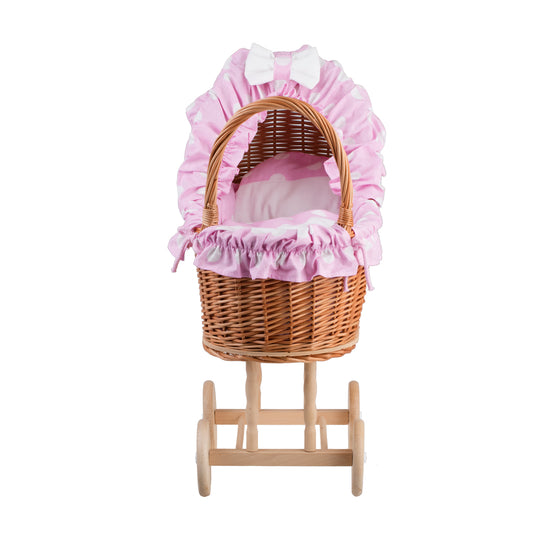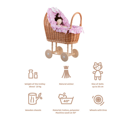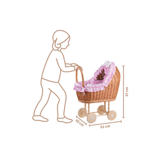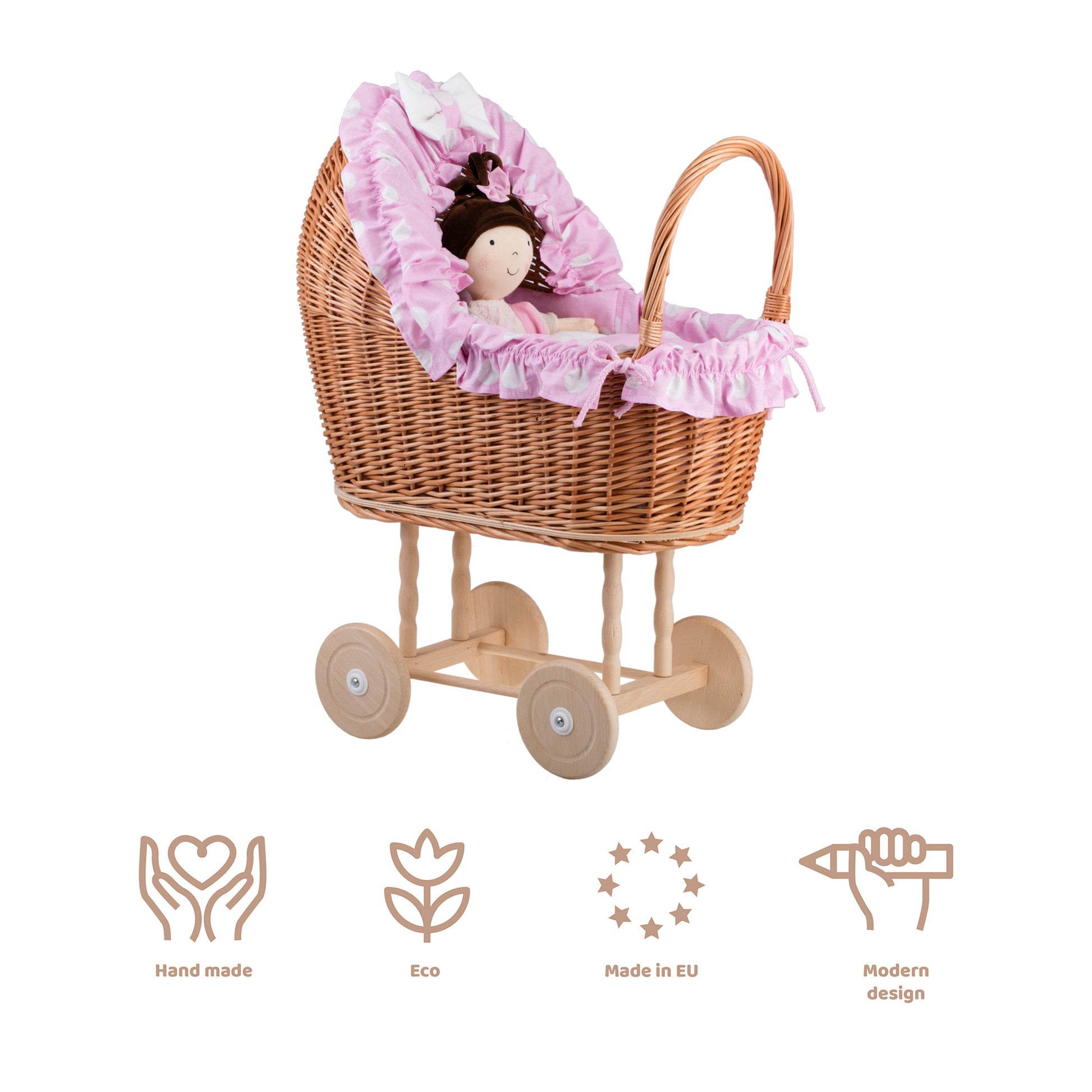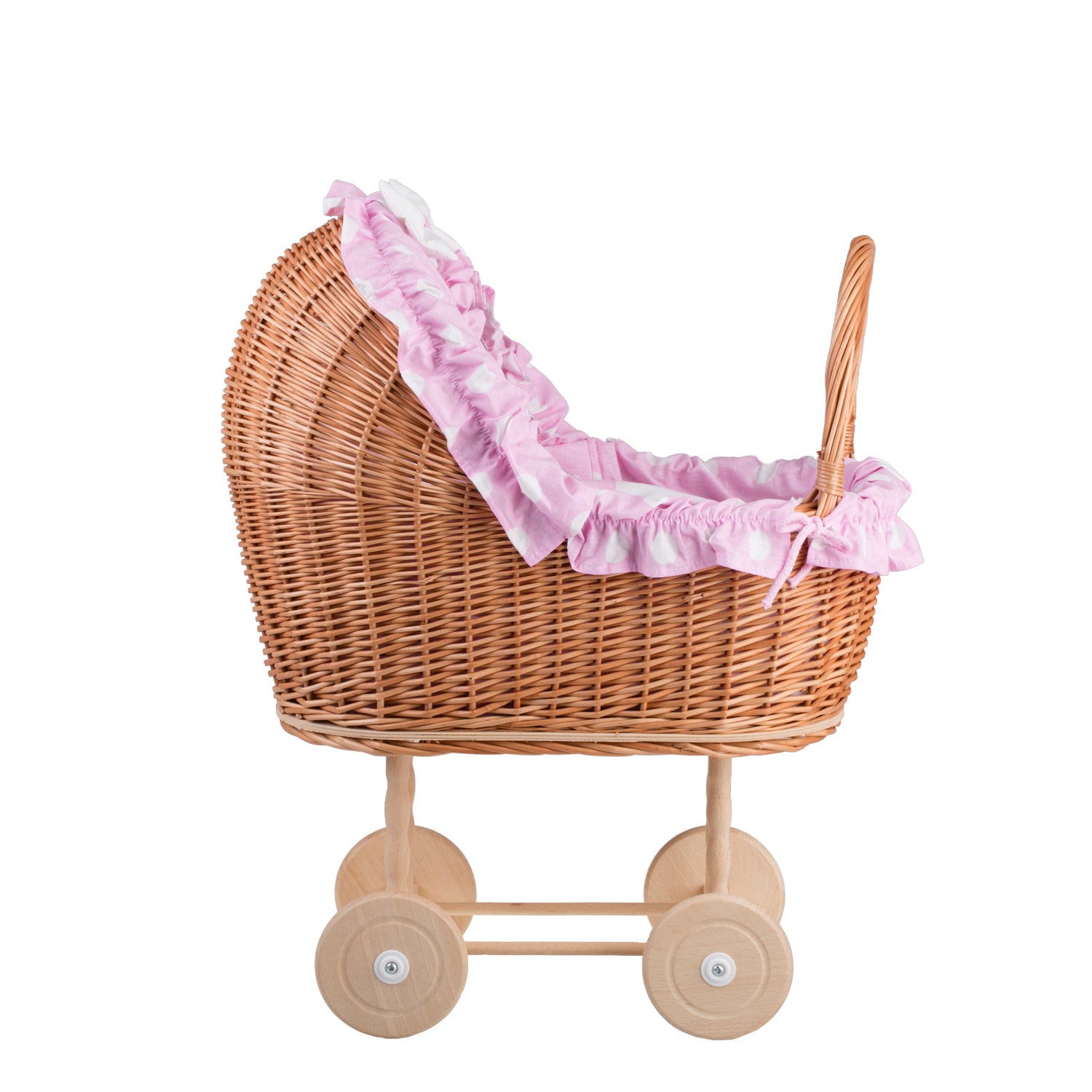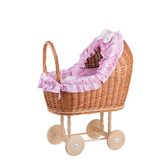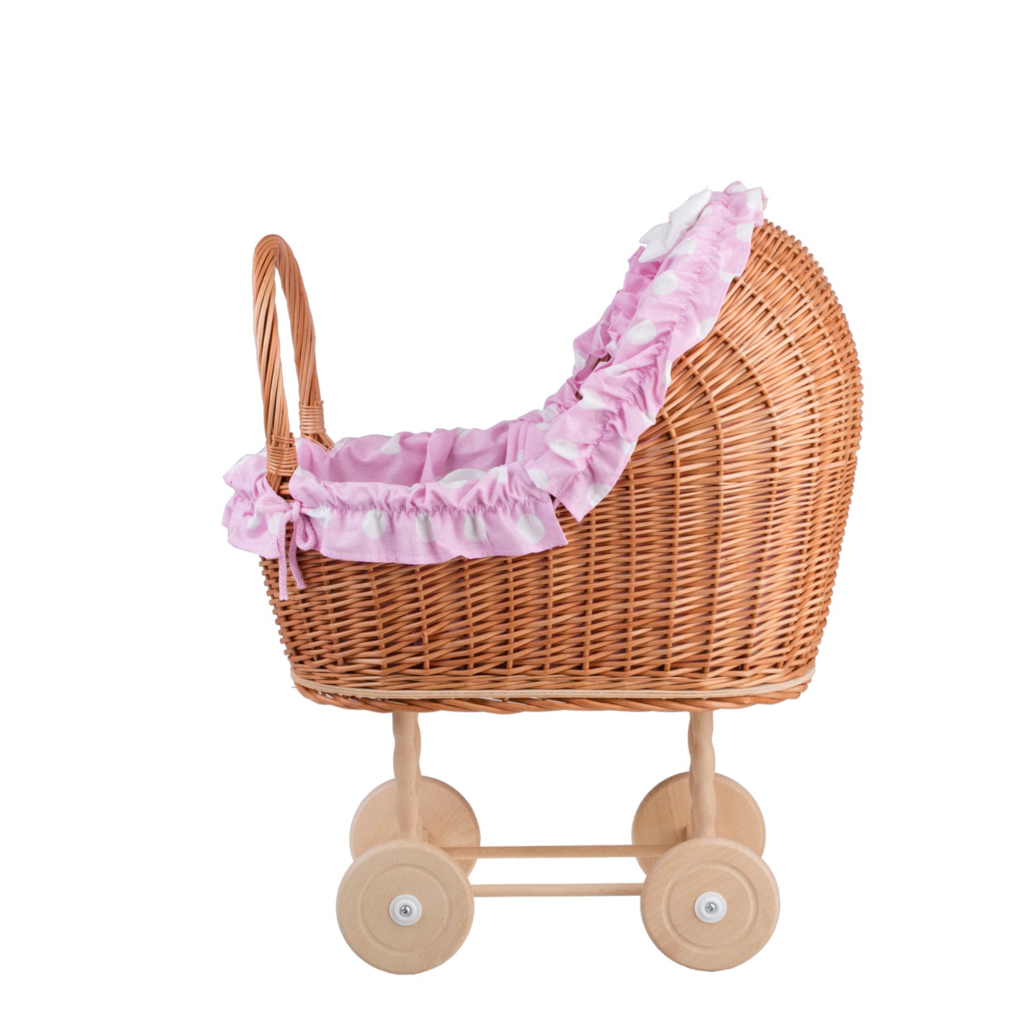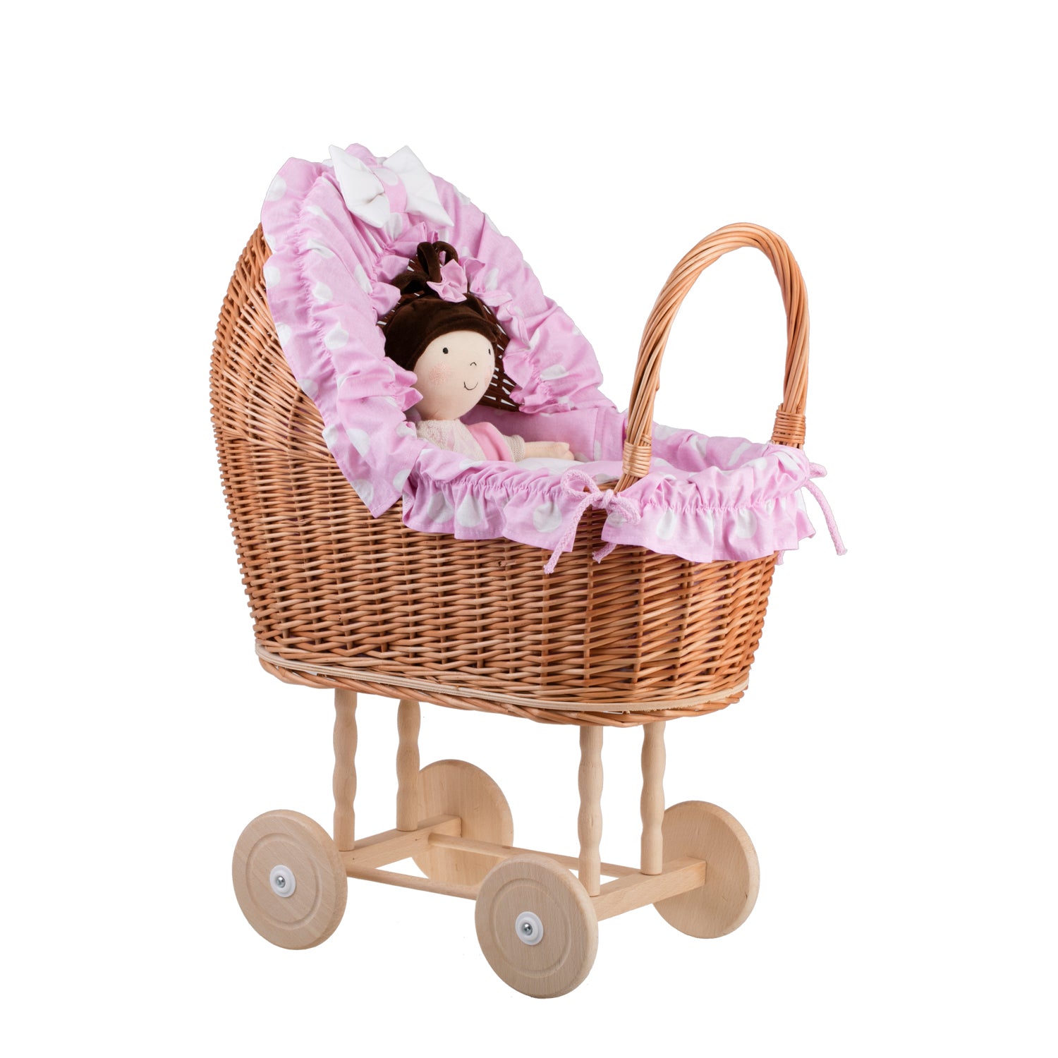 Lulu wiklinowy wózek dla lalek z różowym obszyciem, kołderką i poduszką TheWickerStories