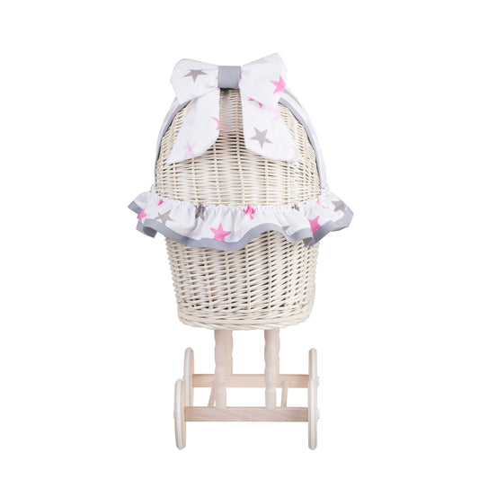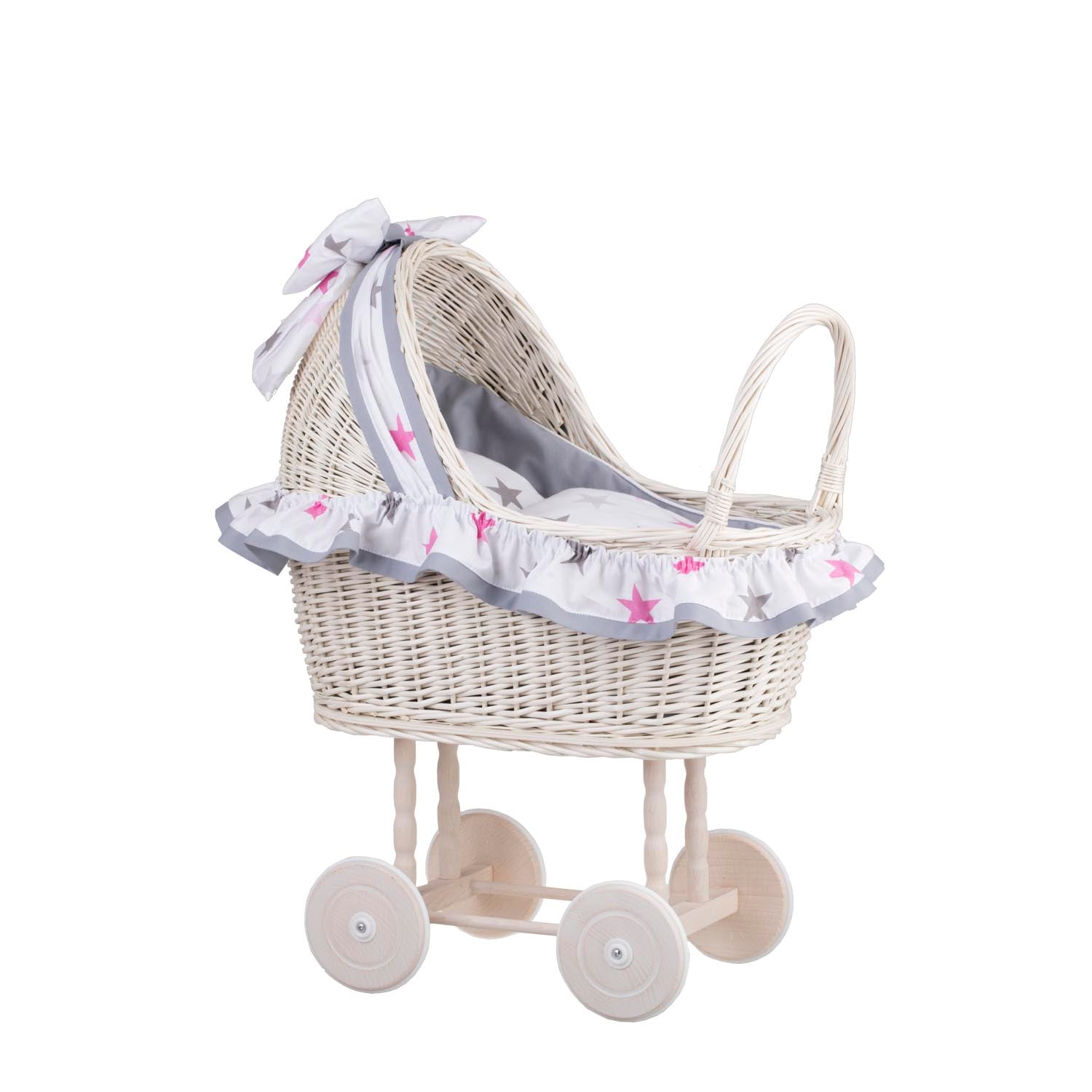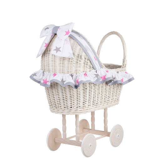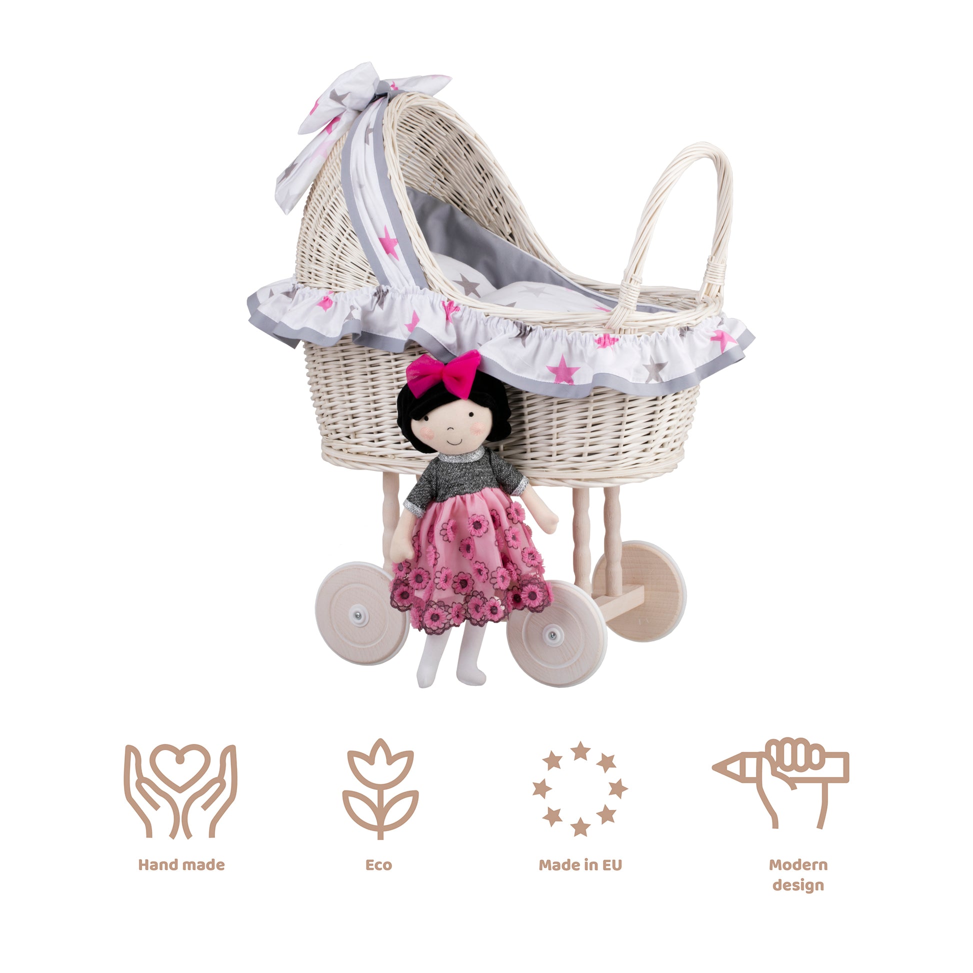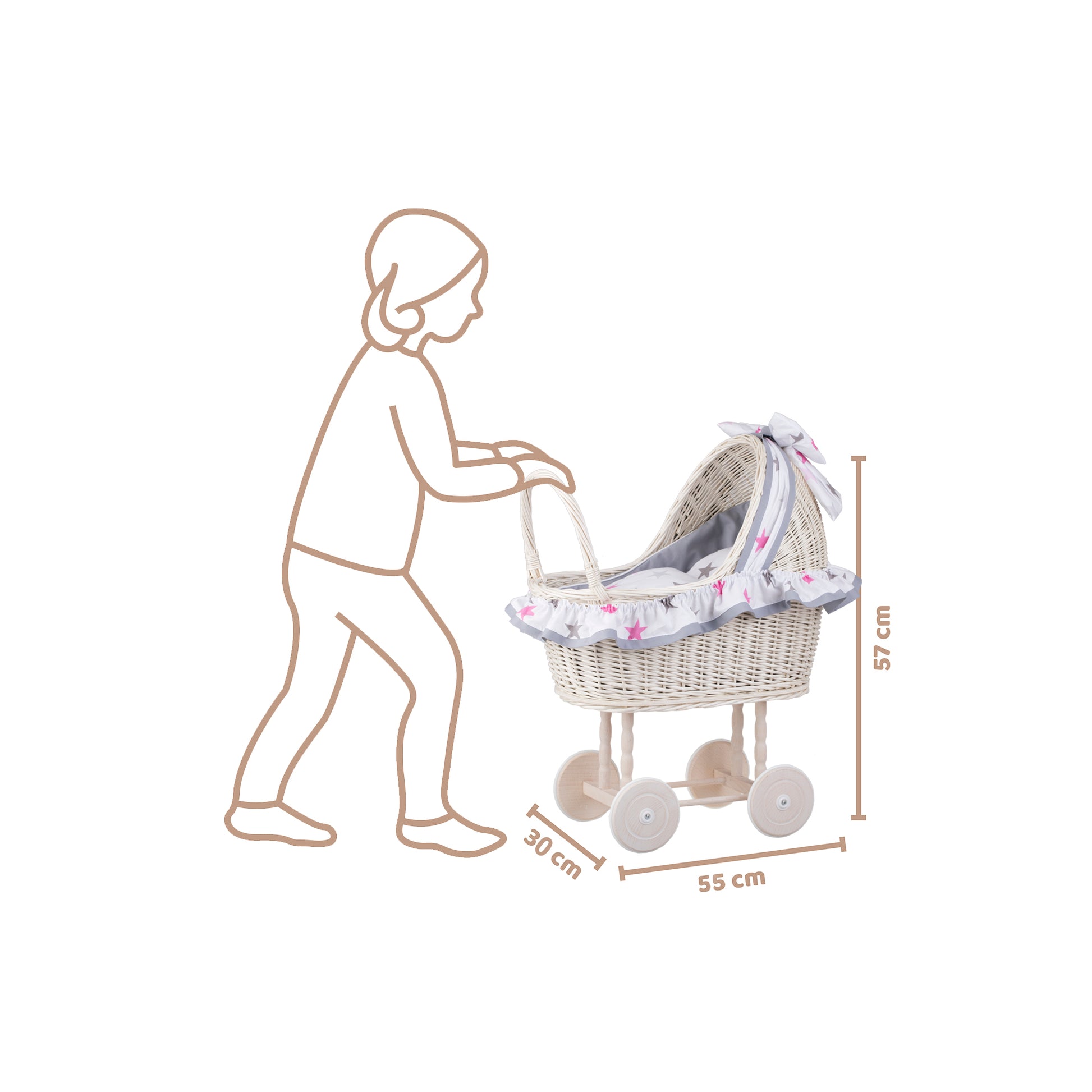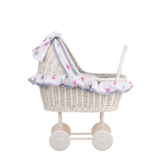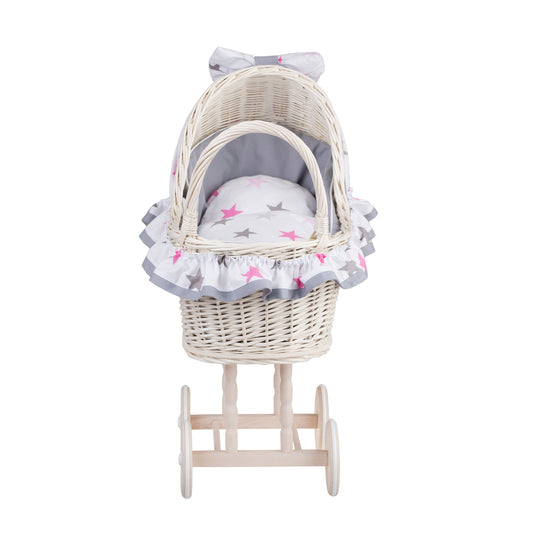 Lulu wiklinowy wózek dla lalek z szarym obszyciem, kołderką i poduszką TheWickerStories