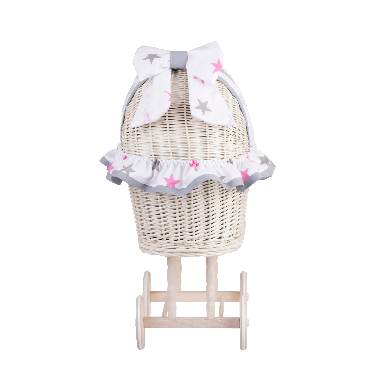 Wózek dla lalek z wikliny urzeka lekką, elegancką formą i dopracowanymi detalami. Gęsty, równy splot tworzy stabilny kosz z delikatnie uniesioną budką i miękko wykończonymi krawędziami, a u dołu spoczywa on na drewnianym podwoziu z toczonymi kółkami. Kremowe obszycie z falbanką oraz duże, dekoracyjne kokardy dodają mu uroku, czyniąc go ozdobą każdego dziecięcego pokoju.
